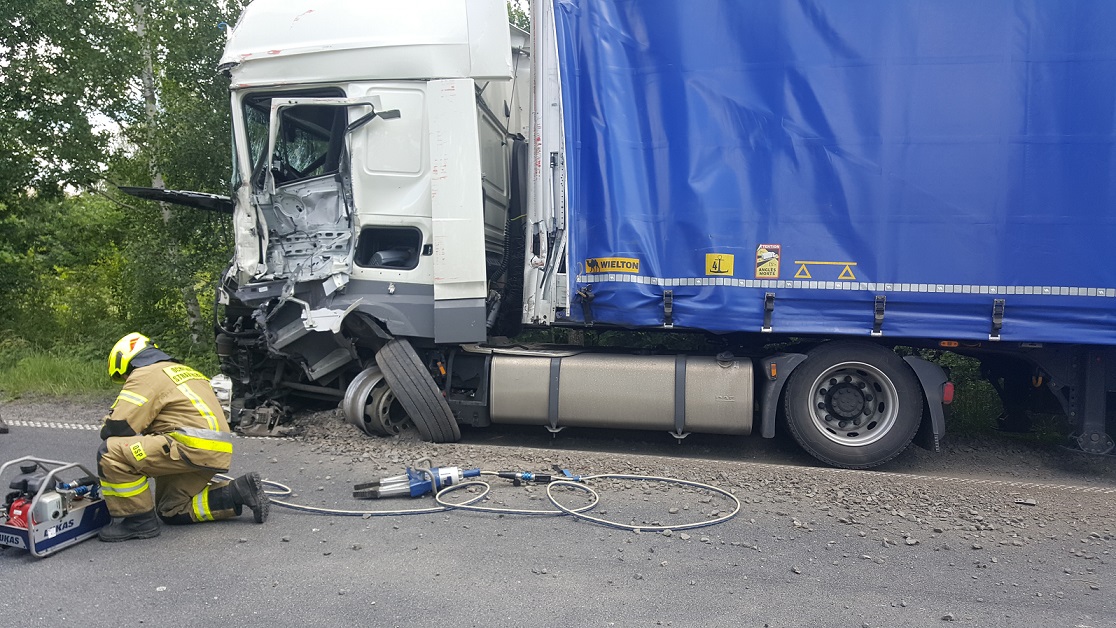 W dniu 14.06.2022r. o godz. 12:09 do Stanowiska Kierowania Komendanta Powiatowego PSP w Zgorzelcu wpłynęło zgłoszenie o zderzeniu dwóch pojazdów ciężarowych na drodze DW 354 pomiędzy miejscowościami Bogatynia i Sieniawka w wyniku którego, jedna osoba została uwięziona w pojeździe. Do zdarzenia natychmiast zadysponowano dwa zastępy z JRG Bogatynia oraz zastęp z OSP Sieniawka. Po przyjeździe na miejsce zdarzenia strażacy zabezpieczyli miejsce zdarzenia, udzieleniu pomocy medycznej kierującym pojazdami, odłączyli zasilanie w pojazdach oraz udzielili pomocy Policji w zakresie kierowania ruchem drogowym na wyłączonym odcinku drogi. Przybyły na miejsce zdarzenia zespół medyczny przetransportował do Szpitala w Zgorzelcu jednego z kierujących. Drugi z kierujących po przebadaniu pozostał na miejscu zdarzenia. Droga DW 354 była zablokowana przez blisko 8 godz.