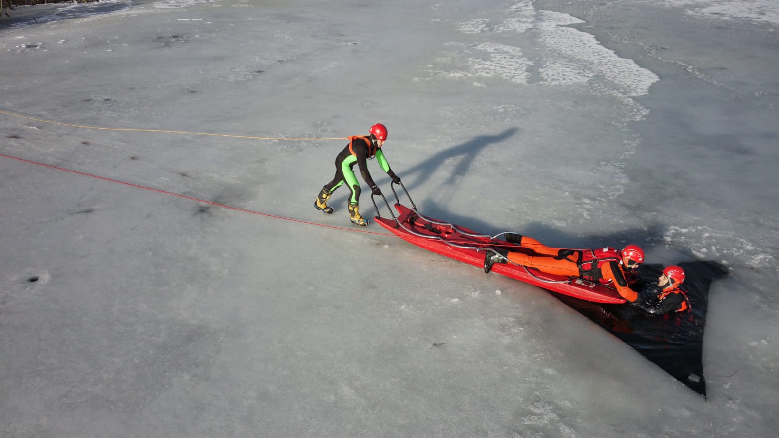 Ćwiczenia przeprowadzane są w bieżącym tygodniu na terenie stawu osadowego w Złotoryi, a ich podstawowym założeniem było doskonalenie technik wydobywania osób tonących z wody po załamaniu się tafli lodu. Strażacy z JRG wykorzystywali do działań neoprenowe skafandry wypornościowe, sanie lodowe oraz linki ratownicze.