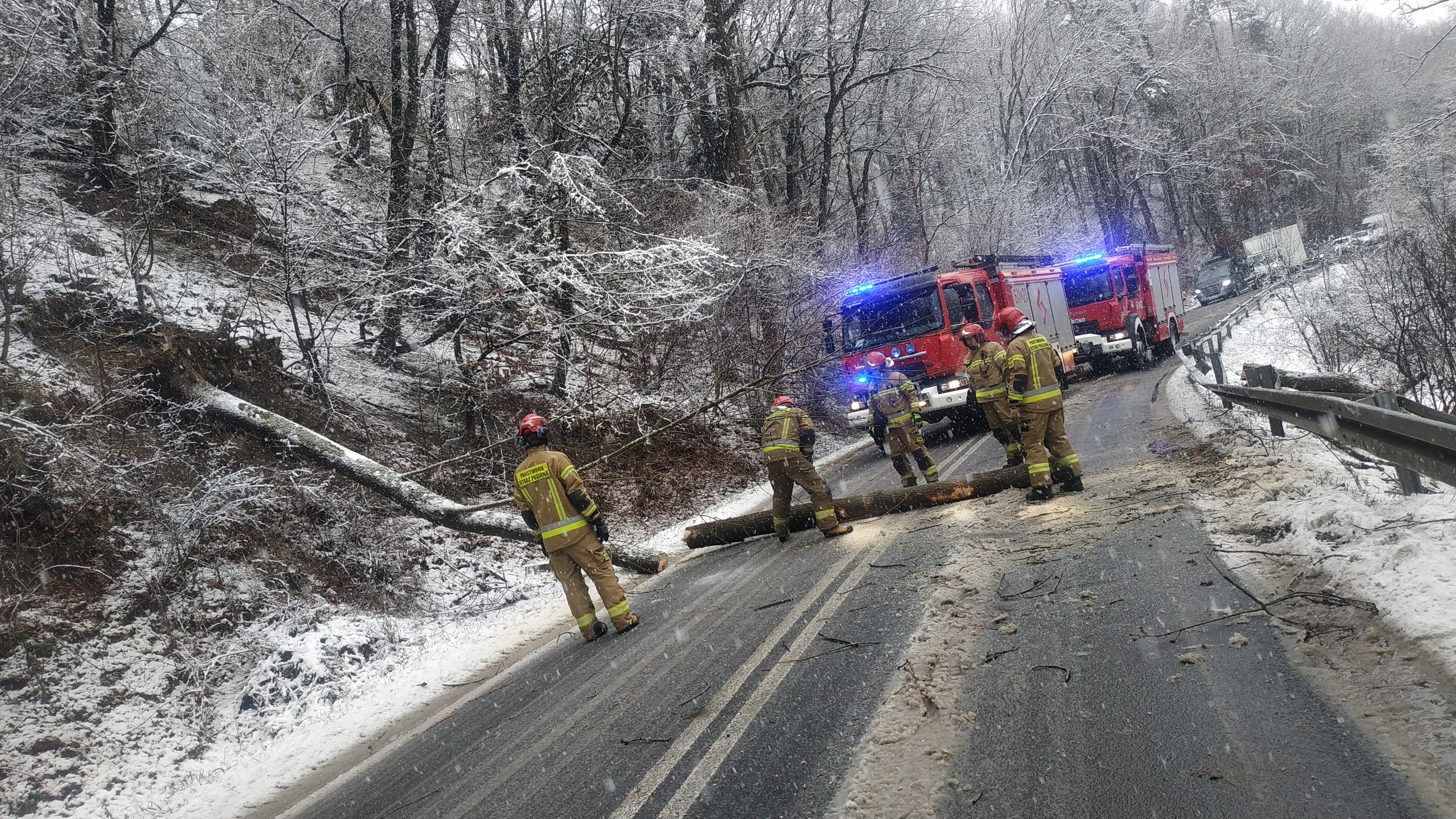 W dniu 13.03.2025 r. o godz. 13.53 do stanowiska kierowania KP PSP w Złotoryi wpłynęło zgłoszenie o uszkodzonym drzewie które spadło na przejeżdżający samochód. Po dojeździe na miejsce zdarzenia powierdzono treść zgłoszenia. Droga wojewódzka całkowice zablokowana. Działania strażaków polegały na zabezpieczeniu miejsca zdarzenia oraz usunięciu wiatrołomu z drogi. W zdarzeniu nikt nie odniósł obrażeń.