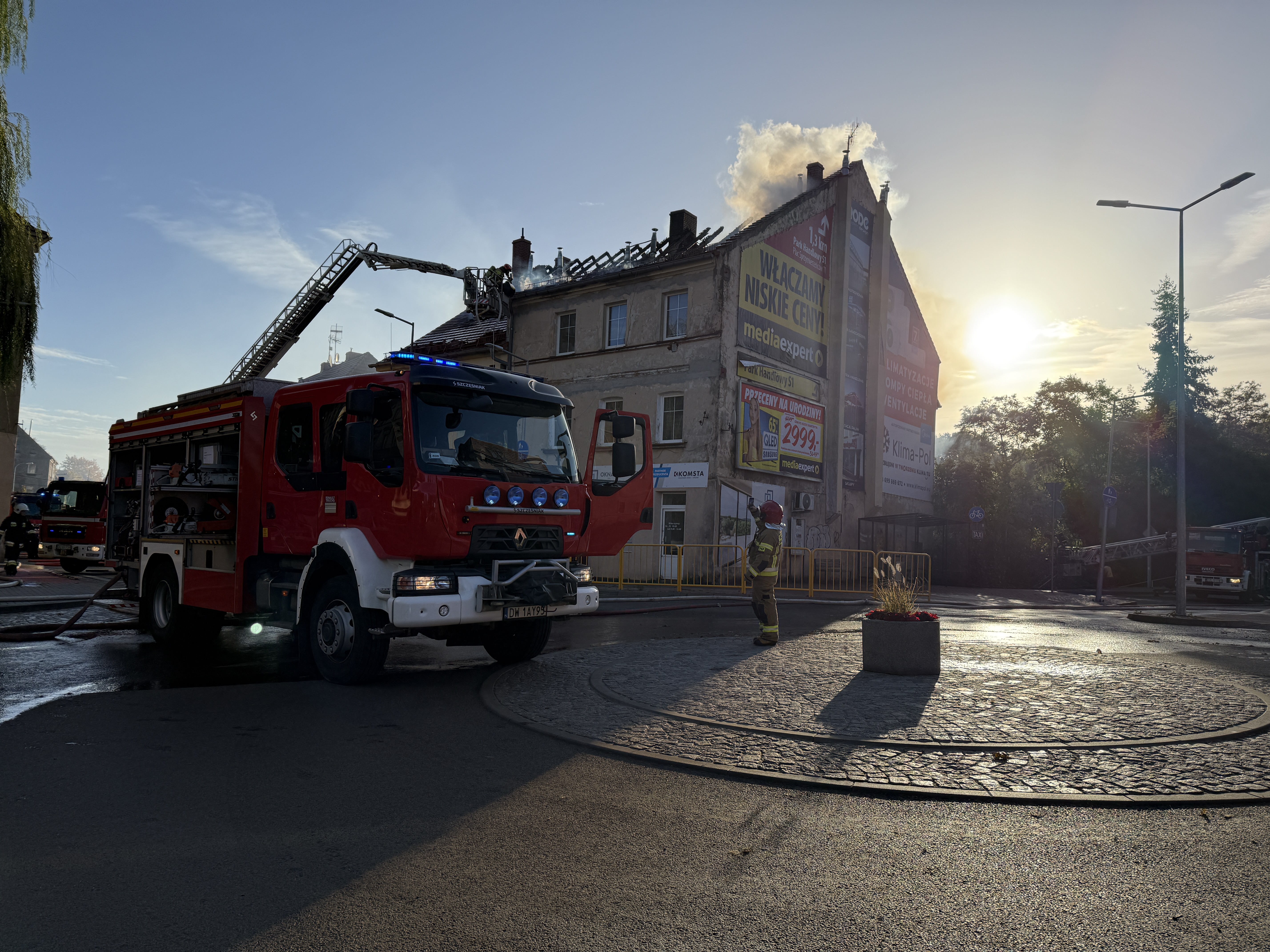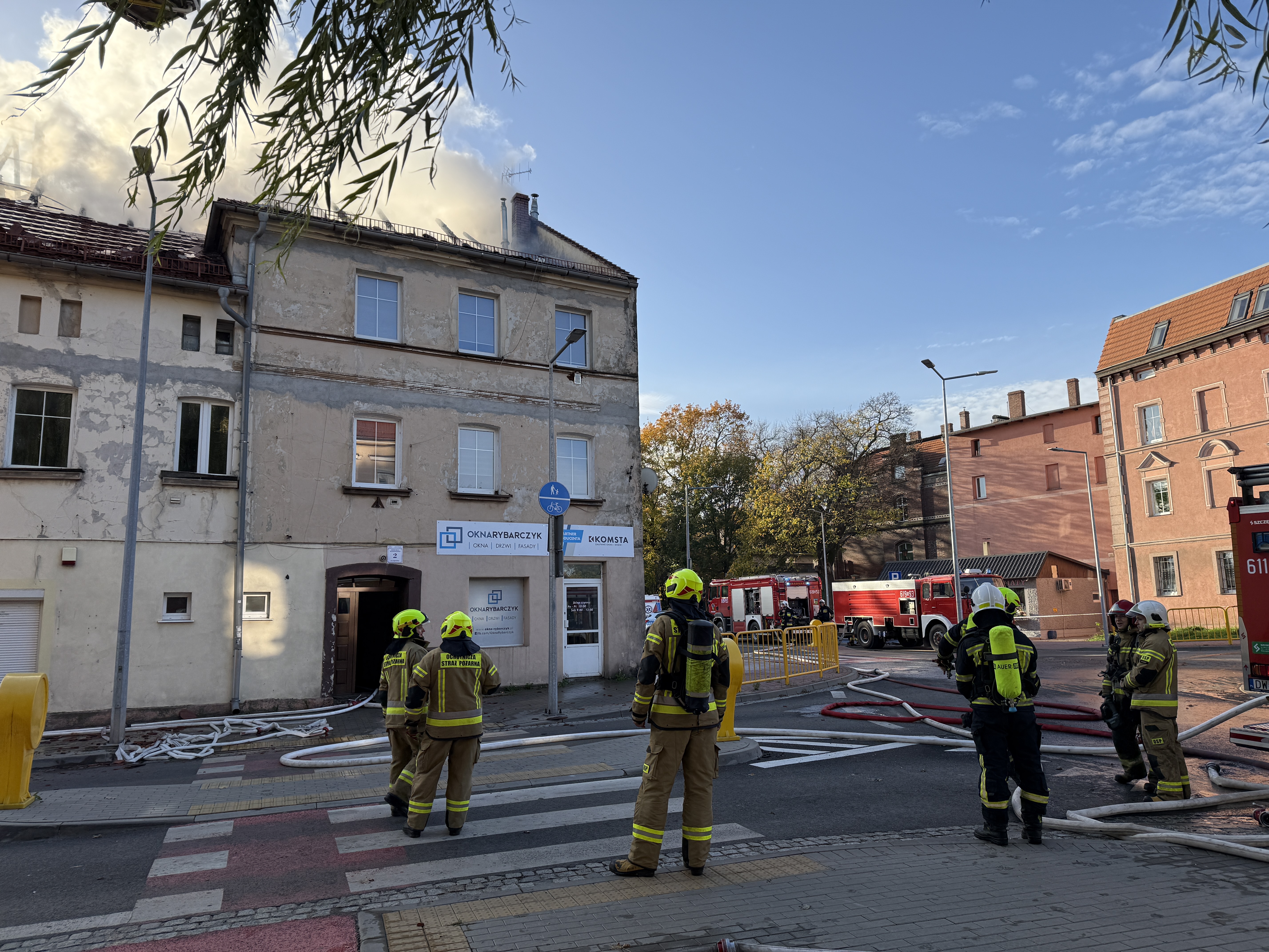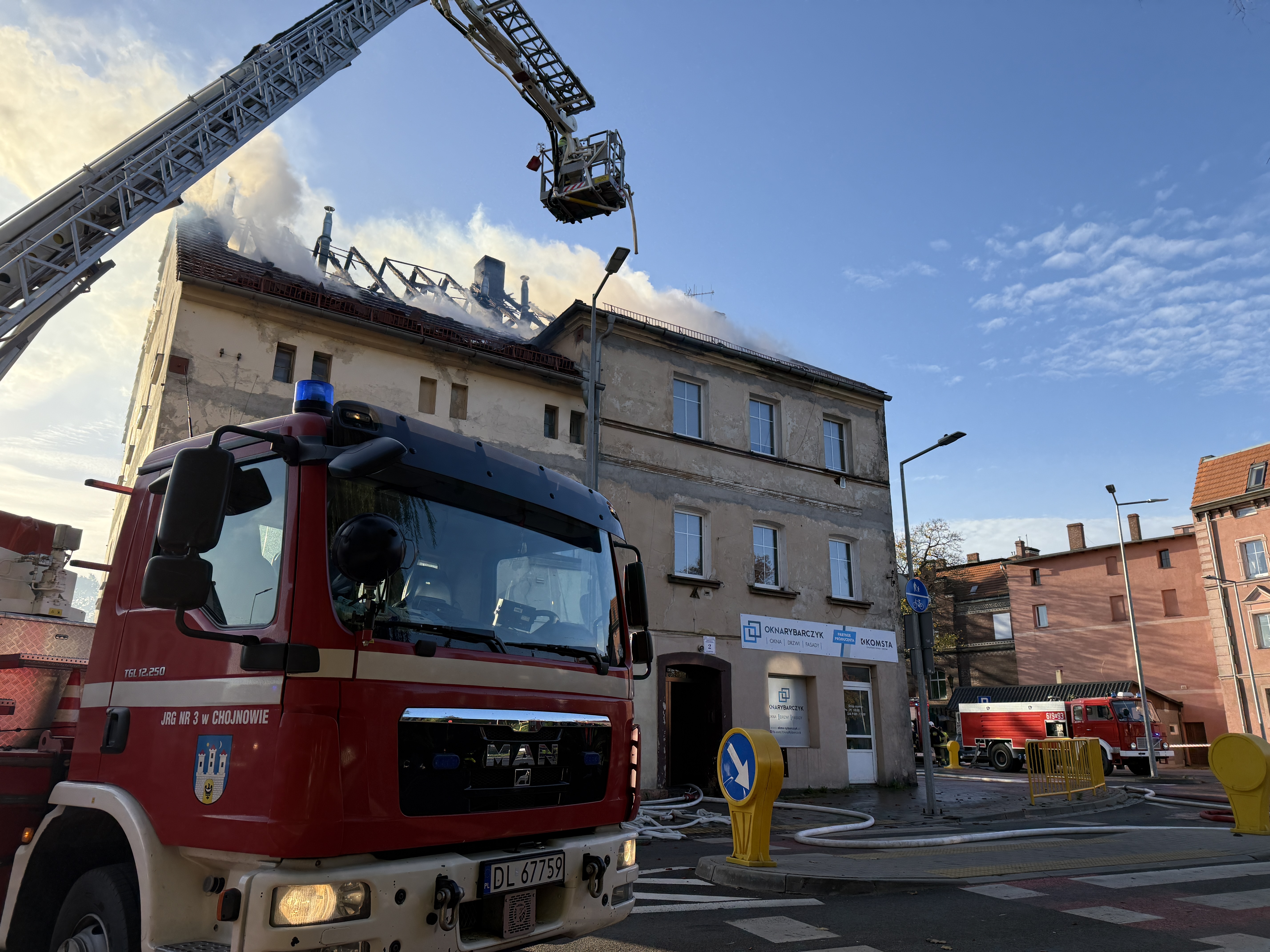 W dniu 14.10.2024 r. o godz. 8.01 dyżurny Stanowiska kierowania KP PSP w Złotoryi odebrał zgłoszenie o pożarze budynku wielorodzinnego w Złotoryi przy ul. Legnickiej. Po przybyciu na miejsce zdarzenia zastano pożar rozwinięty dachu w budynku. Działania strażaków polegały na zabezpieczeniu miejsca zdarzenia oraz podjęciu działań gaśniczych. Przed przybyciem straży pożarnej wszyscy mieszkańcy budynku (9 osób) ewakuowało się w bezpieczne miejsce. Strażakom udało się ewakuować z budynku trzy koty oraz psa. Podjęte działania gaśnicze między innymi z samochodu specjalnego oraz podnośnika pozwoliły ugasić pożar i zapobiec dużym stratom w mieniu. Dalsze działania ukierunkowane były na prace rozbiórkowe nadpalonych elementów dachu i poddasza. W działaniach udział wzięło 18 pojazdów straży pożarnej w tym jeden samochód z JRG z Chojnowa. W pożarze nikt nie odniósł obrażeń. Przyczyny oraz okoliczności zdarzenia ustala złotoryjska policja.