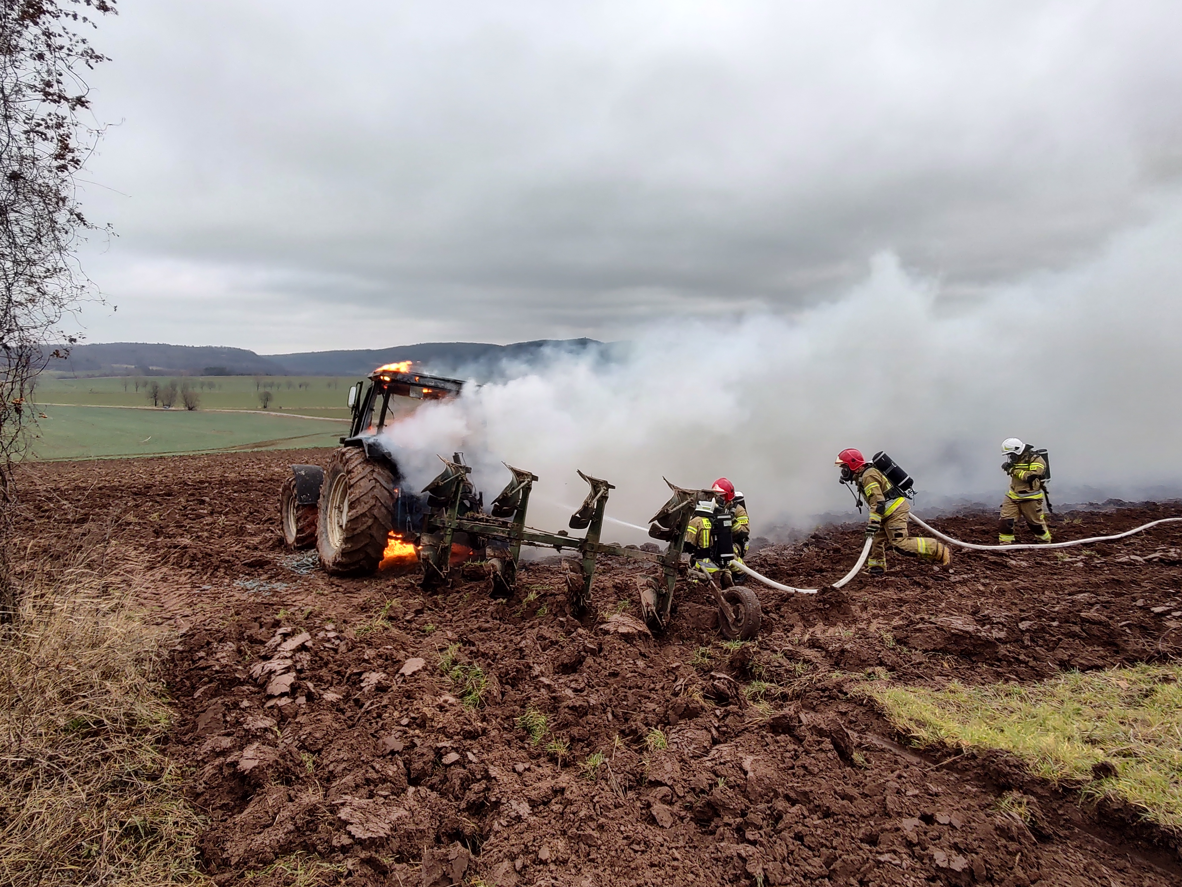 W dniu 18 grudnia br. ok godz. 11:27 w miejscowości Sokołowiec (gm. Świerzawa) doszło do pożaru ciągnika rolniczego. W związku z brakiem możliwości dojazdu do palącego się ciągnika ze względu na grząski i mokry teren, podjęto decyzję o rozwinięciu linii gaśniczej (ok.250m). Ratownicy w sprzęcie ochrony układu oddechowego podali prąd wody na palący się pojazd. Pożar zlokalizowano i ugaszono. W zdarzeniu brały udział zastępy z JRG w Złotoryi oraz OSP Sokołowiec. Przyczynę zdarzenia ustala złotoryjska Policja.