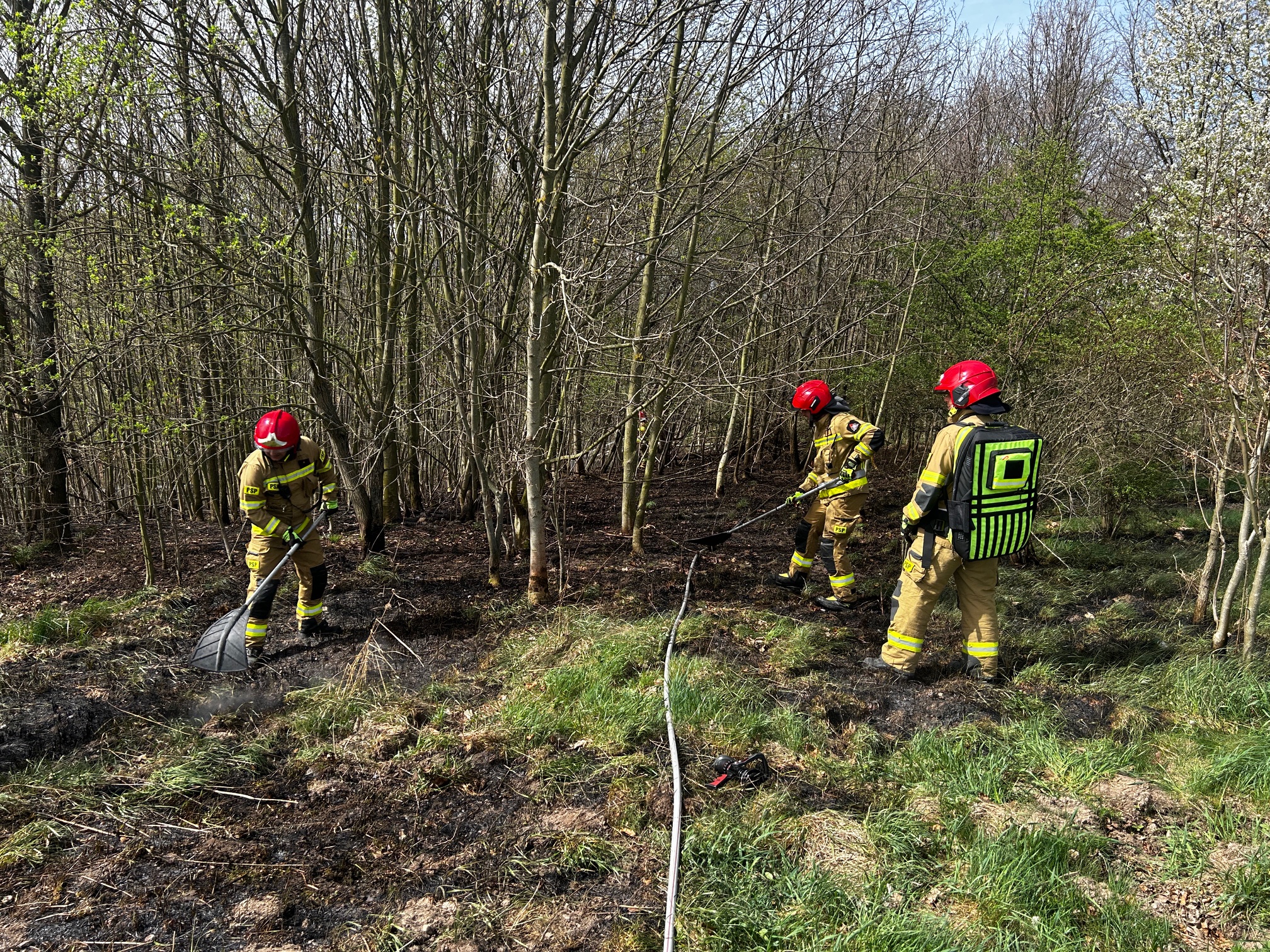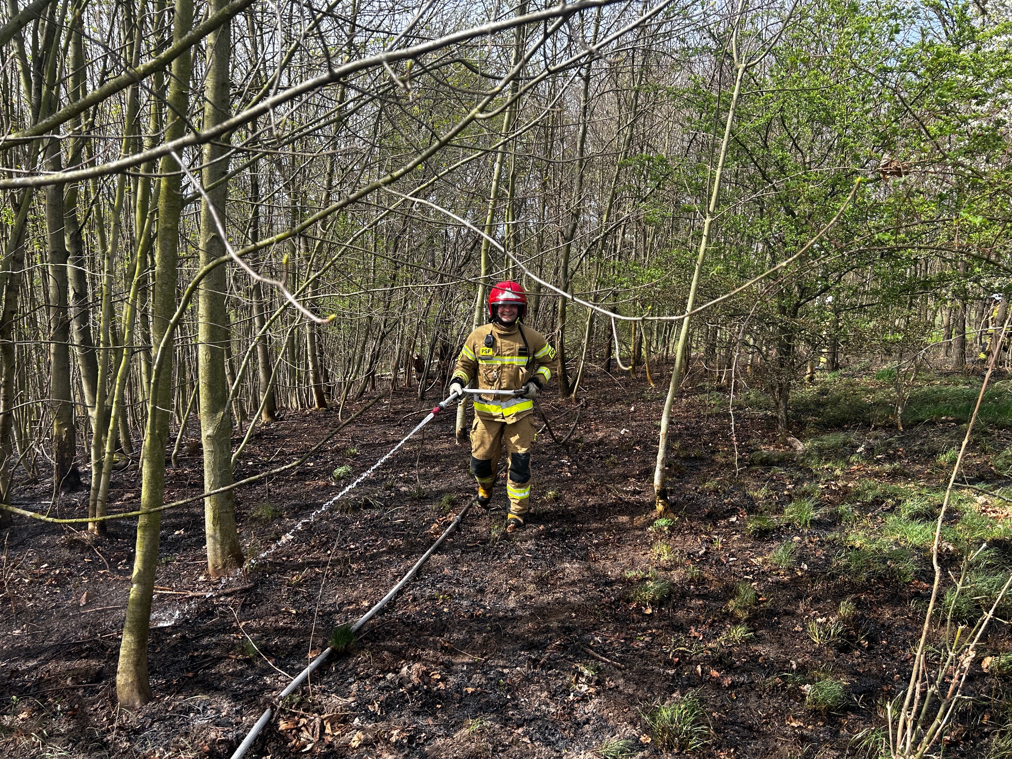 17.04.2025 roku w godzinach popołudniowych dyżurny Stanowiska Kierowania Komendanta Powiatowego PSP w Złotoryi otrzymał zgłoszenie o pożarze lasu w miejscowości Rząśnik. Po dojeździe stwierdzono, że pali się ok 30 arów poszycia leśnego. Pożar spowodowały iskry powstałe w wyniku powalenia drzewa na linię energetyczną. Działania strażaków polegały na ugaszeniu pożaru przy użyciu wody, przelewając całe pogorzelisko. Przybyłe na miejsce pogotowie energetyczne odłączyło zasilanie w linii przesyłowej co pozwoliło na bezpieczne usunięcie wiatrołomu.