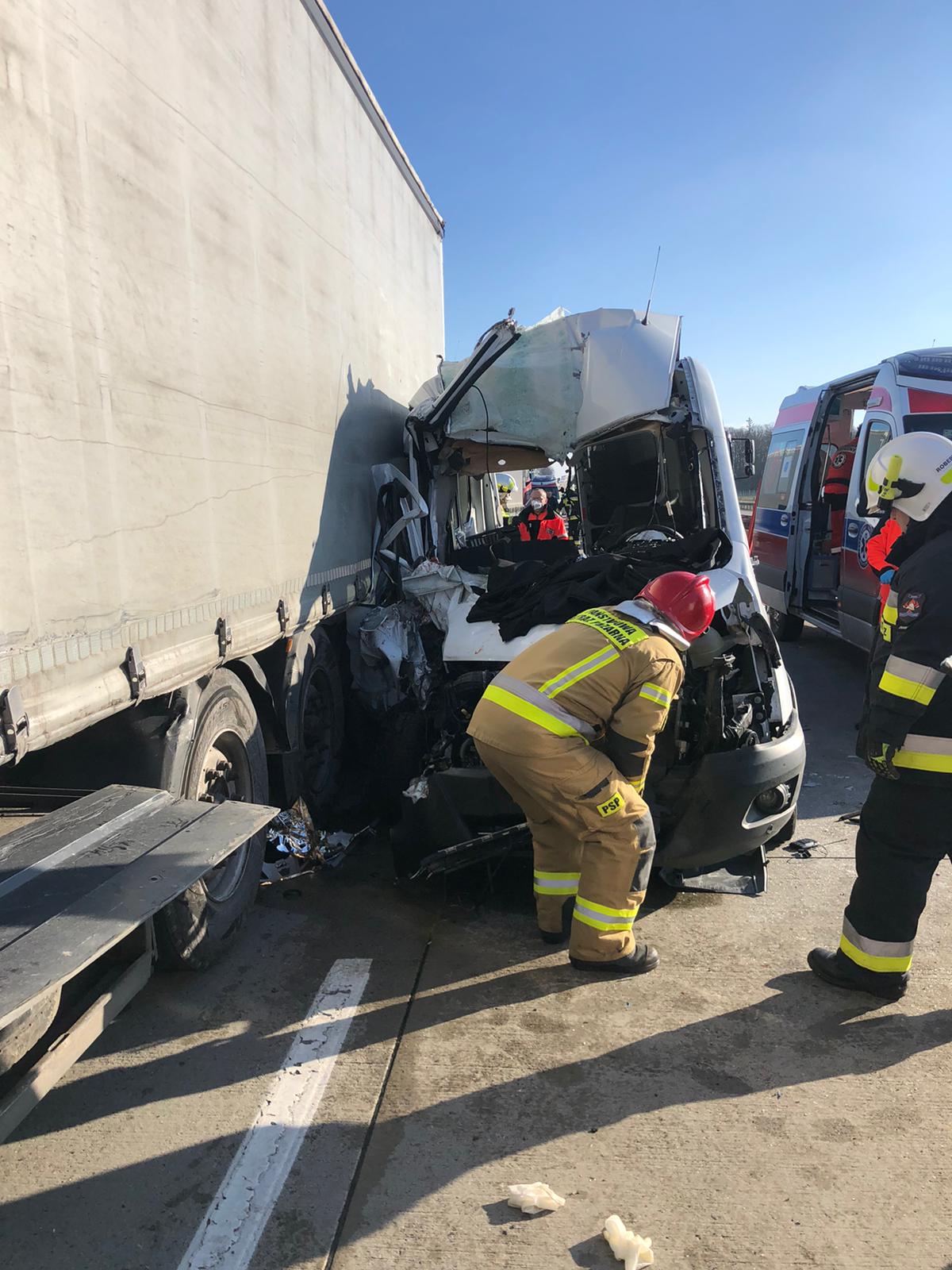 Po dojeździe na miejsce zdarzenia stwierdzono zderzenie samochodu osobowego (bus) oraz dwóch samochodów ciężarowych. We wraku samochodu osobowego znajdowała się osoba nieprzytomna, która ze względu na uszkodzone elementy karoserii wymagała ewakuacji przy użyciu sprzętu hydraulicznego. Niestety podjęte działania medyczne przez Zespół Ratownictwa Medycznego nie przyniosły oczekiwanego rezultatu w wyniku czego lekarz pogotowia stwierdził zgon. W trakcie prowadzonych działań ratowniczych druga z osób uczestnicząca w zdarzeniu ze względu na zgłaszane problemy zdrowotne została przetransportowana do szpitala. Na czas prowadzonych działań droga w kierunku granicy była całkowicie zablokowana.