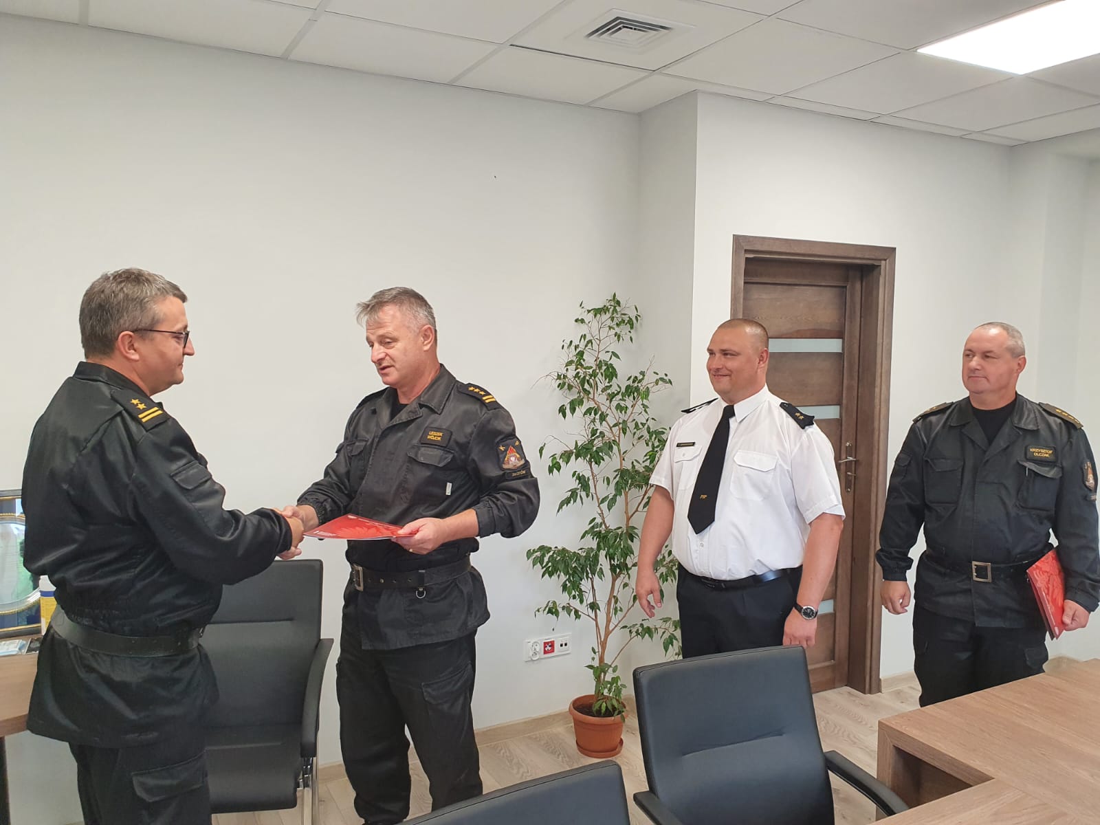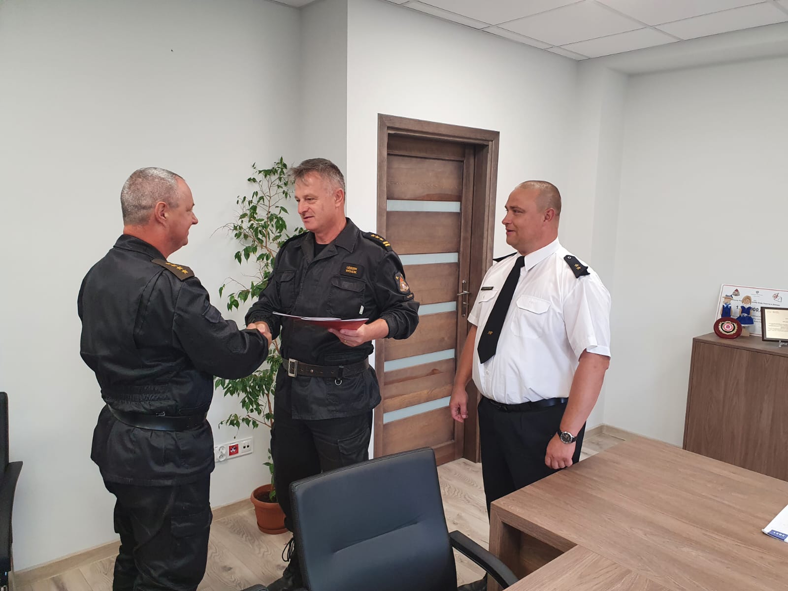 30.08 Komendant Powiatowy w Złotowie mł. kpt. Tomasz Lewandowski wraz z zastępcą Komendanta Powiatowego w Złotowie st. bryg. Leszkiem Wójcikiem wręczyli listy gratulacyjne za 30 lat służby bryg. Tomaszowi Manikowskiemu oraz st. kpt. Krzysztofowi Olczak. W swoim przemówieniu Komendant Powiatowy mł. kpt. Tomasz Lewandowski pogratulował trzydziestu lat służby ,życzył dużo zdrowia oraz zadowolenia z dalszej służby oraz jeszcze wielu lat współpracy.