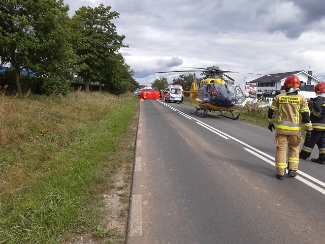 7 września 2020r. o godz. 11.31 do stanowiska kierowania komendanta powiatowego wpłynęło zgłoszenie o wypadku z udziałem dwóch motocyklistów i rowerzysty w m. Blękwit, na drodze wojewódzkiej nr 188. Do działań zadysponowano niezwłocznie zastępy z jednostki ratowniczo-gaśniczej wraz z grupą operacyjną oraz najbliższe jednostki ochotniczych straży pożarnych. Przybyłe zastępy udzieliły kwalifikowanej pierwszej pomocy trzem poszkodowanym osobom, które następnie zostały przekazane zespołom ratownictwa medycznego. Pomimo prowadzenia intensywnych medycznych działań ratowniczych, jedna osoba poniosła śmierć a kolejna z obrażeniami została zabrana do szpitala powiatowego. Po przeprowadzeniu czynności dochodzeniowych przez Policję pod nadzorem Prokuratora przywrócony został pełen ruch na danym odcinku drogi. W działaniach zaangażowane były trzy zastępy PSP oraz OSP Blękwit, OSP Święta, trzy zespoły ratownictwa medycznego w tym śmigłowiec Lotniczego Pogotowia Ratunkowego oraz służby Policji i Prokuratury Rejonowej.