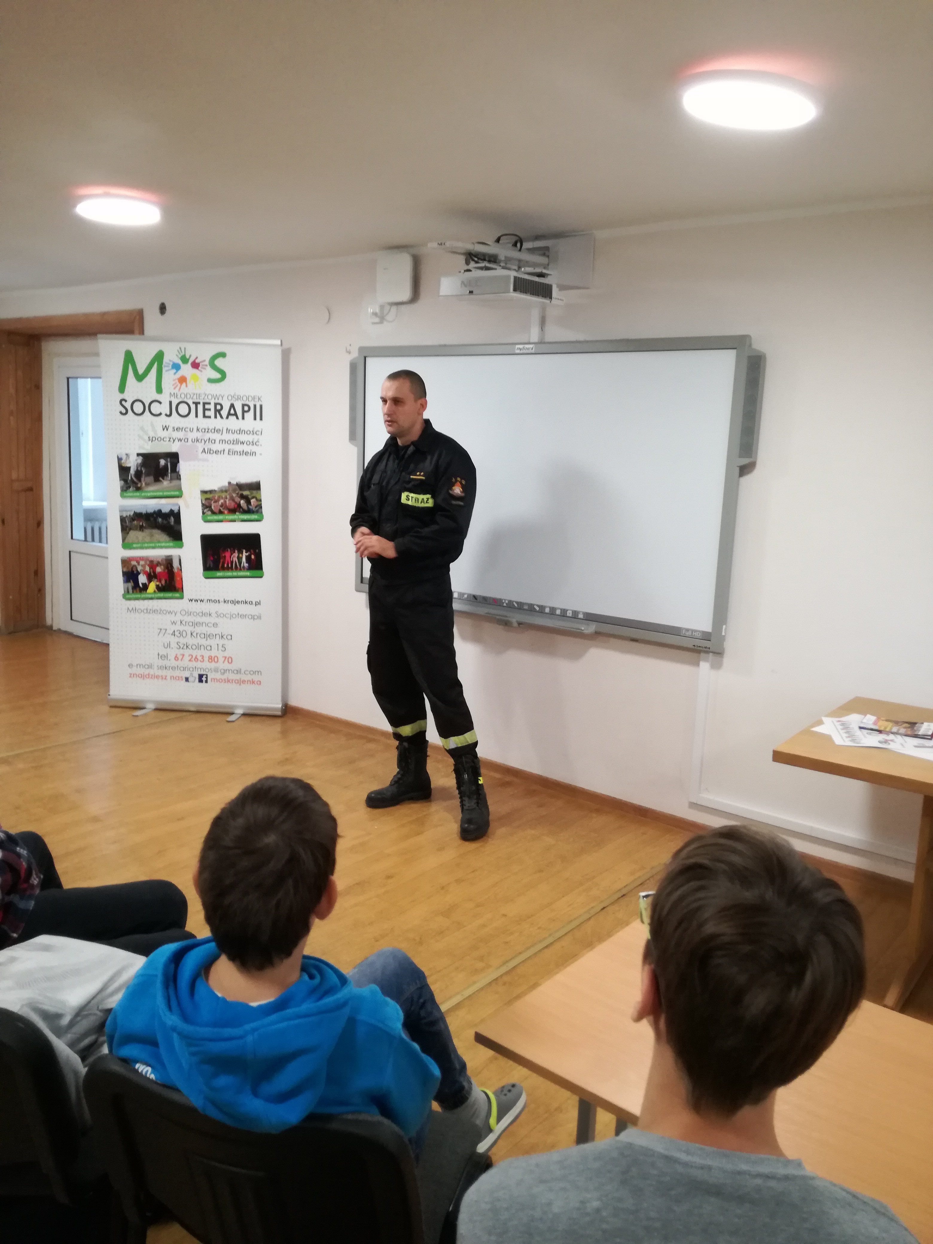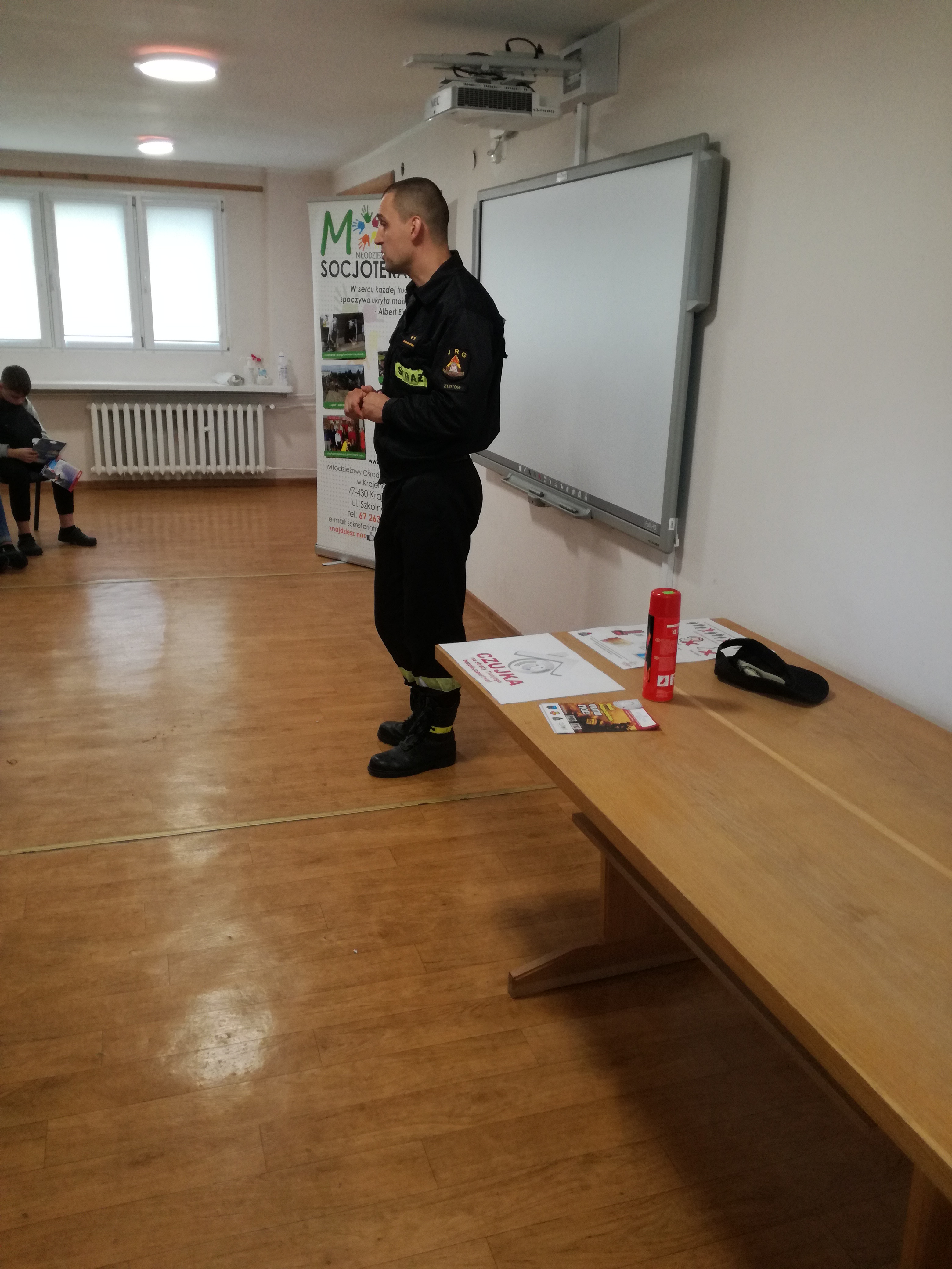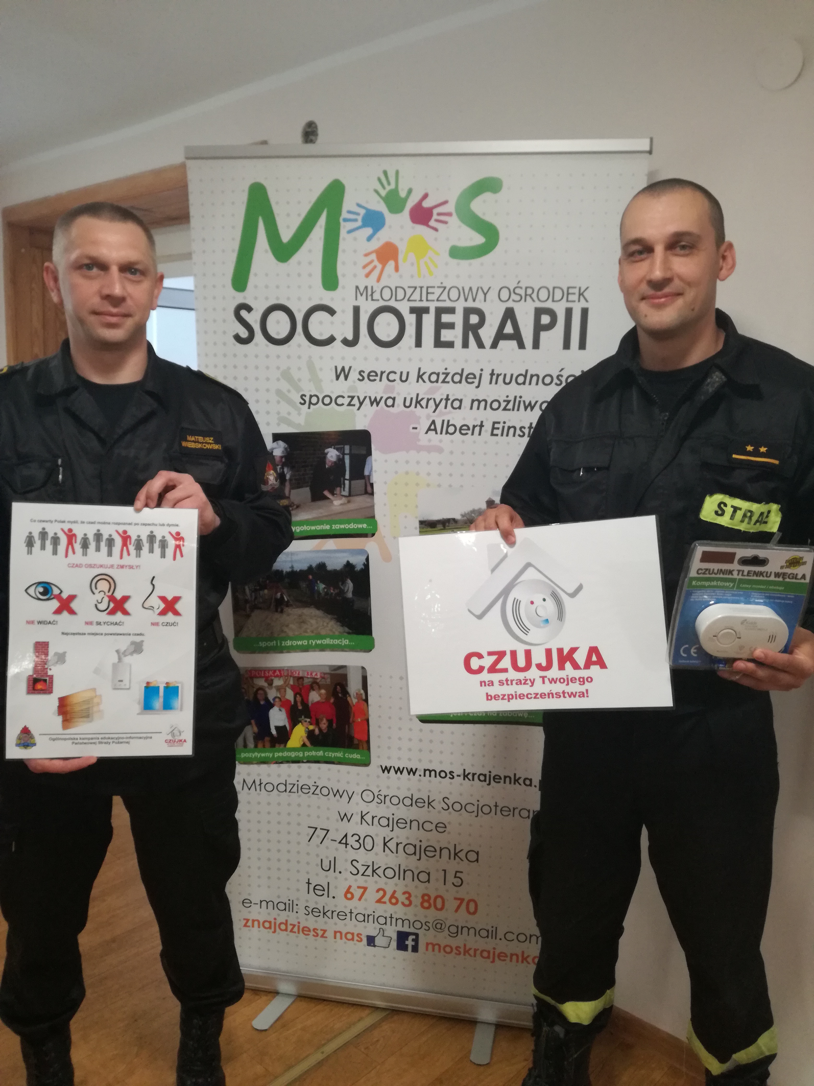 12.10.2021 Funkcjonariusze Komendy Powiatowej Państwowej Straży Pożarnej w Złotowie, kpt. Krzysztof Waldowski oraz mł.asp. Mateusz Wiebskowski odwiedzili Młodzieżowy Ośrodek Socjoterapii w Krajence. Celem wizyty funkcjonariuszy było przedstawienie zagrożeń związanych z tlenkiem węgla oraz przedstawienia zawodu strażaka. Podczas spotkania przedstawiono jaki wpływ na zdrowie człowieka ma tlenek węgla jakie są objawy zatrucia się oraz jak możemy ustrzec się przed zagrożeniem, przedstawiono czujki tlenku węgla wykrywające zagrożenie. Przedstawiono również zawód strażaka, omówiono między innymi w jaki sposób można zostać strażakiem i dlaczego warto nim zostać.