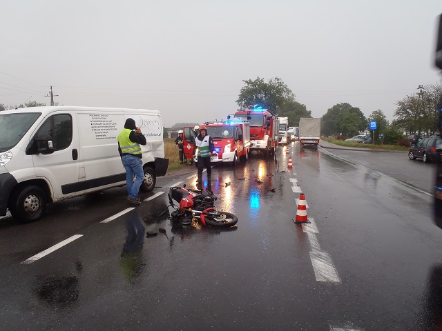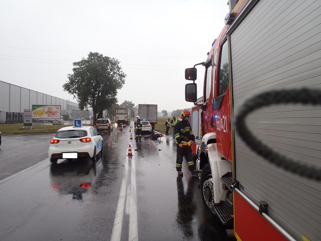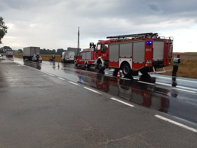Kilka minut przed godziną ósmą do Stanowiska Kierowania PSP w Złotowie wpłynęło zgłoszenie o zdarzeniu drogowym w miejscowości Jastrowie – kierunek Wałcz. Informacja dotyczyła zderzenia trzech pojazdów (motoroweru, dostawczaka i ciężarówki). Do miejsca zdarzenia skierowano pojazdy straży z Jastrowia i Złotowa wraz z grupą operacyjną komendy. W chwili przybycia służb kierujący byli poza swoimi pojazdami bez obrażeń. Jeden z pasów drogi krajowej zablokowany, na drugim odbywał się ruch wahadłowy. Zabezpieczono teren zdarzenia, rozpoznano przewożone ładunku pojazdami i po wykonanych czynnościach przez Policję usunięto rozlane płyny eksploatacyjne i pojazdy – przywrócono ruch na drodze.