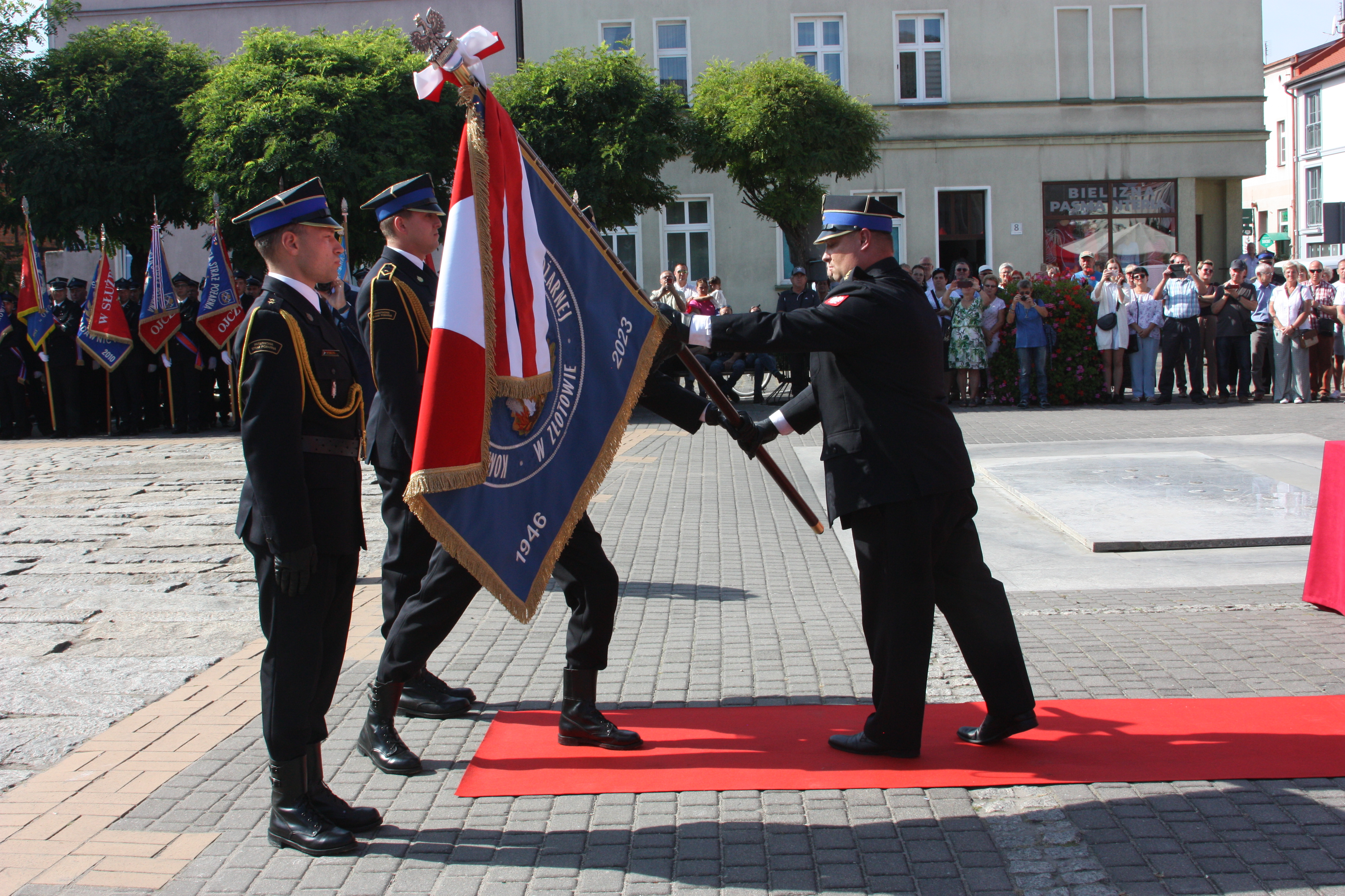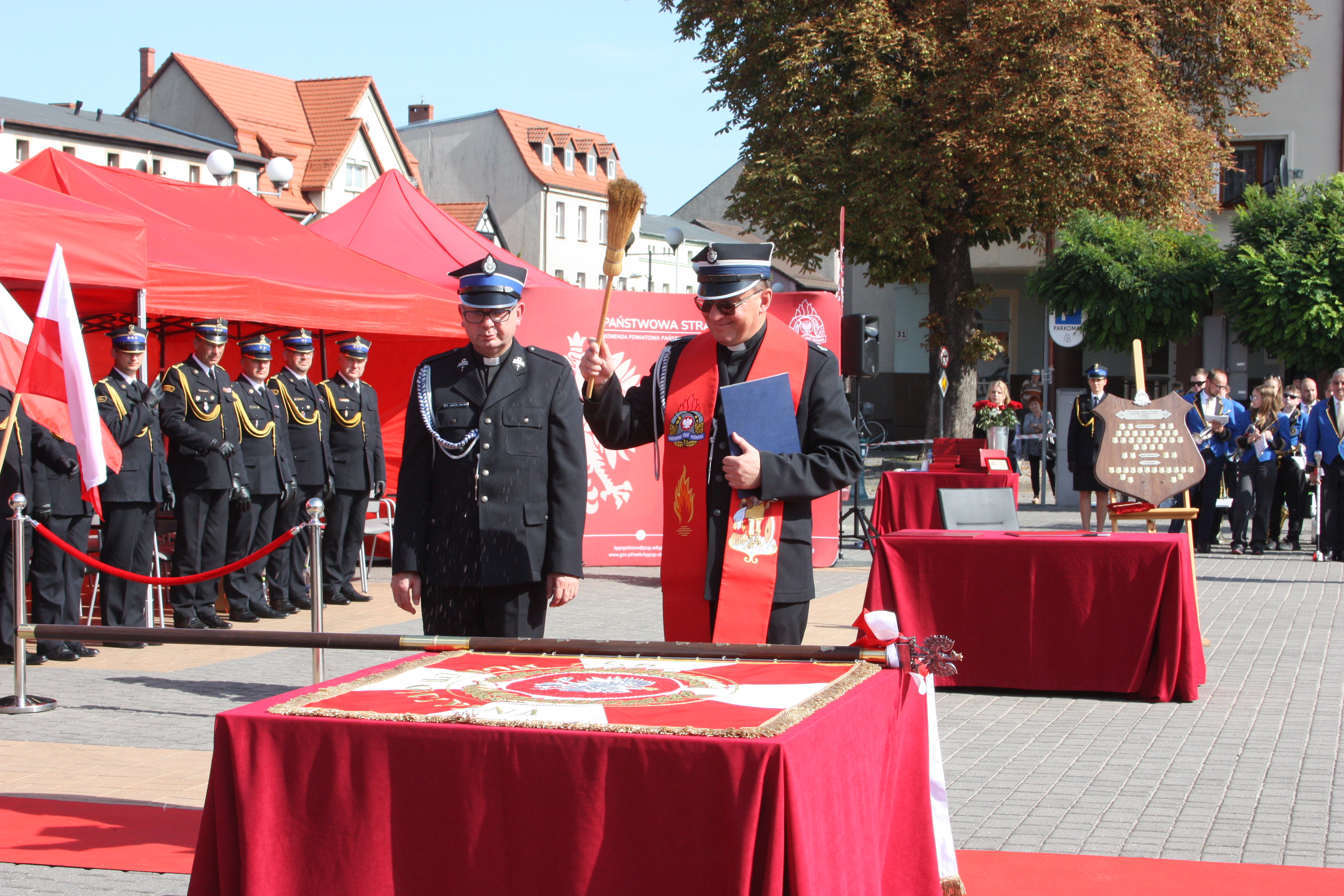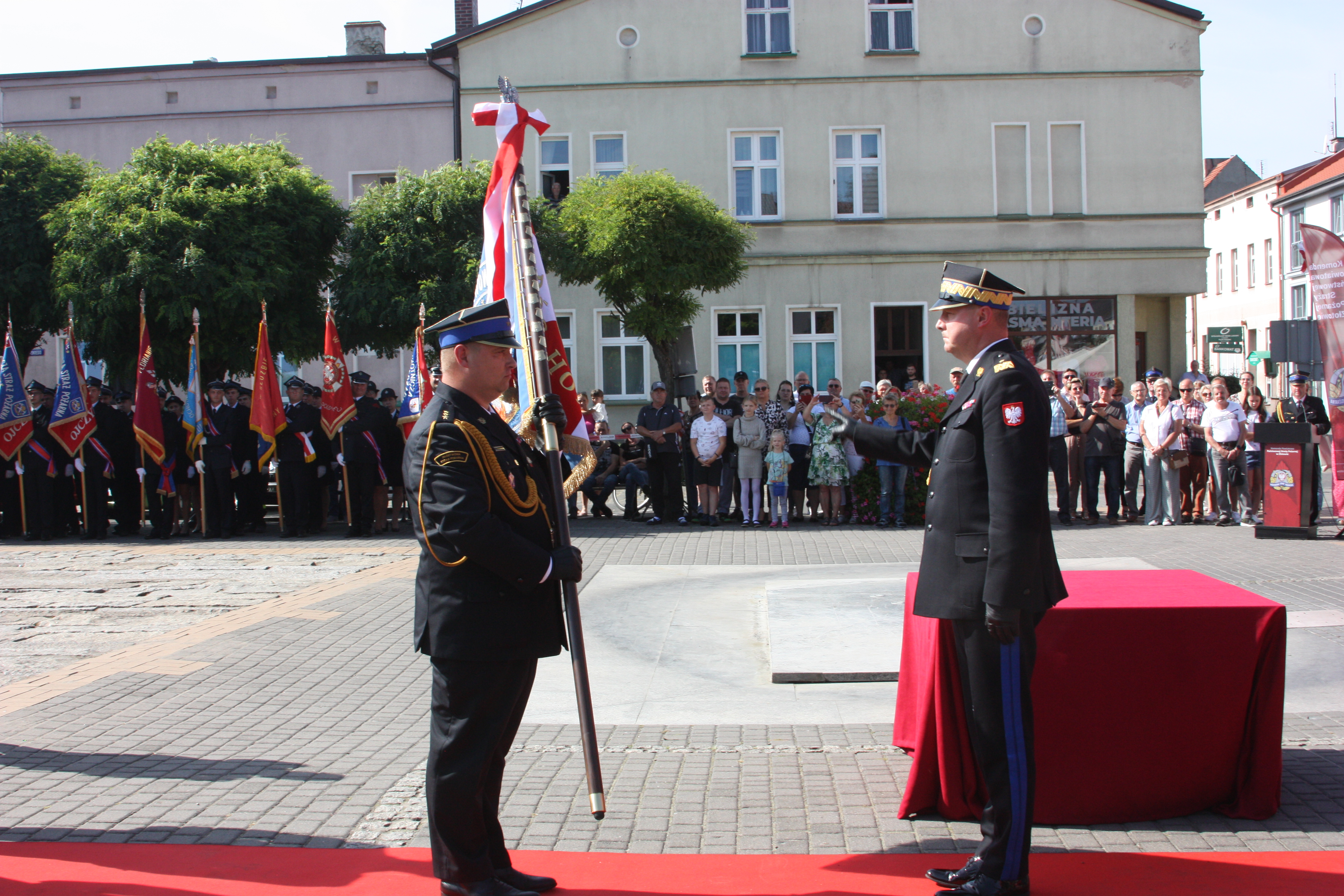 odebrał sztandar z rąk komendanta powiatowego PSP, a następnie dokonał jego prezentacji przed pododdziałami strażaków oraz zaproszonymi gośćmi.
