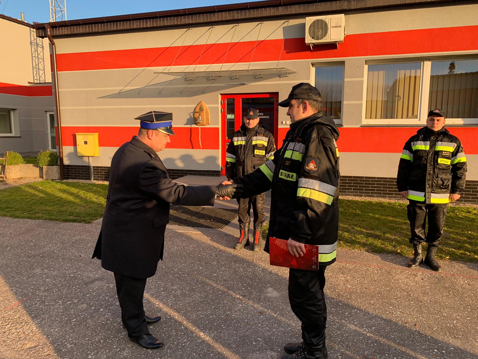 18 Listopada br. Komendant Powiatowy Państwowej Straży Pożarnej mł. kpt. Tomasz Lewandowski podczas uroczystej zmiany służby wręczył st. str. Piotrowi Żurkowi decyzje o przyznaniu nagrody z okazji Narodowego Święta Niepodległości oraz wzorowe wykonywanie obowiązków służbowych.