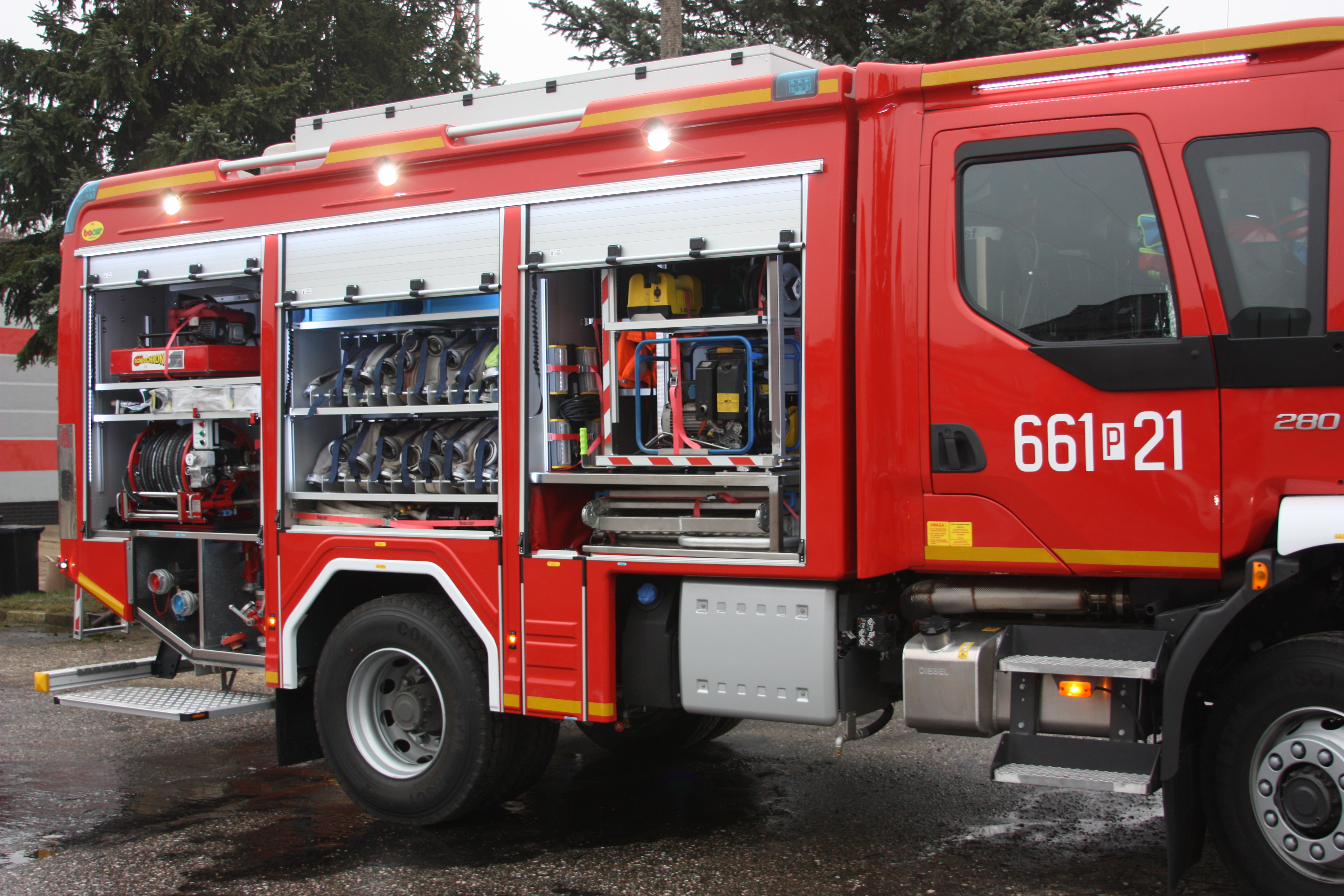 - Węże tłoczne są znacznie lżejsze – w wężach znajduje się piana sprężona wytworzona wewnątrz urządzenia a nie mieszanina wody ze środkiem pianotwórczym. Takie rozwiązanie powoduje, że nawet 1 ratownik jest wstanie przemieszczać się z linią gaśniczą.