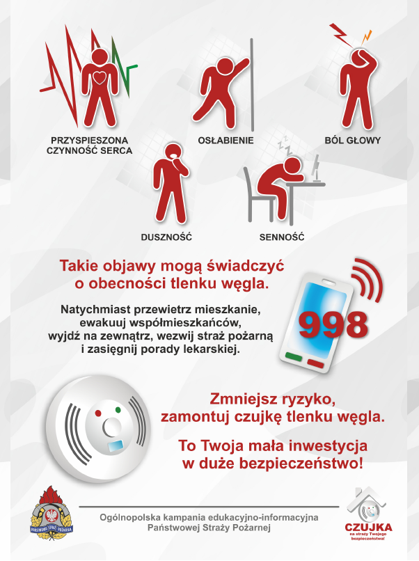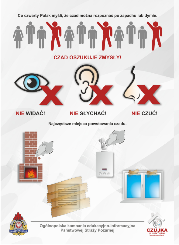 O zachowanie należytej staranności w zakresie eksploatacji systemów grzewczych w tym utrzymania we właściwym stanie technicznym przewodów kominowych - dymowych, spalinowych i wentylacyjnych. Należy również pamiętać o okresowych obowiązkach spoczywających na właścicielach, lokatorach, najemcach w zakresie okresowego czyszczenia tych przewodów przez uprawnione do tego służby kominiarskie. Dbajmy o własne zdrowie i życie umieszczając w naszych lokalach mieszkalnych zarówno czujki dymu, tlenku węgla i gazu. W razie zagrożenia, wystąpienia objawów wskazujących na możliwość zatrucia tlenkiem węgla i w chwili uruchomienia się czujki nie zwlekajmy, wzywajmy służby ratownicze, opuśćmy jak najszybciej swoje mieszkanie, powiadamiajmy sąsiadów o niebezpieczeństwie, a wspólnie unikniemy tragedii.