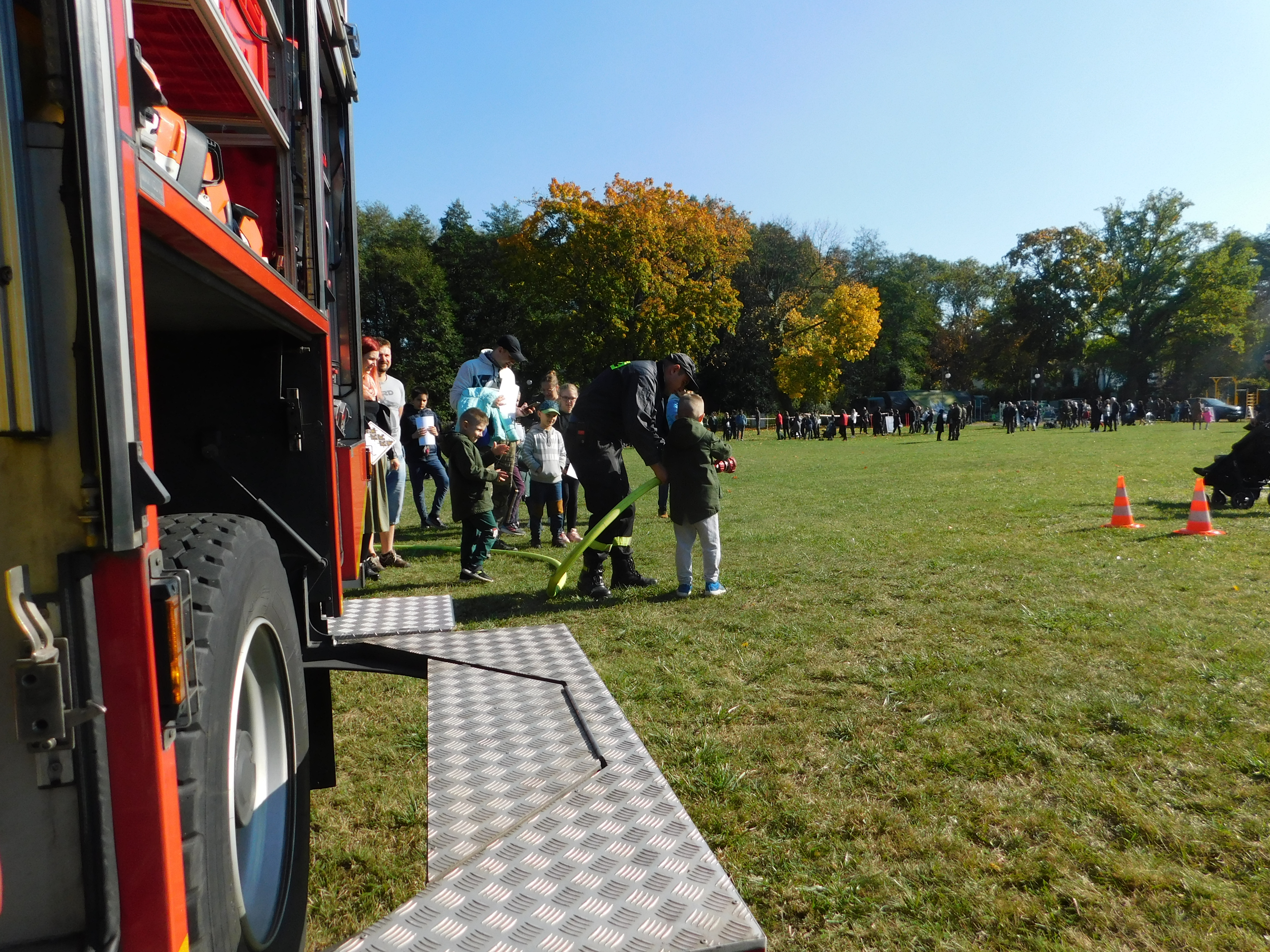 Najmłodsi goście wydarzenia mieli okazję poczuć się jak prawdziwi strażacy, uczestnicząc w konkurencji kierowania prądu gaśniczego do celu.