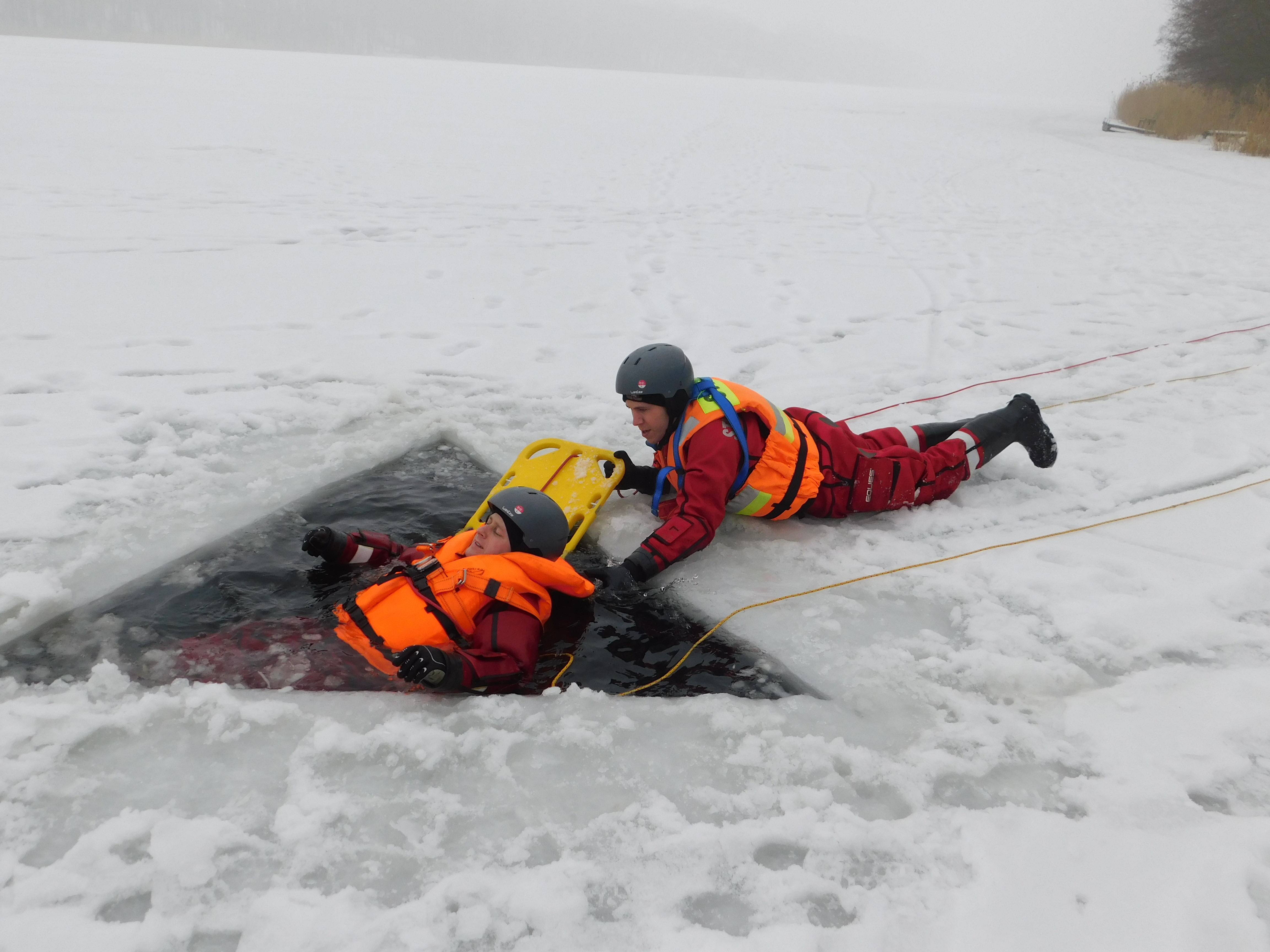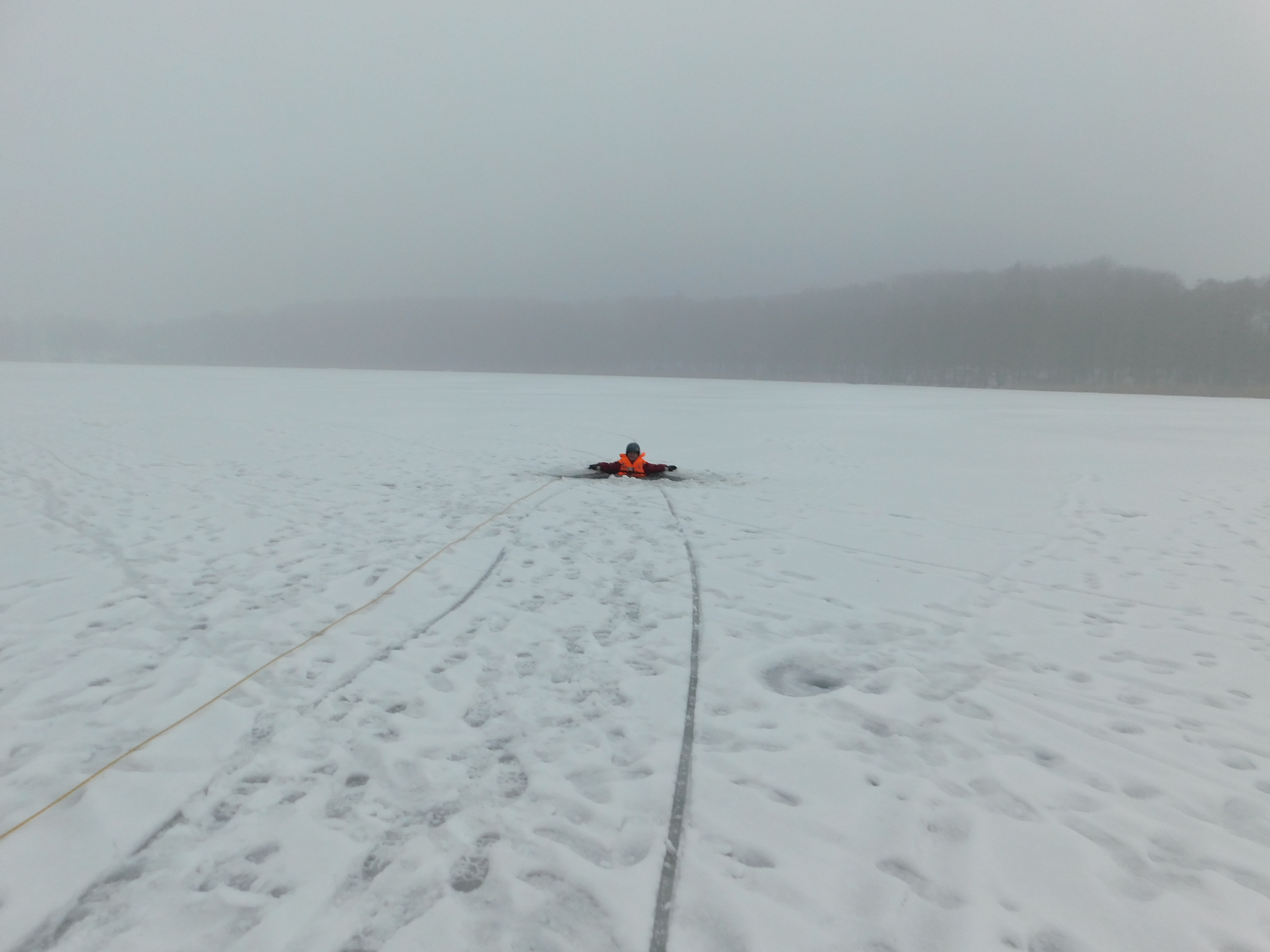 W ramach prowadzonych zajęć doskonalenia zawodowego w m-cu lutym zmiany służbowe jednostki ratowniczo-gaśniczej złotowskiej komendy powiatowej PSP, uwzględniając aktualnie panujące warunki atmosferyczne przeprowadzają cykliczne ćwiczenia na zbiornikach wodnych, gdzie realizują i ćwiczą różne techniki dotarcia do osób poszkodowanych i ich ewakuacji z pokrywy lodowej bądź bezpośrednio z przerębli i pęknięć powstałych na zamarzniętych akwenach.