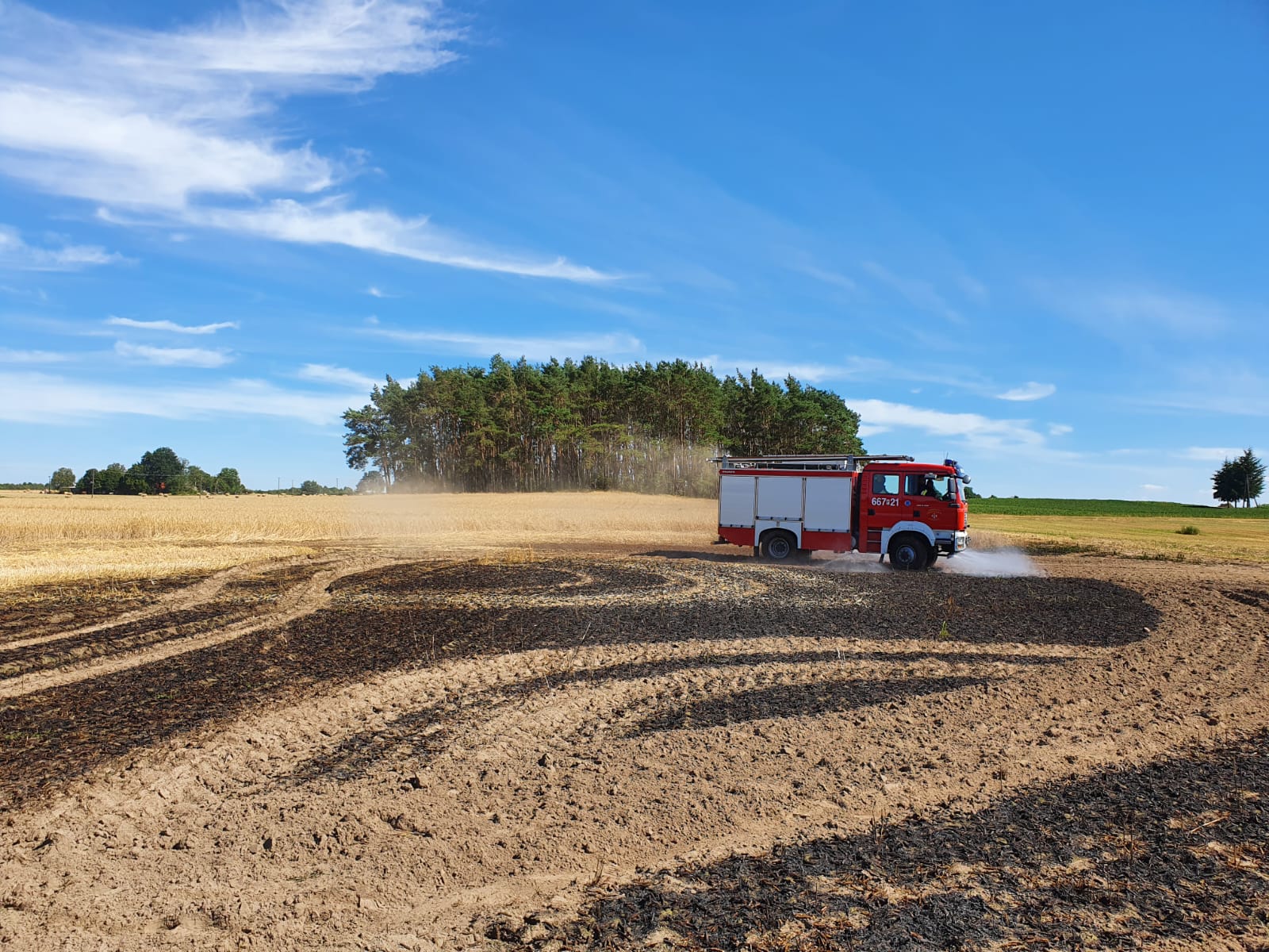Dnia 2 sierpnia 2022 r. do Stanowiska Kierowania Komendanta Powiatowego w Złotowie wpłynęły trzy zgłoszenia o pożarach. Pierwsze dotyczyło palącego się ścierniska w pobliżu miejscowości Kamień, następne - pożaru zboża na pniu w miejscowości Podróżna. Ostatnie zgłoszenie to pożar kombajnu zbożowego na drodze powiatowej. Do zdarzeń zadysponowano odpowiednie siły i środki, które z pomocą rolników z maszynami rolniczymi sprawnie i szybko ugasiły pożary, minimalizując straty. W działaniach ratowniczych zaangażowanych było łącznie 14 zastępów PSP i OSP z terenu powiatu złotowskiego, w obsadzie 48 strażaków.
