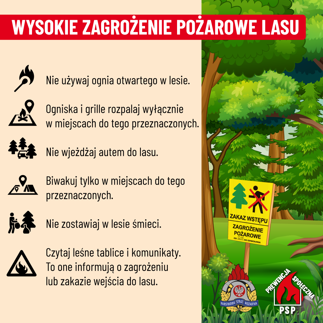 Aktualnie panujące warunki atmosferyczne w tym zmienne porywiste wiatry, niewystarczające opady deszczu, niska wilgotność ściółki, wysokie temperatury powietrza, powodują, że odnotowywane jest duże zagrożenie pożarowe w obrębie kompleksów leśnych. Już tylko w roku bieżącym na terenie powiatu złotowskiego odnotowano 10 pożarów właśnie w lasach.