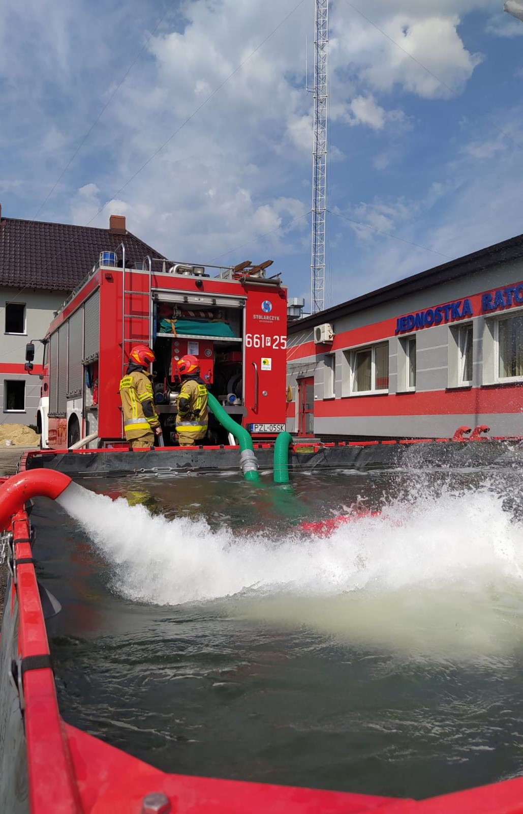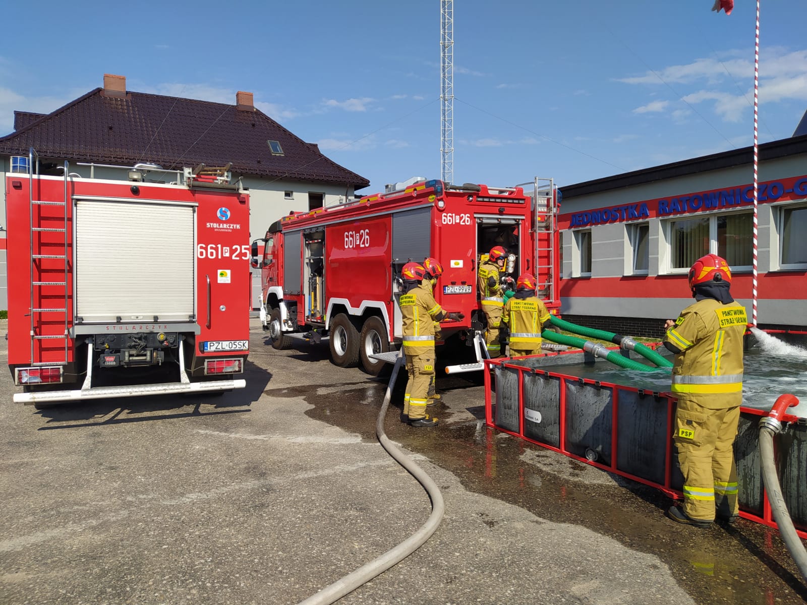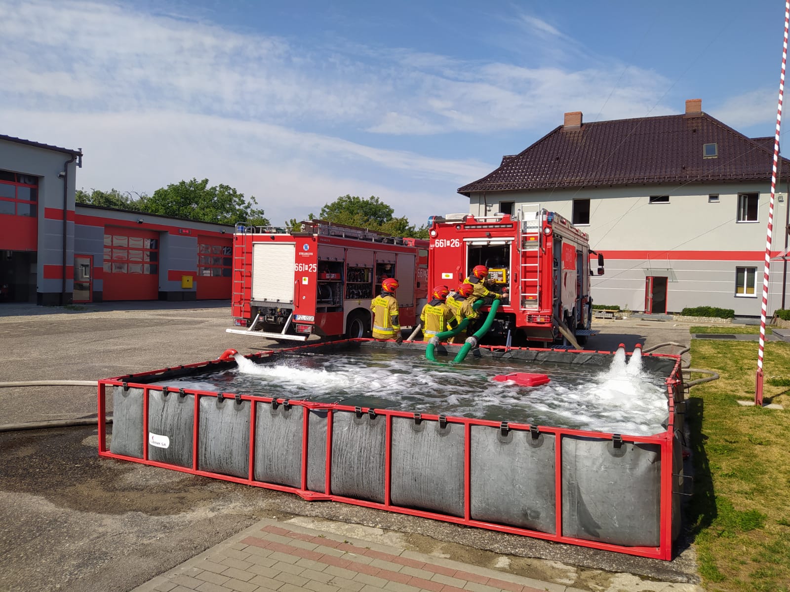 W ramach zajęć doskonalenia zawodowego strażacy z Jednostki Ratowniczo-Gaśniczej w Złotowie w dniach 17-19 sierpnia br. przeprowadzili praktyczne zajęcia szkoleniowe w zakresie obsługi autopomp pożarniczych obejmujące m.in. pobierania wody z zewnętrznego źródła, podawanie wody liniami wężowymi oraz istotne elementy prawidłowej pracy operatora sprzętu zgodnie z sadami BHP. Do ćwiczeń wykorzystano m.in. ciężkie samochody ratowniczo-gaśnicze GCBA oraz szybkorozstawialny przenośny zbiornik na wodę o pojemności 20m3, który stanowi zarazem istotny element podczas prowadzenia działań ratowniczych, jako bufor zapewniający dodatkową rezerwę środka gaśniczego w ramach organizacji zaopatrzenia wodnego.