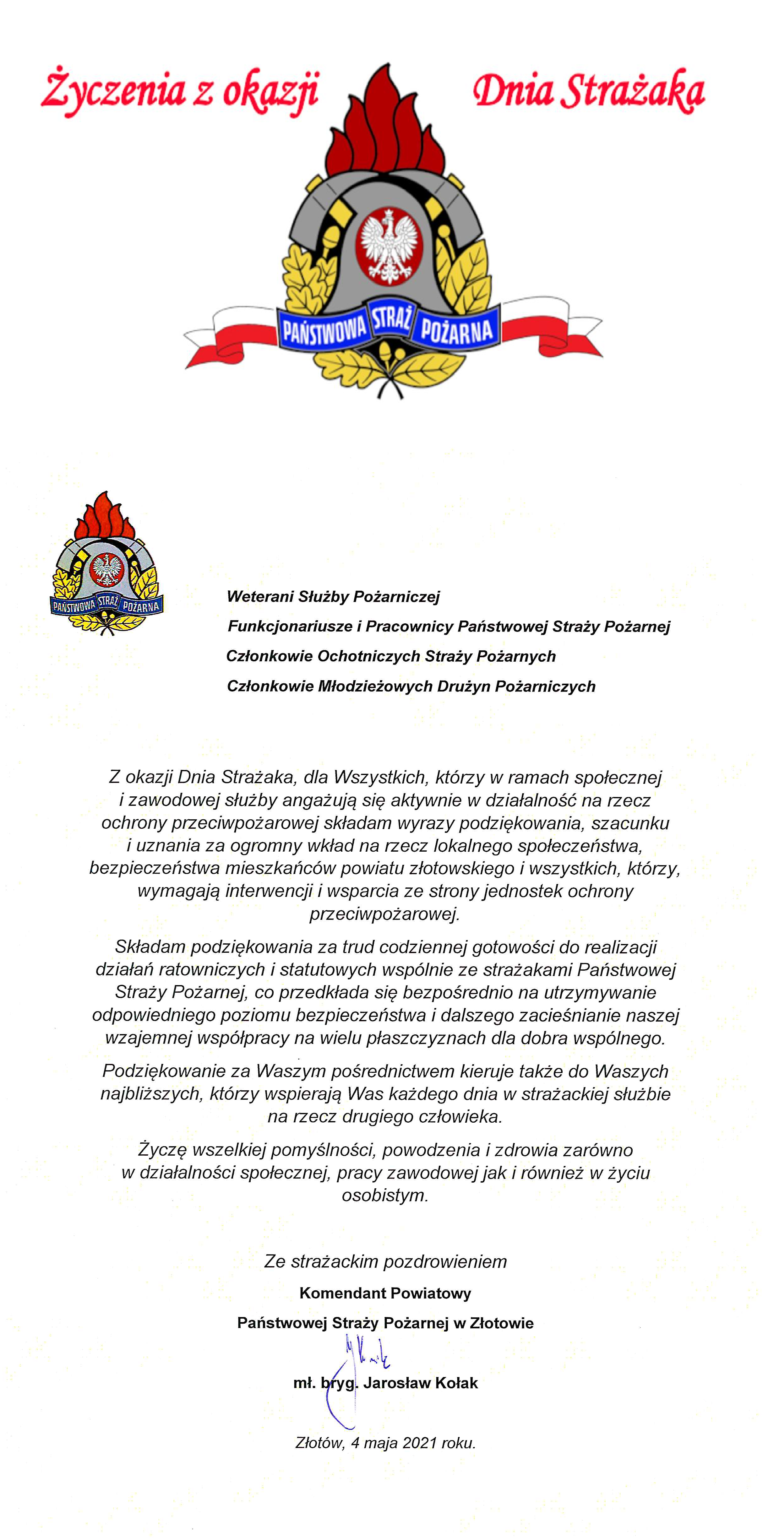 ŻYCZENIA KOMENDANTA POWIATOWEGO PSP W ZŁOTOWIE Z OKAZJI DNIA STRAŻAKA 04.05.2021 Zdjęcia (1) Pokaż zdjęcie 1 z galerii.