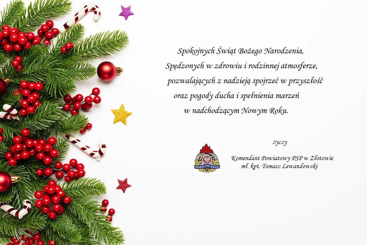 ŻYCZENIA KOMENDANTA POWIATOWEGO PSP W ZŁOTOWIE Z OKAZJI ŚWIĄT BOŻEGO NARODZENIA 23.12.2022 Zdjęcia (1) Pokaż zdjęcie 1 z galerii.