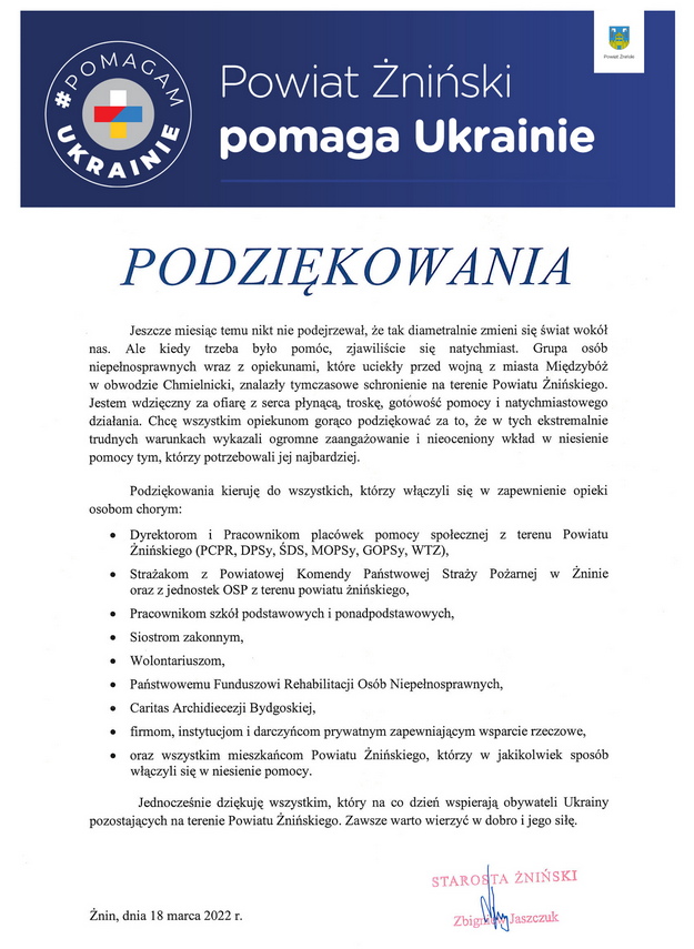 Wielkiego zaangażowania ze strony strażaków wymagało wsparcie 91 niepełnosprawnych z miasta Chmielnicki na Ukrainie, którzy trafili na teren naszego powiatu. Strażacy wspierali jednostki organizacyjne Starosty Żnińskiego podczas nocnych dyżurów do czasu relokacji grupy do obiektów po szpitalu psychiatrycznym w Toruniu. Operacja przewiezienia wszystkich była bardzo trudna i wymagała delikatności. Dzięki współpracy strażaków pełniących służbę w Komendzie Powiatowej Państwowej Straży Pożarnej, druhów ochotników z terenu powiatu, Zespołów Ratownictwa Medycznego i przedstawicieli instytucji samorządowych udało się sprawnie przewieźć grupę do obiektu, który spełnia wymogi dla osób niepełnosprawnych.