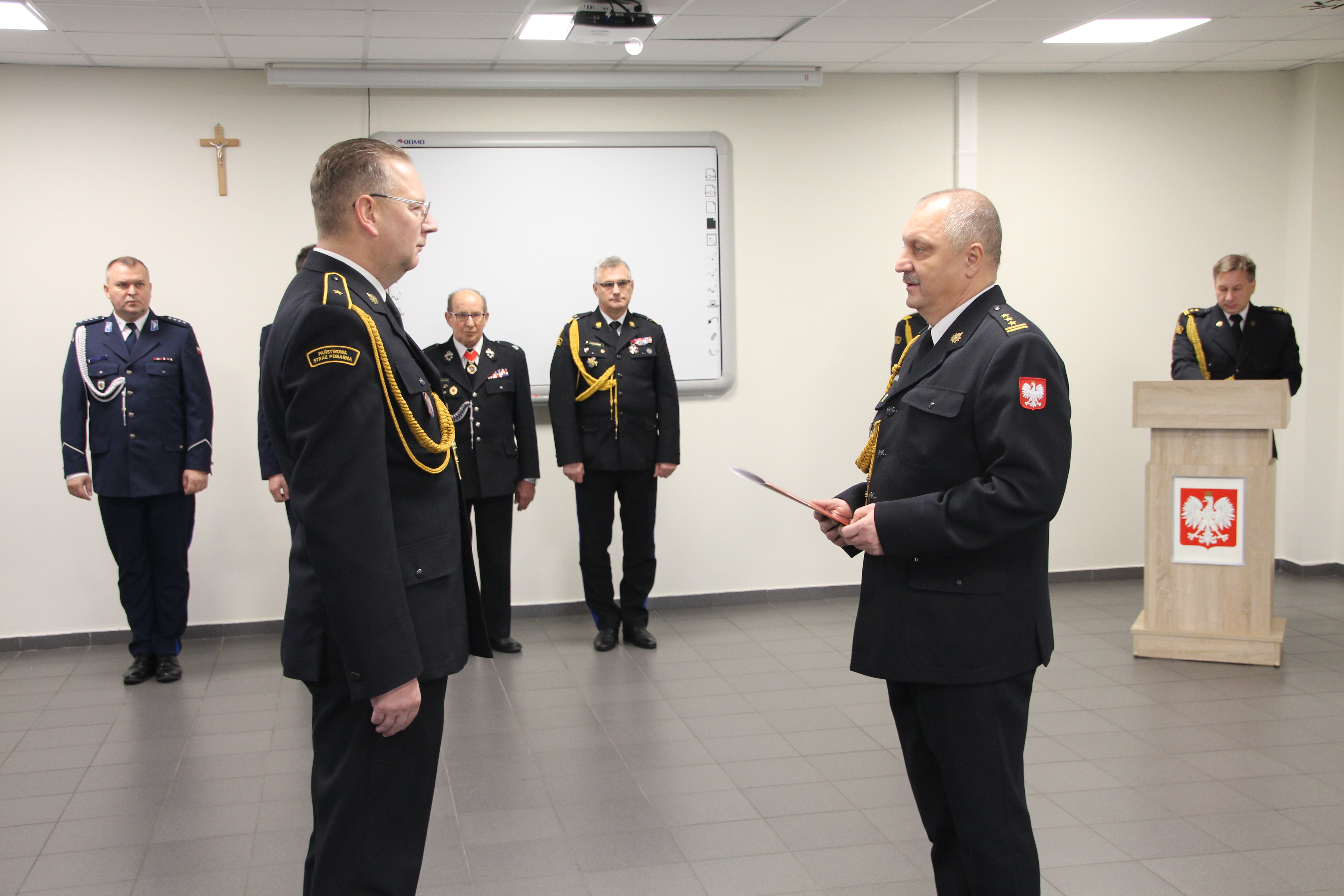st. bryg. Grzegorz Rutkowskiego Komendanta Powiatowego Państwowej Straży Pożarnej w Żninie, akty nadania wyższych stopni służbowych oraz nagrodę za długoletnią służbę.