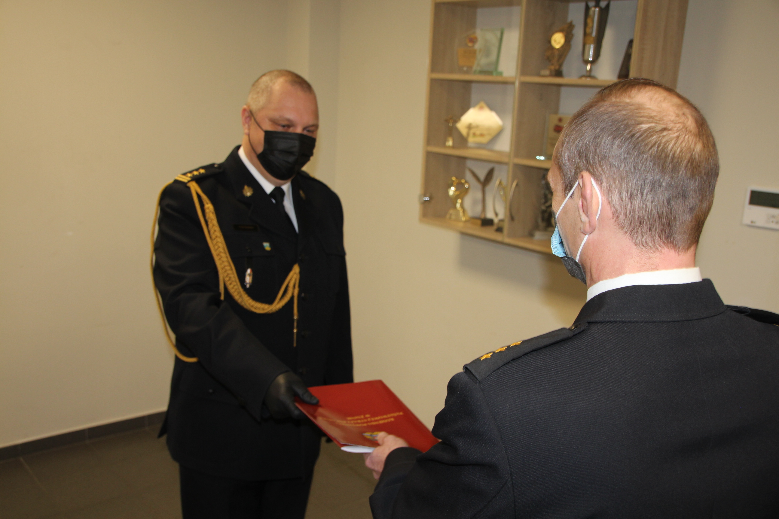 Podczas uroczystej zbiórki komendant wręczył Dowódcy Jednostki Ratowniczo- Gaśniczej kpt. Mirkowi Wrzesińskiemu nagrodę z okazji 30 lat służby i pracy.