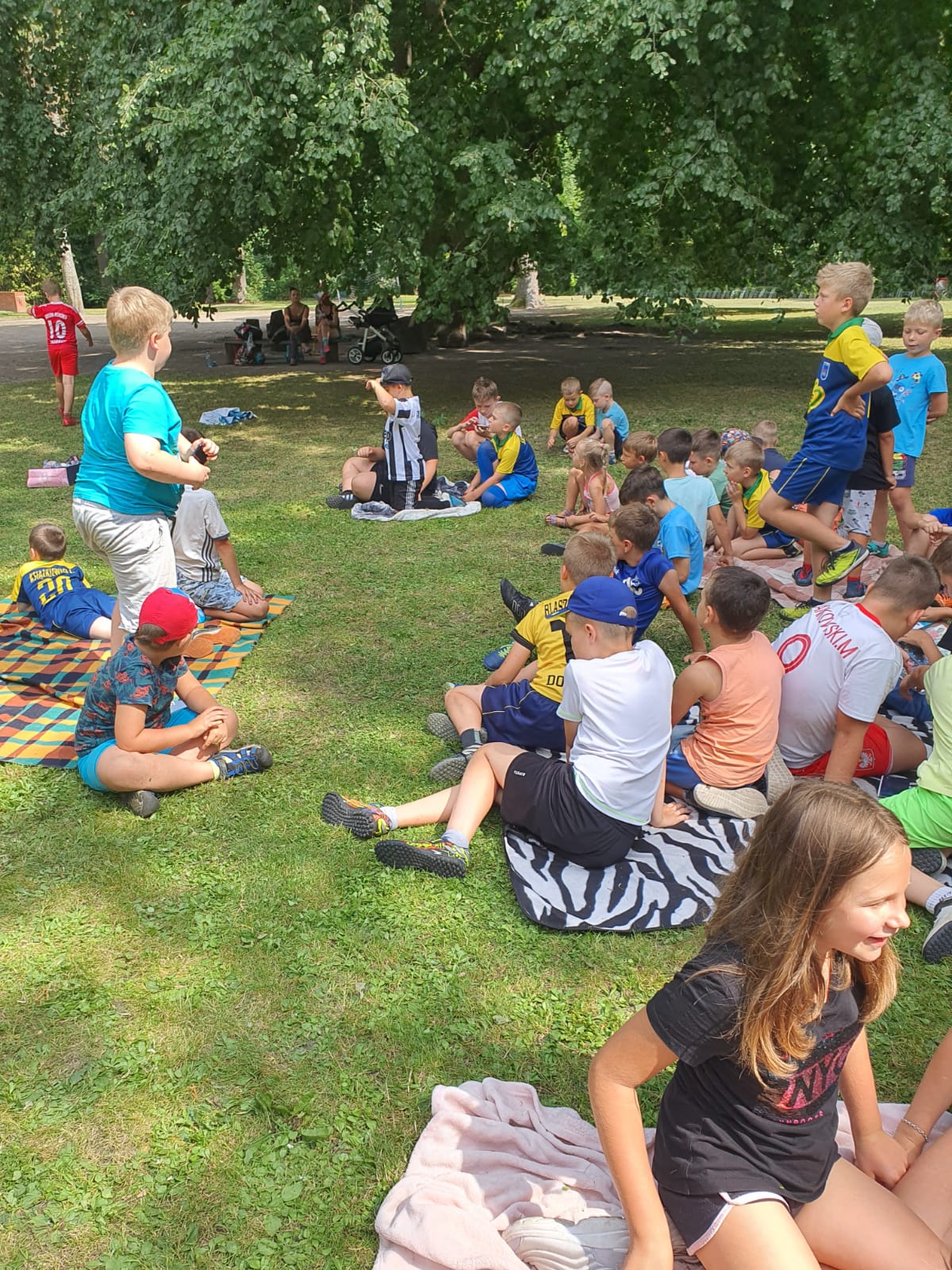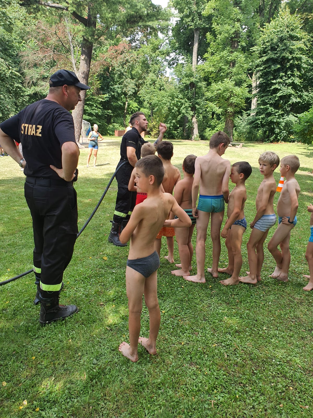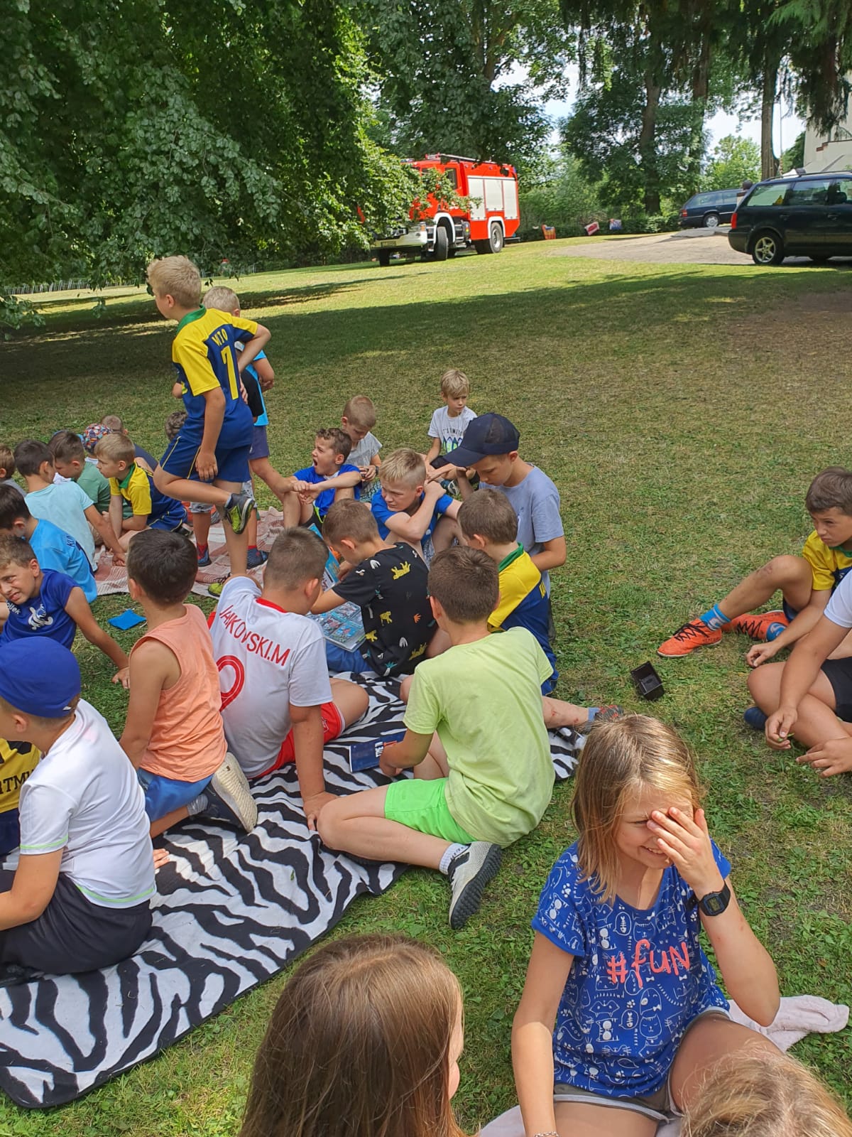 Tym razem odwiedzili obóz piłkarski zrganizowany w pobliskim Słębowie. Uczestnikom pokazano wyposażenie strażackiego wozu, oraz zaprezentowano i wyjaśniono na czym polega służba strażaka. Nie obyło się bez tradycyjnego lania wody... ze strażackiej prądownicy, co przy panujacych wysokich temperaturach dostarczyło wszytskim wiele radości.
