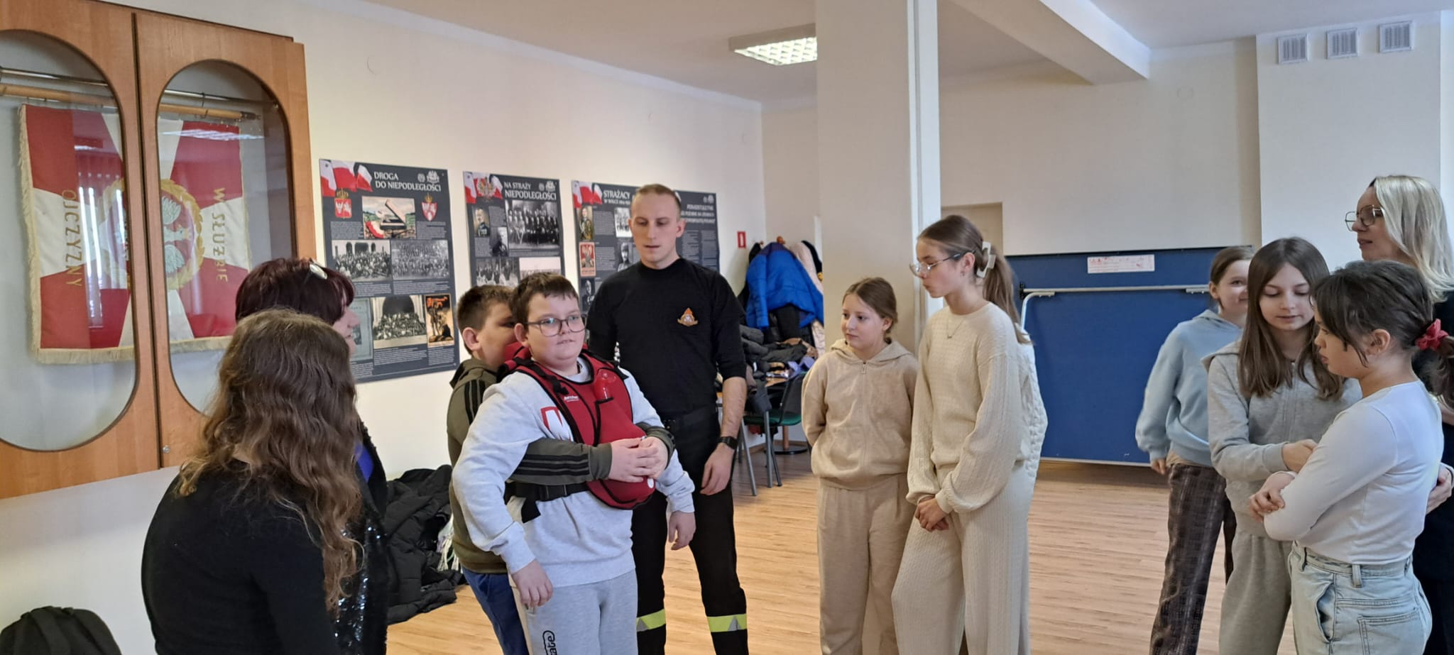 Po omówieniu zasad bezpieczeństwa w domu, strażacy przystąpili do pokazu zasad udzielania pierwszej pomocy, w tym jak prawidłowo prowadzić resuscytację krążeniowo – oddechową czy ułożyć osobę poszkodowaną w pozycji bezpiecznej. Dzieci i ich opiekunowie miały również możliwość spróbowania na specjalnie do tego przeznaczonej kamizelce postępowania w przypadku zadławień.