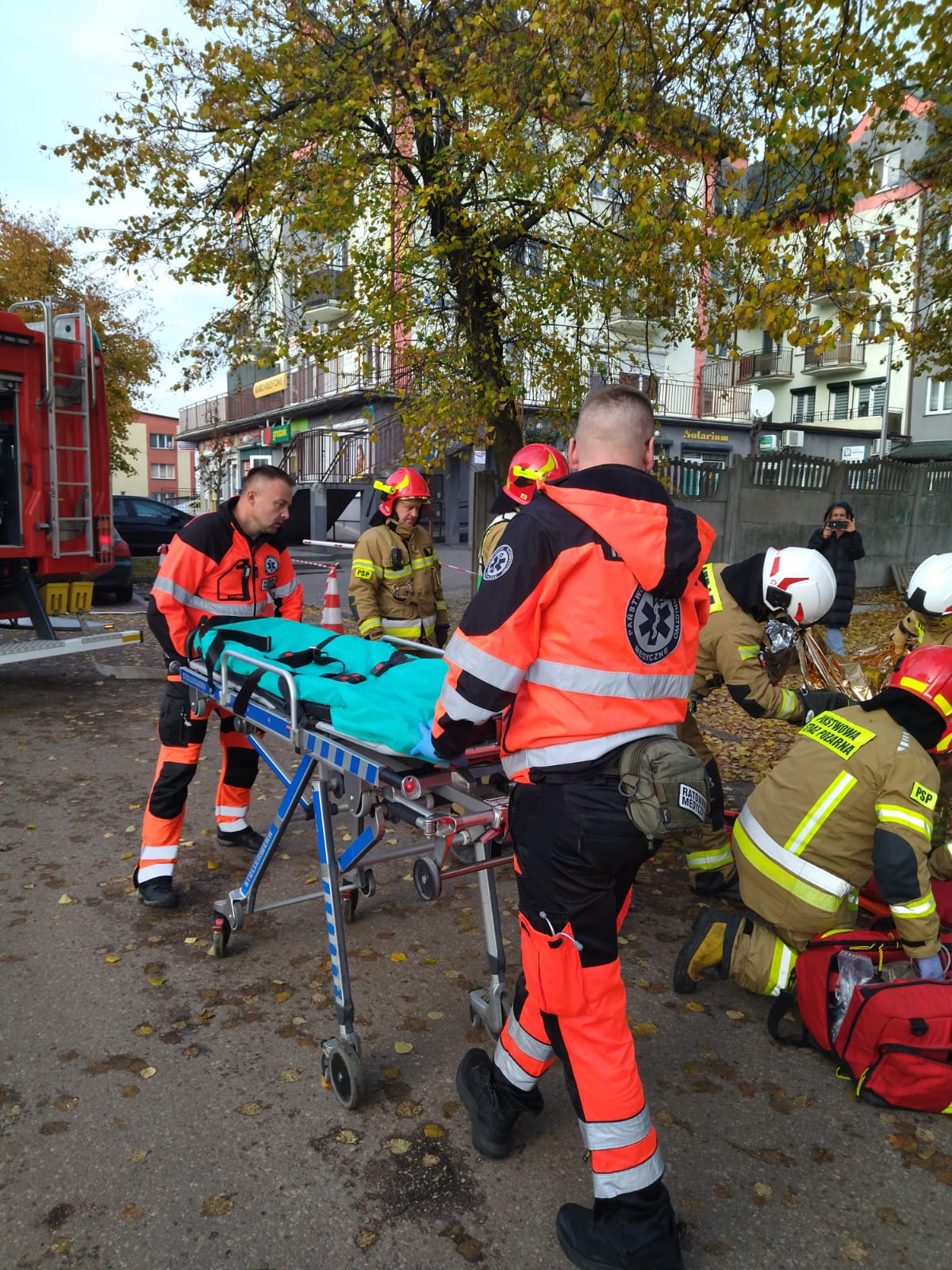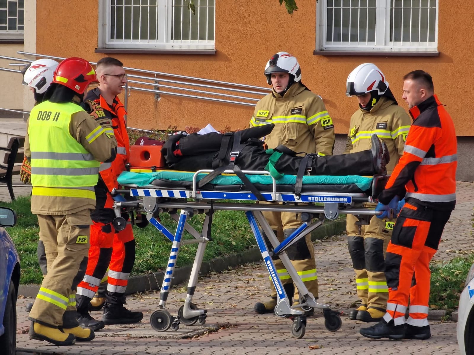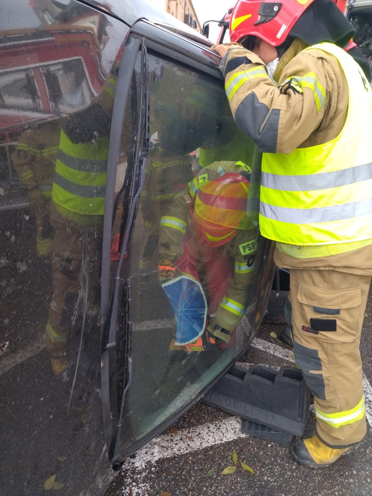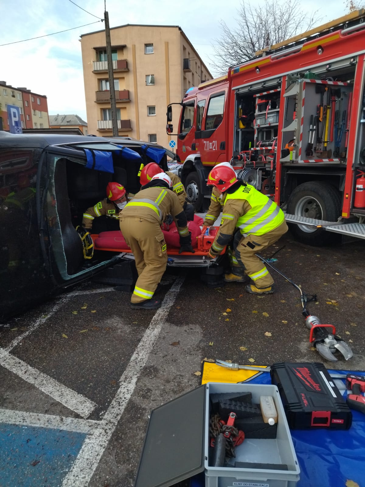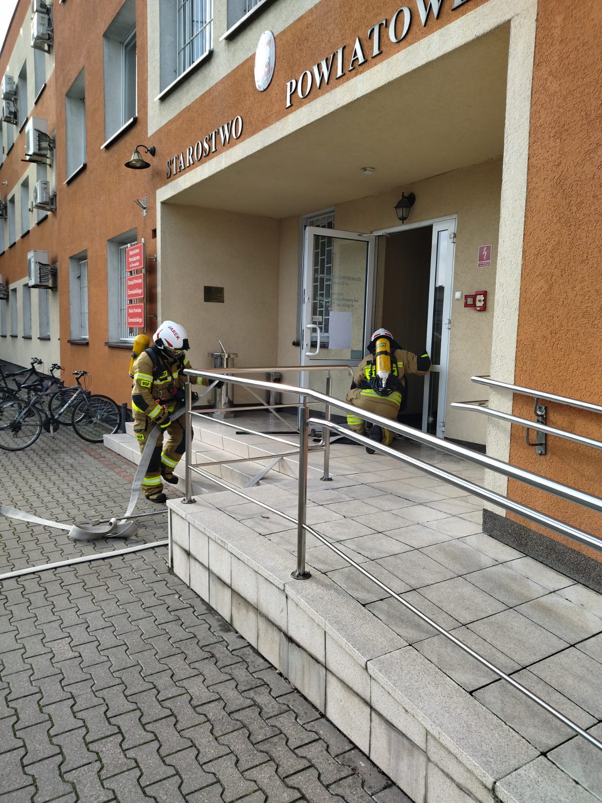 Zadaniem strażaków była ewakuacja osoby poszkodowanej i działania gaśnicze w budynku starostwa oraz działania ratownicze z zakresu ratownictwa technicznego w celu ewakuacji osoby poszkodowanej z pojazdu. Na potrzeby działań utworzono sztab akcji koordynujący działania we wszystkich lokalizacjach przy współudziale oficerów wsparcia Państwowej Straży Pożarnej.