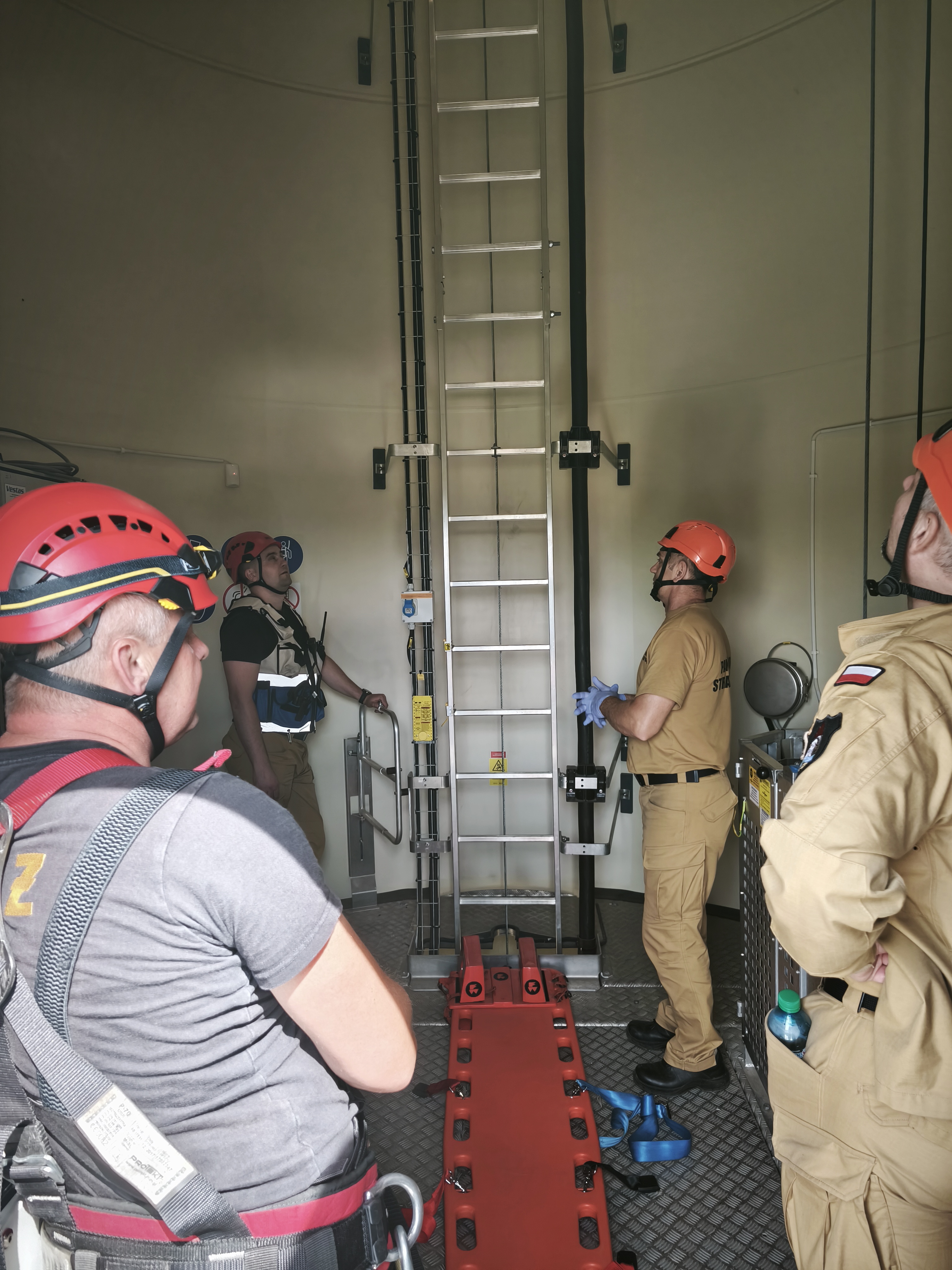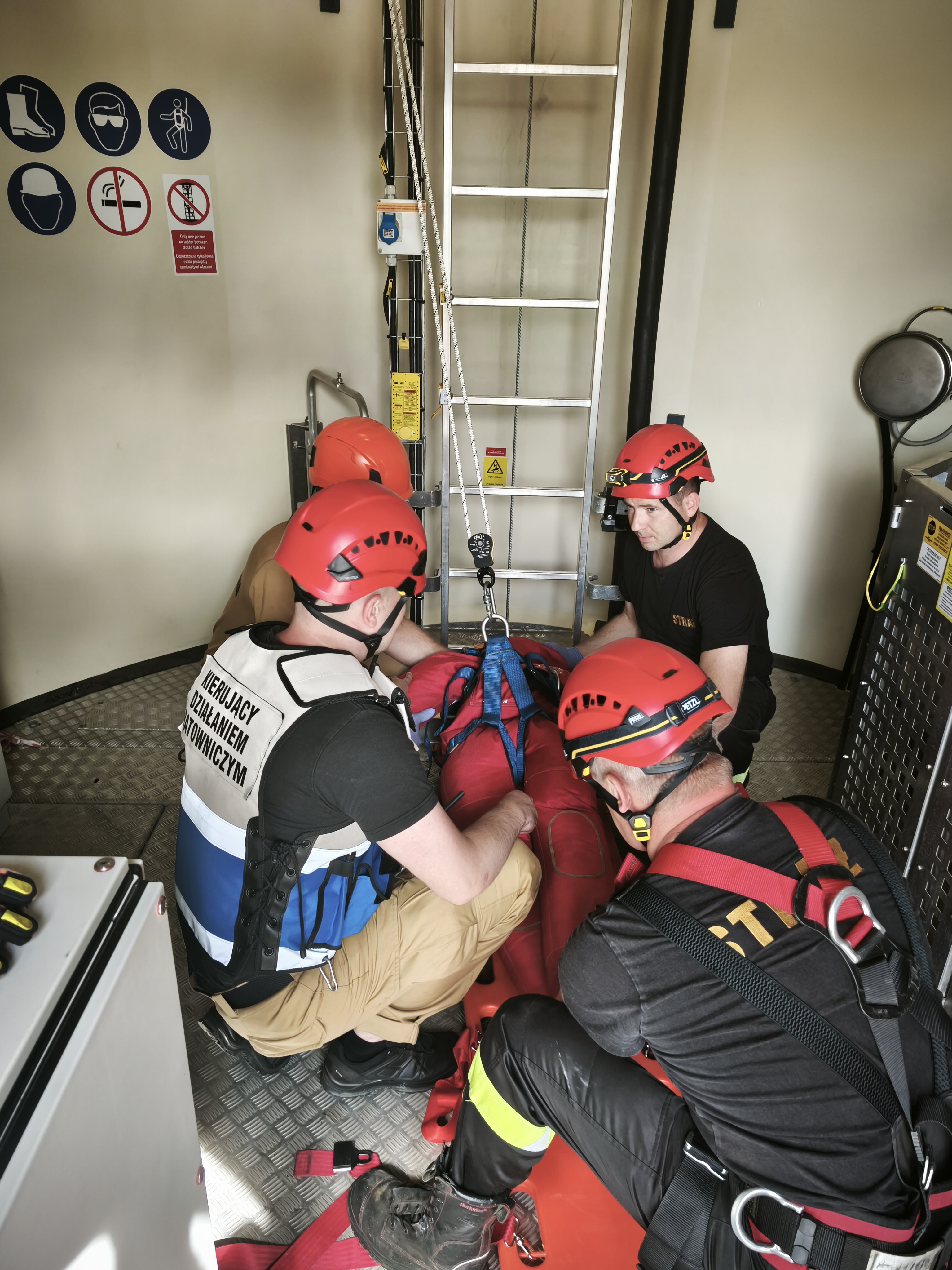 Strażacy grup specjalistycznych z pomocą ratowników JRG Żuromin ćwiczyli na obiekcie sposoby i możliwości ewakuacji osób poszkodowanych z gondoli i drabiny wewnętrznej z wykorzystaniem specjalistycznych technik ratownictwa wysokościowego w celu opuszczenia ratownika wraz z osobą na ziemię. Wymagające i ciekawe ćwiczenia, pozwoliły kadrze dowódczej oraz ratownikom wypracować wnioski i spostrzeżenia, które w przyszłości pozwolą zareagować i dotrzeć do osób potrzebujących pomocy.