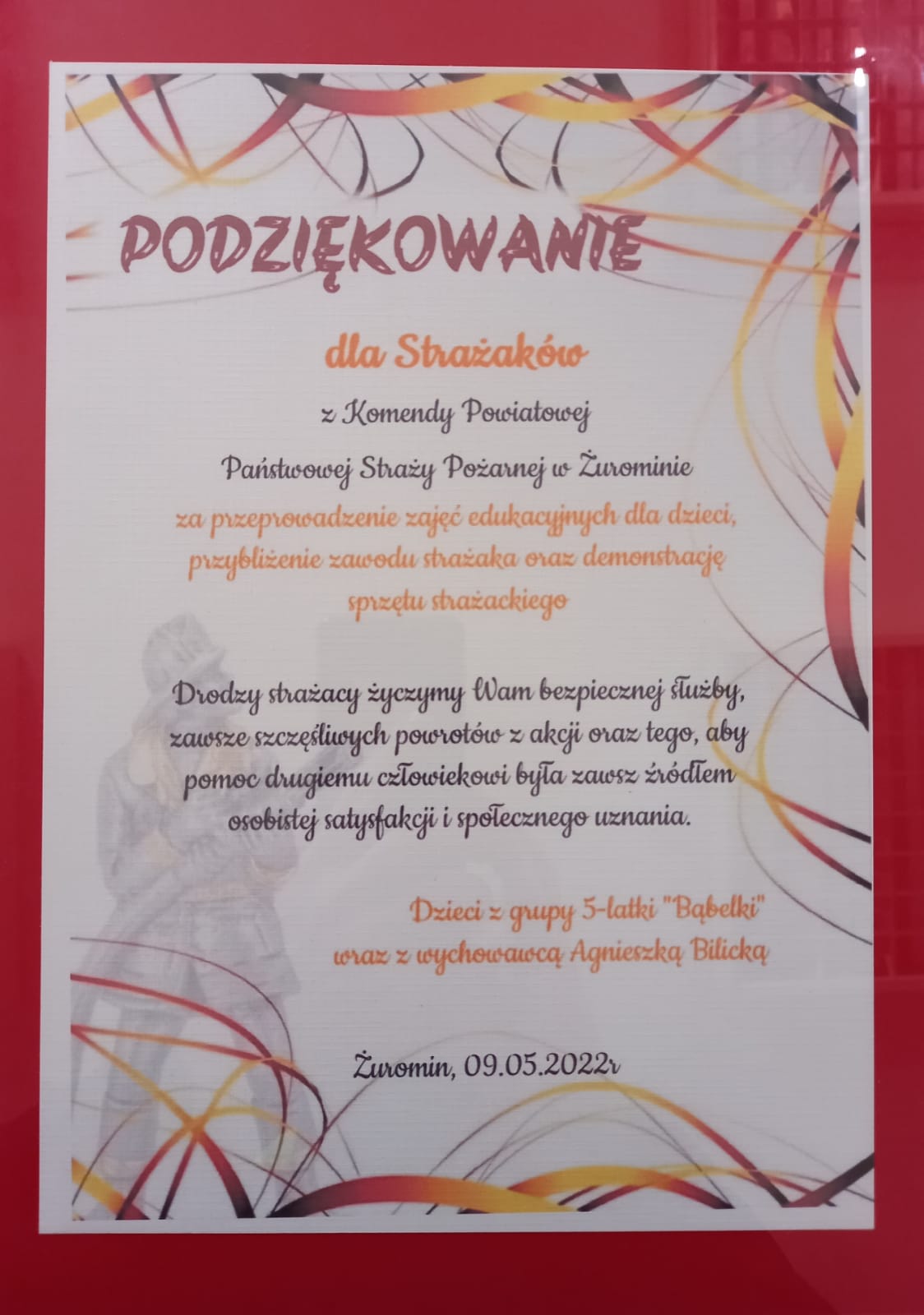 9 maja 2022 roku strażaków zmiany 2 JRG Żuromin odwiedziły dzieci grupy 5 – latków wraz z opiekunami z Oddziału Przedszkolnego przy Szkole Podstawowej nr 2 w Żurominie. Podczas spotkania omówiono zasady zachowania się podczas pożaru, sposoby zgłaszania zdarzeń oraz numery alarmowe służb ratowniczych. Strażacy oprowadzili dzieci po jednostce i przeprowadzili dla Nich pokaz sprzętu ratowniczo – gaśniczego znajdującego się na wyposażeniu pojazdów pożarniczych, opowiadając przy okazji o pracy strażaka.