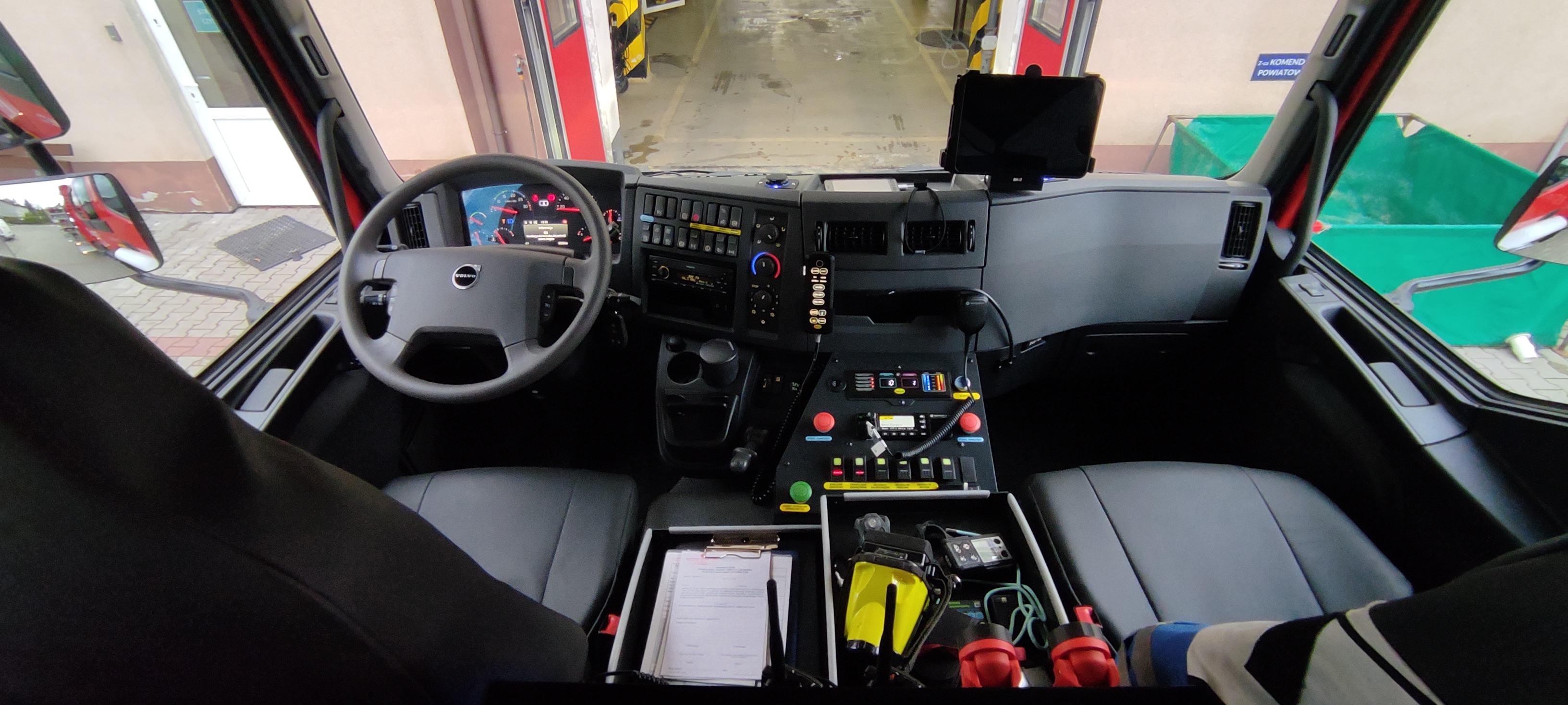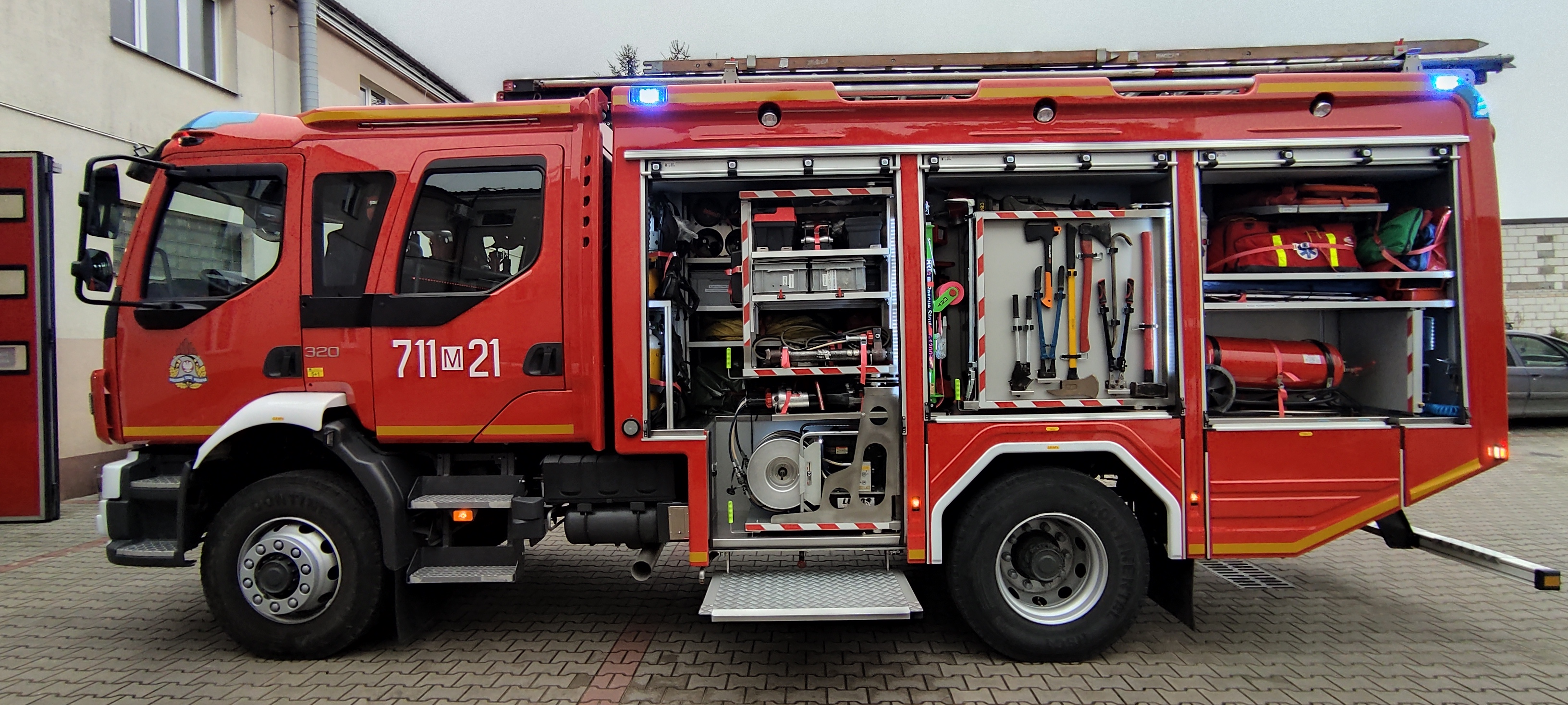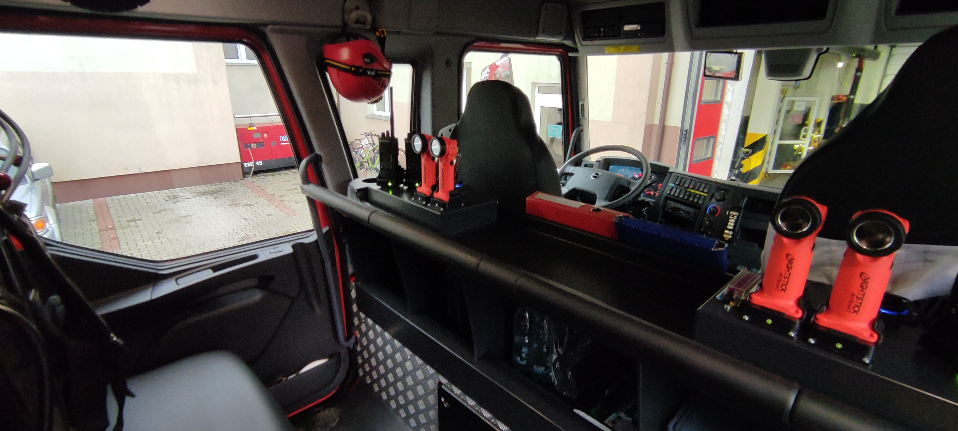 - zestaw podpór ratowniczych do stabilizacji pojazdów oraz sprzęt pomocniczy z ratownictwa drogowego (mata sprzętowa, osłony ostrych elementów, osłony na kierownicę chroniące przed niekontrolowaną eksplozją poduszki powietrznej, rolki transportowe do przemieszczania pojazdów, rękawice dielektryczne, parawan ochronny, parawan chroniący osoby ratowane);