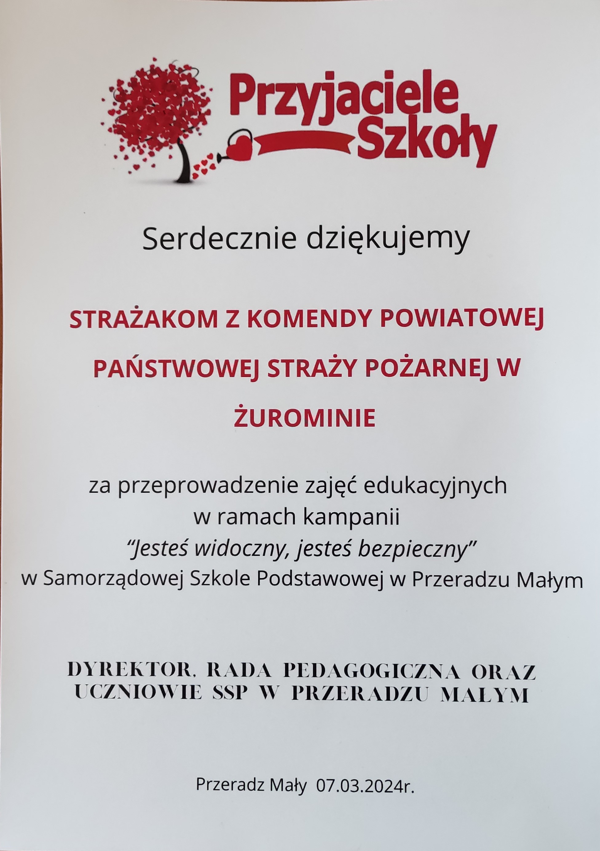 7 marca 2024 roku w Szkole Podstawowej w Przeradzu Małym (gm. Lutocin) odbyła się kolejna już w naszym powiecie kampania społeczna pod nazwą „Jesteś widoczny, jesteś bezpieczny” w której udział wzięło 97 uczniów klas I-VIII ze szkół podstawowych w Przeradzu Małym oraz Swojęcinie.