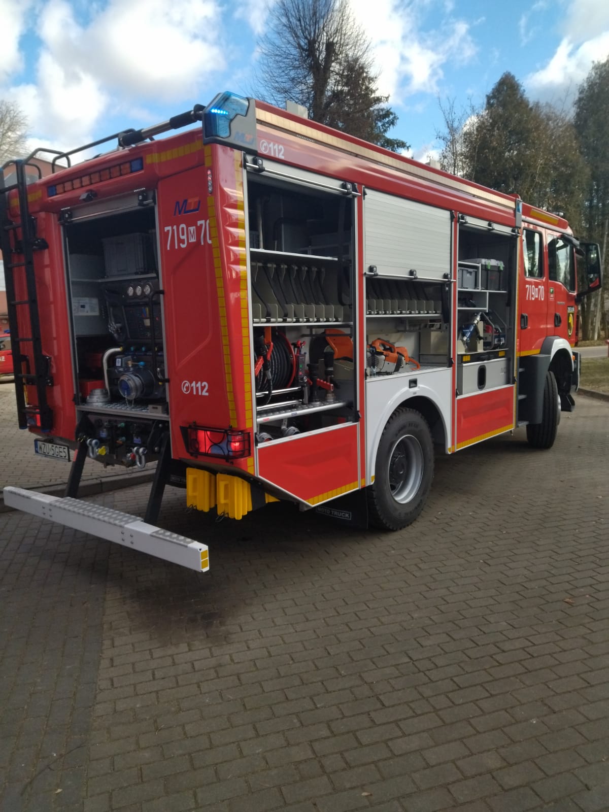 - drabinę nasadkową, linki ratownicze, piłę do drewna, piłę do betonu i stali, piłę szablastą, zestaw bezprzewodowych elektronarzędzi (wkrętarka, zakrętarka), łom, nożyce do prętów, młot, łopaty, szpadle, widły, siekiery, agregat oddymiający, ;