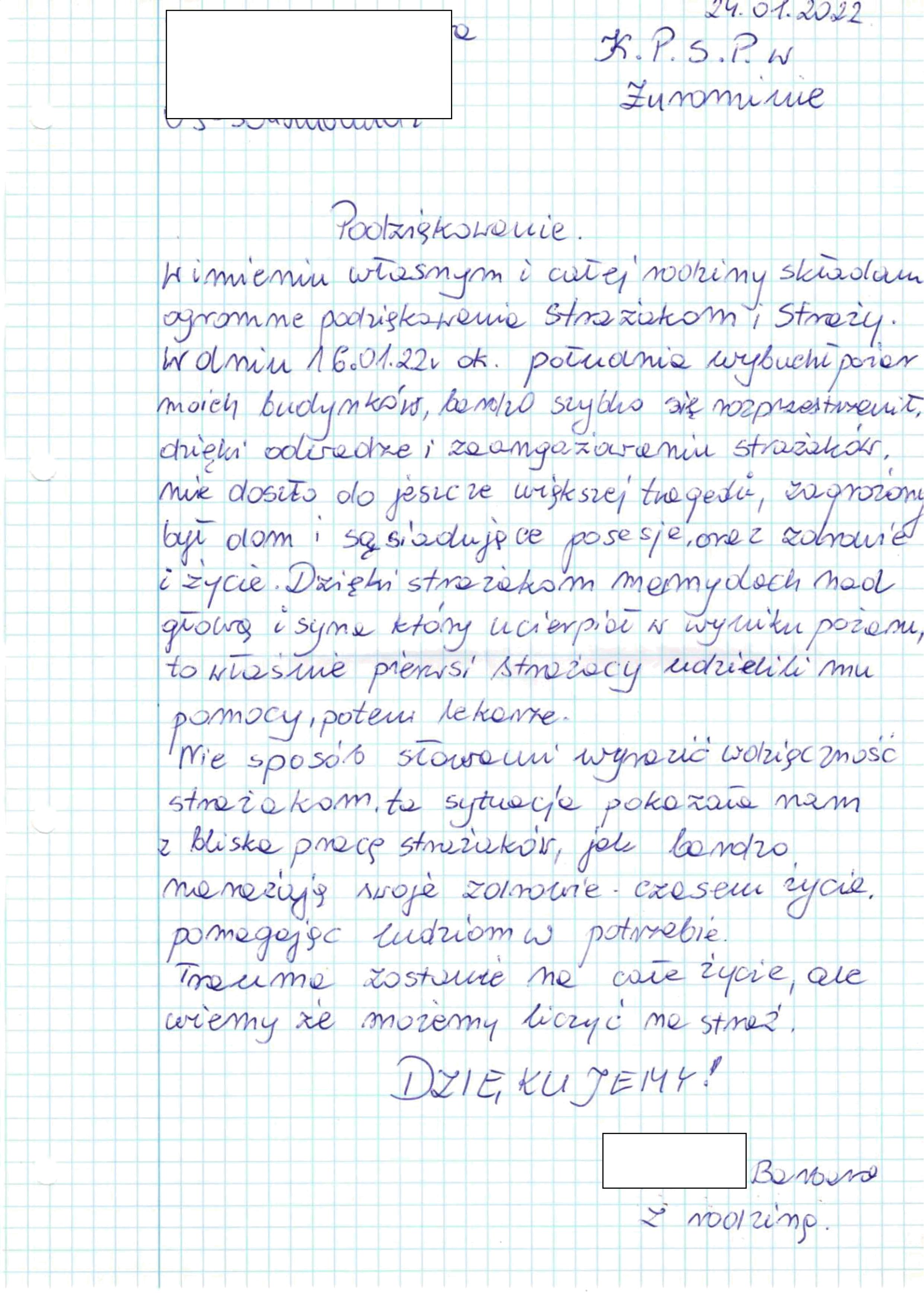 Za zaangażowanie, profesjonalizm oraz szybkie podjęcie działań ratowniczo – gaśniczych, na ręce Komendanta Powiatowego PSP w Żurominie w dniu 24 stycznia wpłynęło podziękowanie dla strażaków pełniących w tym dniu służbę od mieszkańców posesji, na której doszło do pożaru.