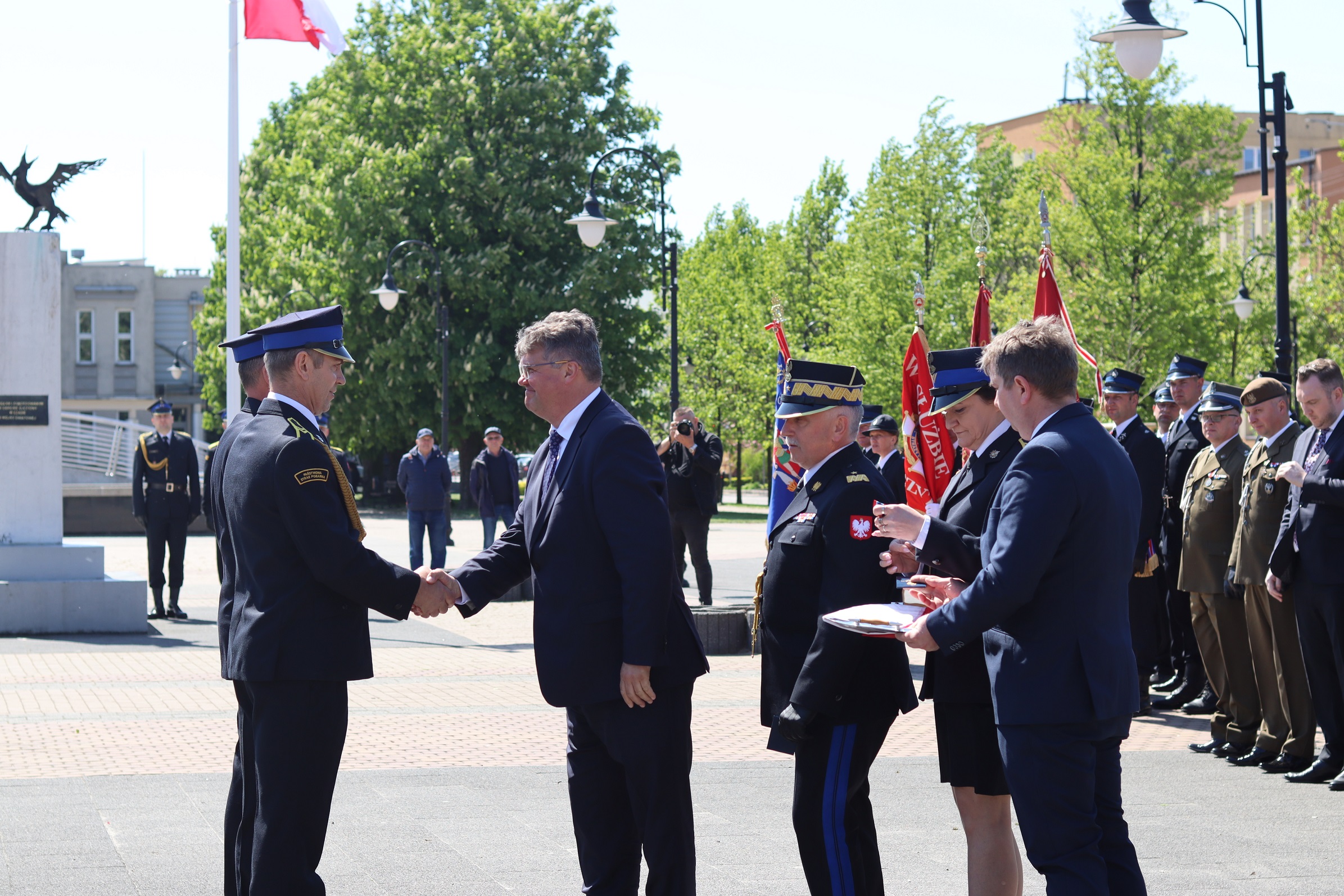 Po uroczystej Mszy, pododdziały, poczty sztandarowe i zaproszeni goście przemaszerowali do pobliskiego parku miejskiego pod pomnik Ofiar II Wojny Światowej na dalszą część obchodów. Uroczystość rozpoczęła się złożeniem meldunku Sekretarzowi Stanu w Ministerstwie Spraw Wewnętrznych i Administracji Panu Maciejowi Wąsikowi, który dokonał przeglądu i powitania pododdziałów. Następnie podniesiono flagę państwową wraz z odegraniem hymnu Państwowego.