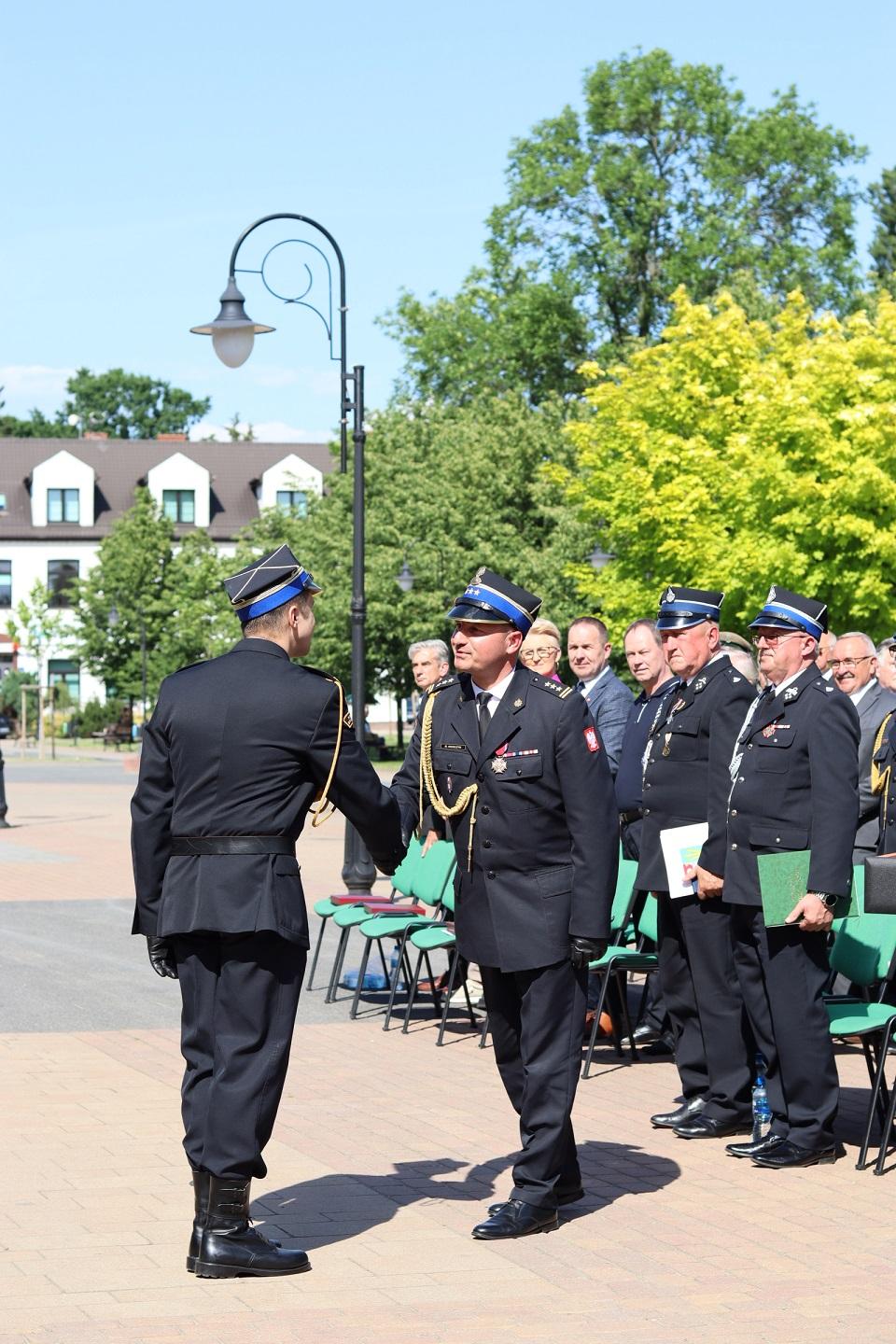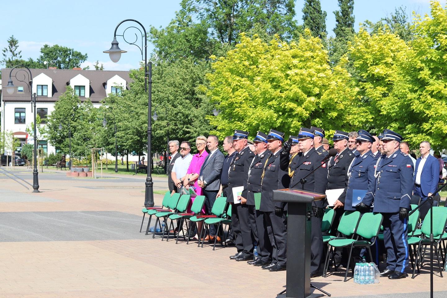 Przed rozpoczęciem uroczystej Mszy św. przedstawiciele samorządu i służb mundurowych złożyli wiązankę kwiatów pod pomnikiem Ofiar II Wojny Światowej. Po Mszy św., pododdziały, poczty sztandarowe i zaproszeni goście przemaszerowali do pobliskiego parku miejskiego im. Burmistrza Józefa Kaźmierskiego na dalszą część obchodów. Uroczystość rozpoczęła się złożeniem meldunku Zastępcy Mazowieckiego Komendanta Wojewódzkiego PSP st. bryg. Maciejowi Bieńczykowi, który dokonał przeglądu i powitania pododdziałów. Następnie podniesiono flagę państwową wraz z odegraniem hymnu państwowego.