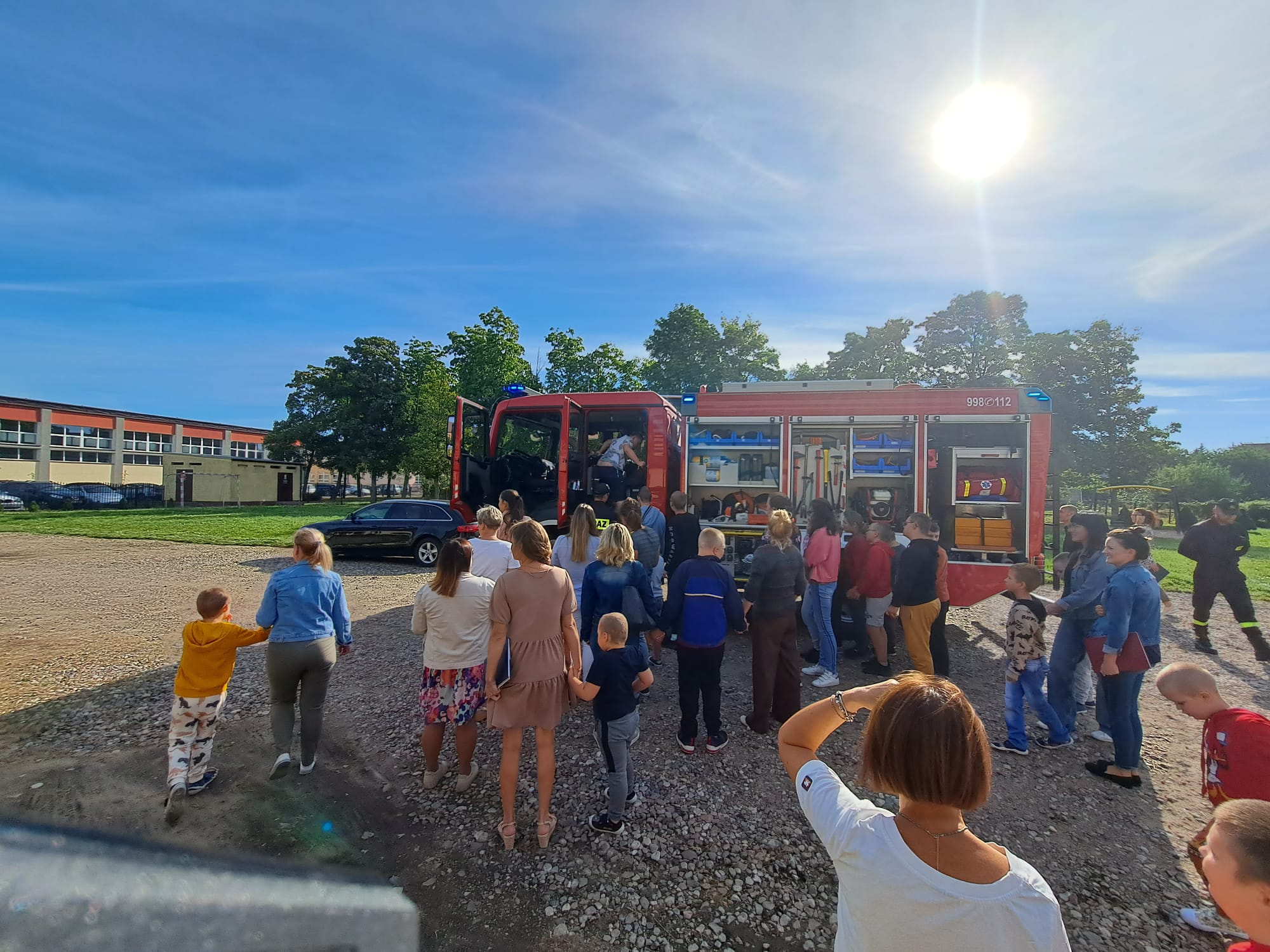 Po ewakuacji, strażacy spotkali się z wychowankami przed budynkiem szkoły. Omówiono z dziećmi zasady zachowania się podczas pożaru oraz sposób zgłaszania zdarzeń na numery alarmowe służb ratunkowych. Wizyta w szkole, nie mogła odbyć się bez pokazu samochodu ratowniczo – gaśniczego i znajdującego się na nim sprzętu, o którego zastosowaniu w praktyce strażacy chętnie opowiedzieli.