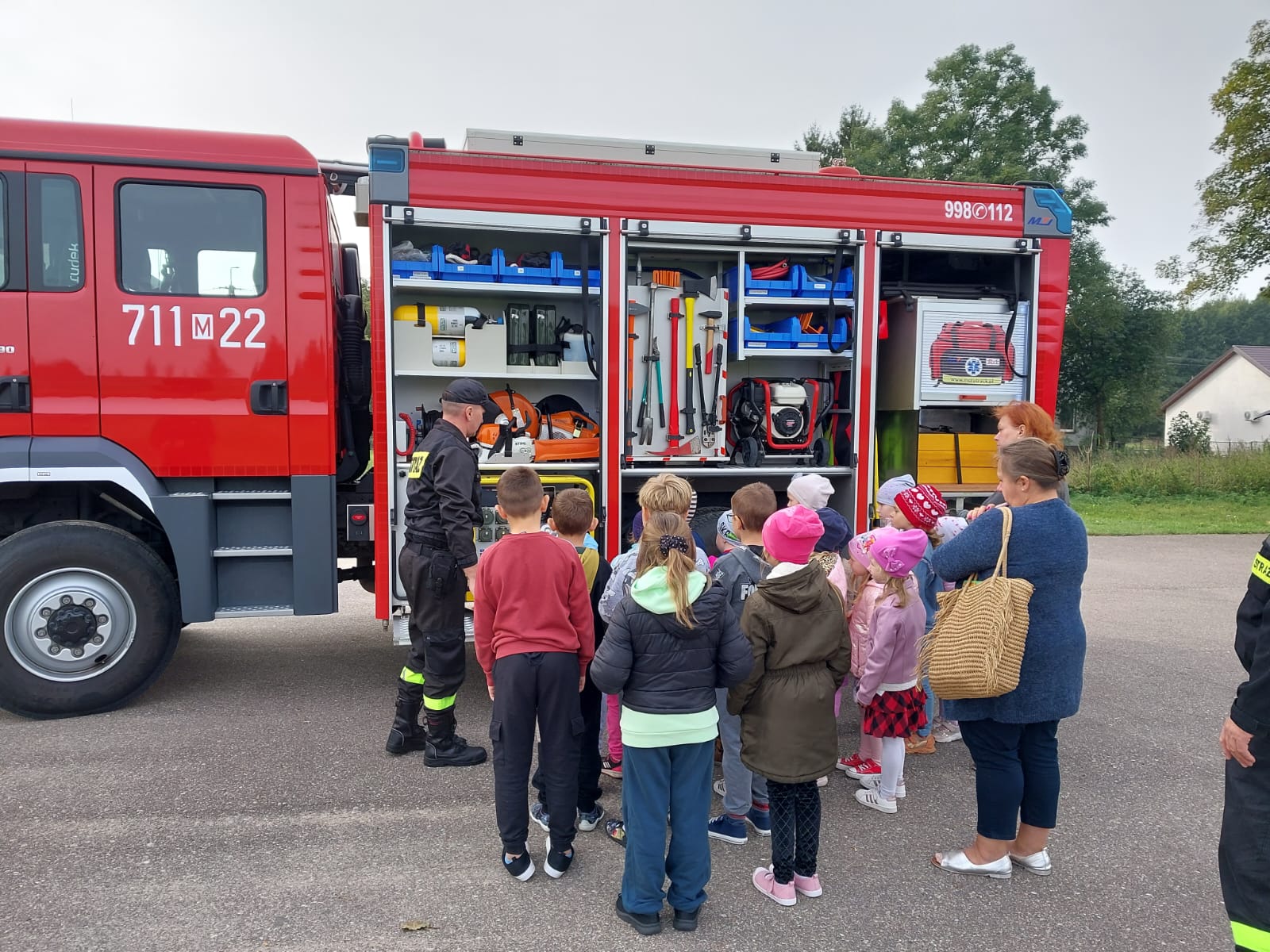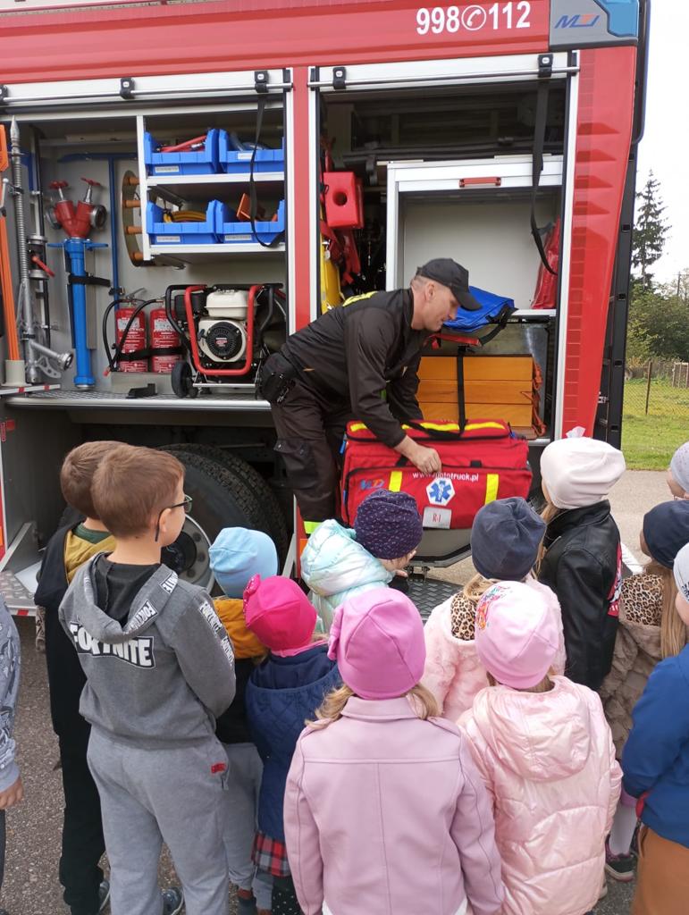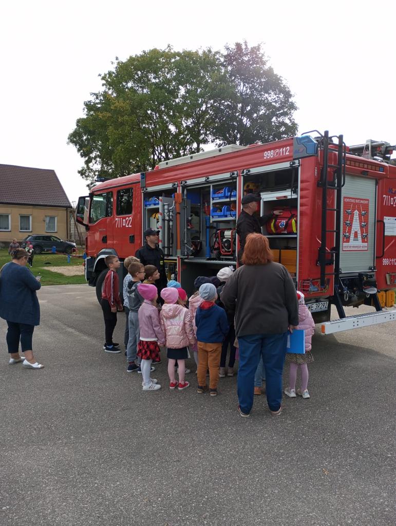 Próbna ewakuacja oraz spotkanie ze strażakami wychowanków i ich opiekunów ze szkoły podstawowej w Nowej Wsi (gm. Kuczbork – Osada).