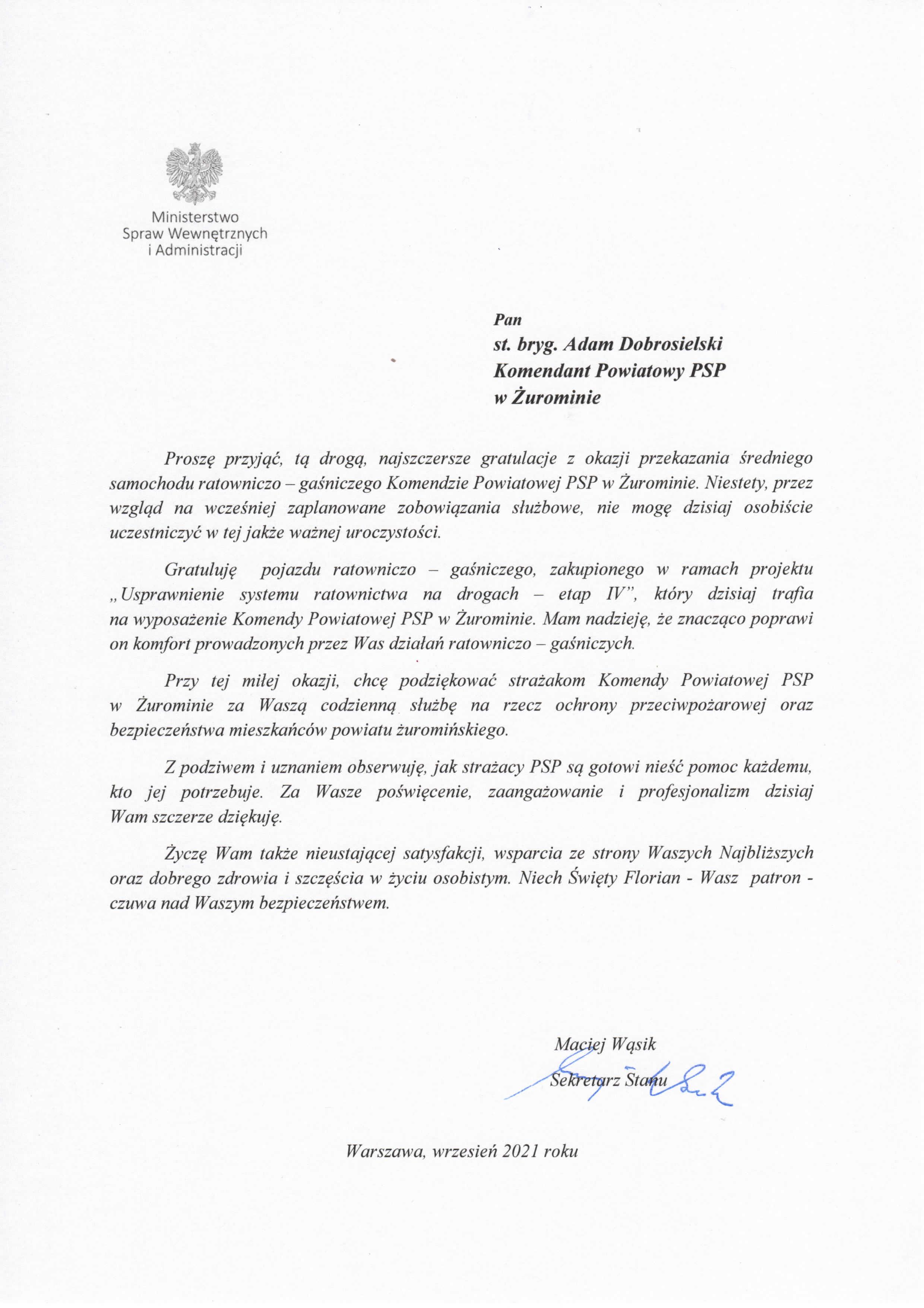 - nowego samochodu GBA 2,9/16 ze zwiększonym potencjałem ratownictwa drogowego dla Komendy Powiatowej Państwowej Straży Pożarnej w Żurominie,