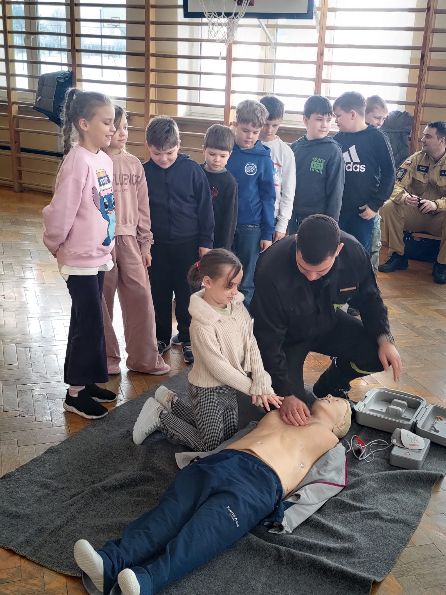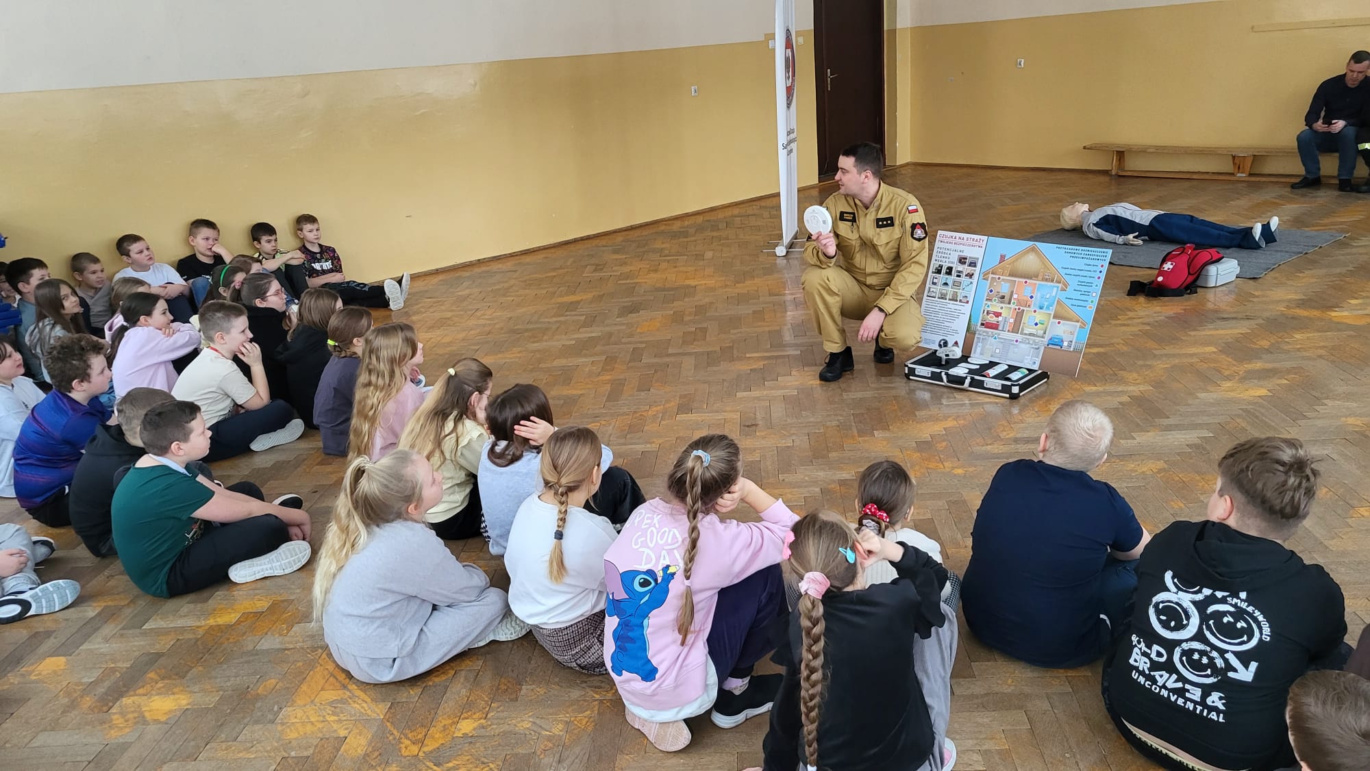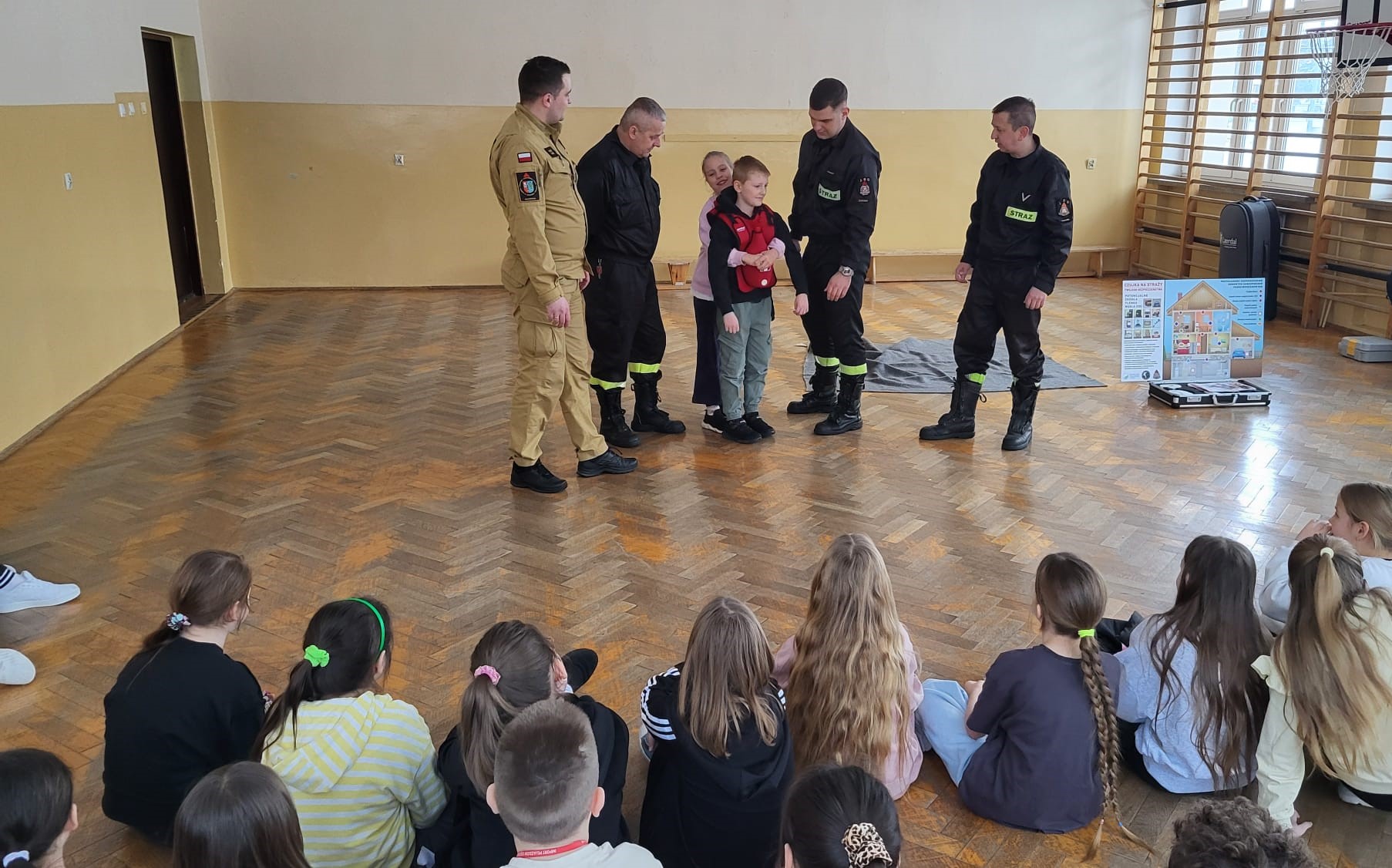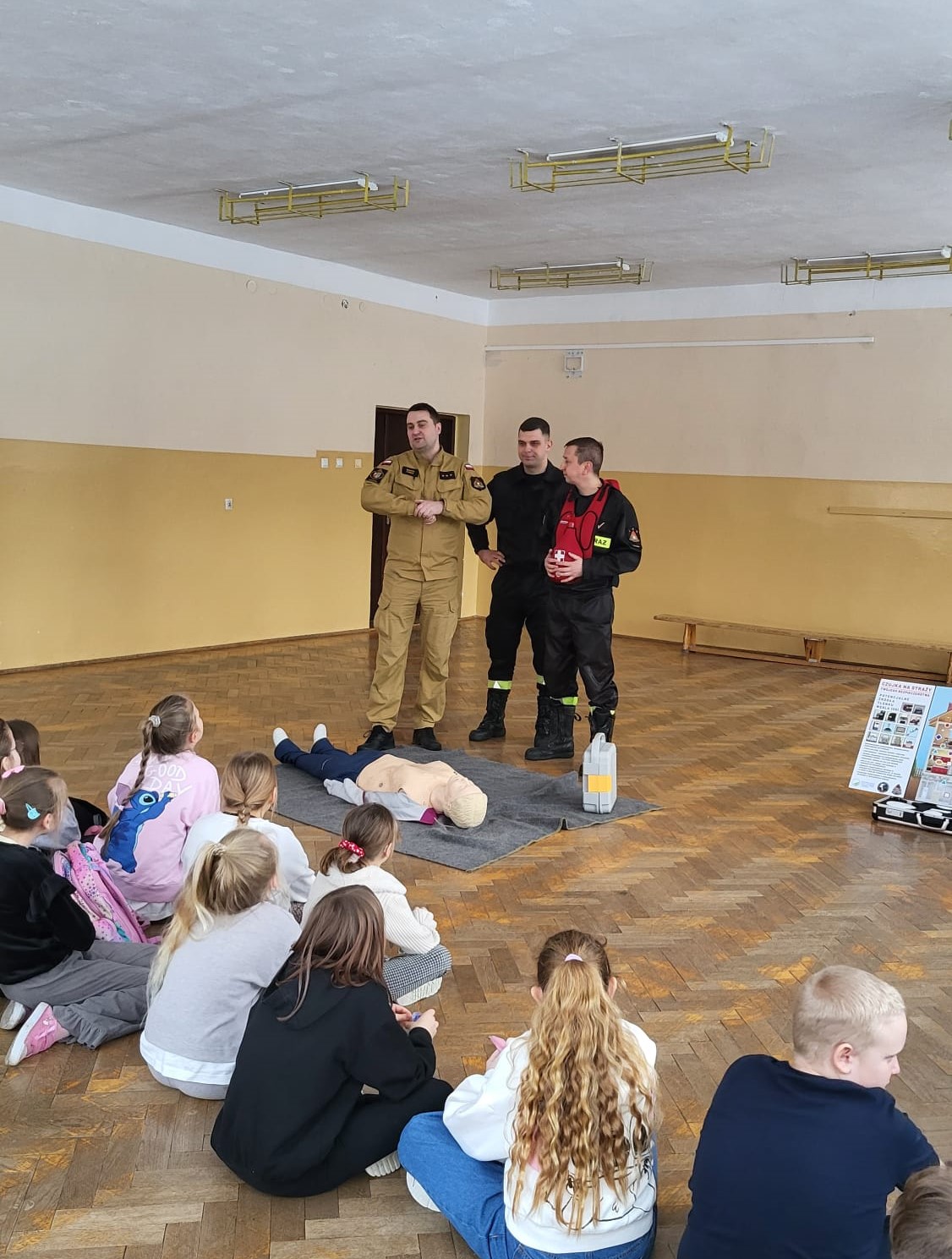 Strażacy przeprowadzili pokaz udzielania kwalifikowanej pierwszej pomocy w tym zasady prowadzenia resuscytacji krążeniowo – oddechowej, stosowania defibrylatora AED, który również znajduje się przy wejściu do szkoły oraz udzielania pomocy przy zadławieniach, wykorzystując do tego specjalną kamizelkę. Omówiono z dziećmi zasady zachowania się podczas pożaru oraz sposób zgłaszania zdarzeń na numery alarmowe służb ratunkowych. Rozmawiano o zachowaniu się na lodowisku, kiedy załamie się pod człowiekiem lód i podczas zjeżdżania na sankach w pobliżu niebezpiecznych miejsc jak drogi publiczne, o zagrożeniach występujących przy niskich temperaturach i wychłodzeniu organizmu, a także o noszeniu odblasków w warunkach ograniczonej widoczności i poza terenem zabudowanym.