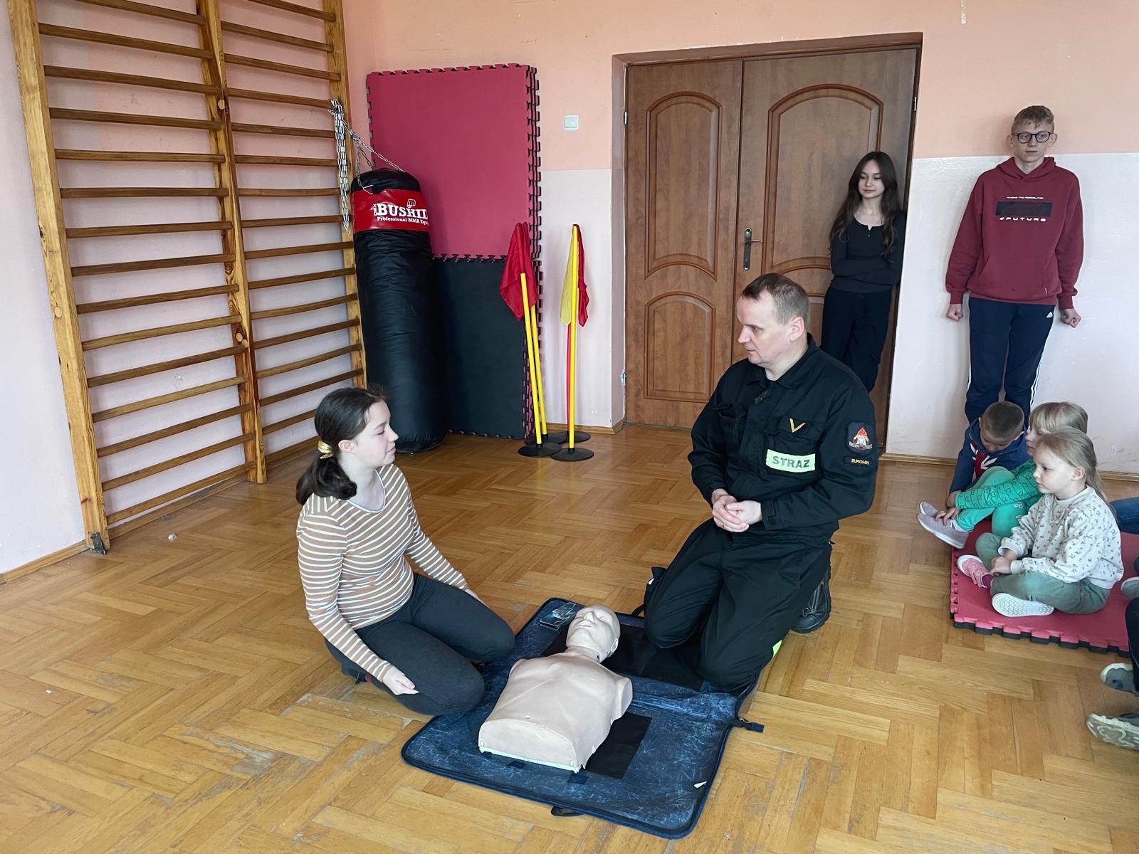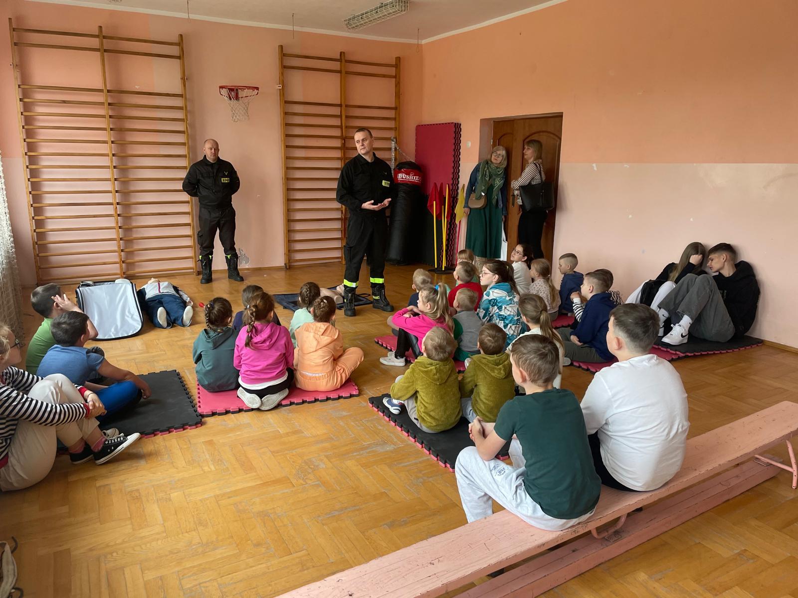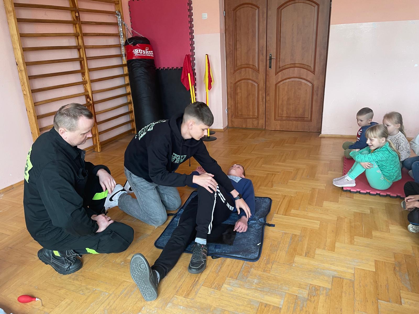 Strażacy zaprezentowali dzieciom z klas 1-8 podstawowe zasady udzielania kwalifikowanej pierwszej pomocy przy zdarzeniach, wymagających podjęcia jak najszybciej działań z zakresu pierwszej pomocy. Funkcjonariusze Państwowej Straży Pożarnej, szczegółowo zaprezentowali dzieciom jak ocenić stan osoby poszkodowanej i jeżeli zajdzie potrzeba prowadzić resuscytację krążeniowo-oddechową, przedstawili prawidłowe ułożenie osoby nieprzytomnej z zachowanym własnym oddechem w pozycji bezpiecznej oraz szereg innych zagadnień dotyczących pierwszej pomocy, których znajomość może uratować życie bądź zdrowie. Osoby chętne miały również okazję samodzielnie spróbować udzielania pierwszej pomocy z wykorzystaniem fantoma.