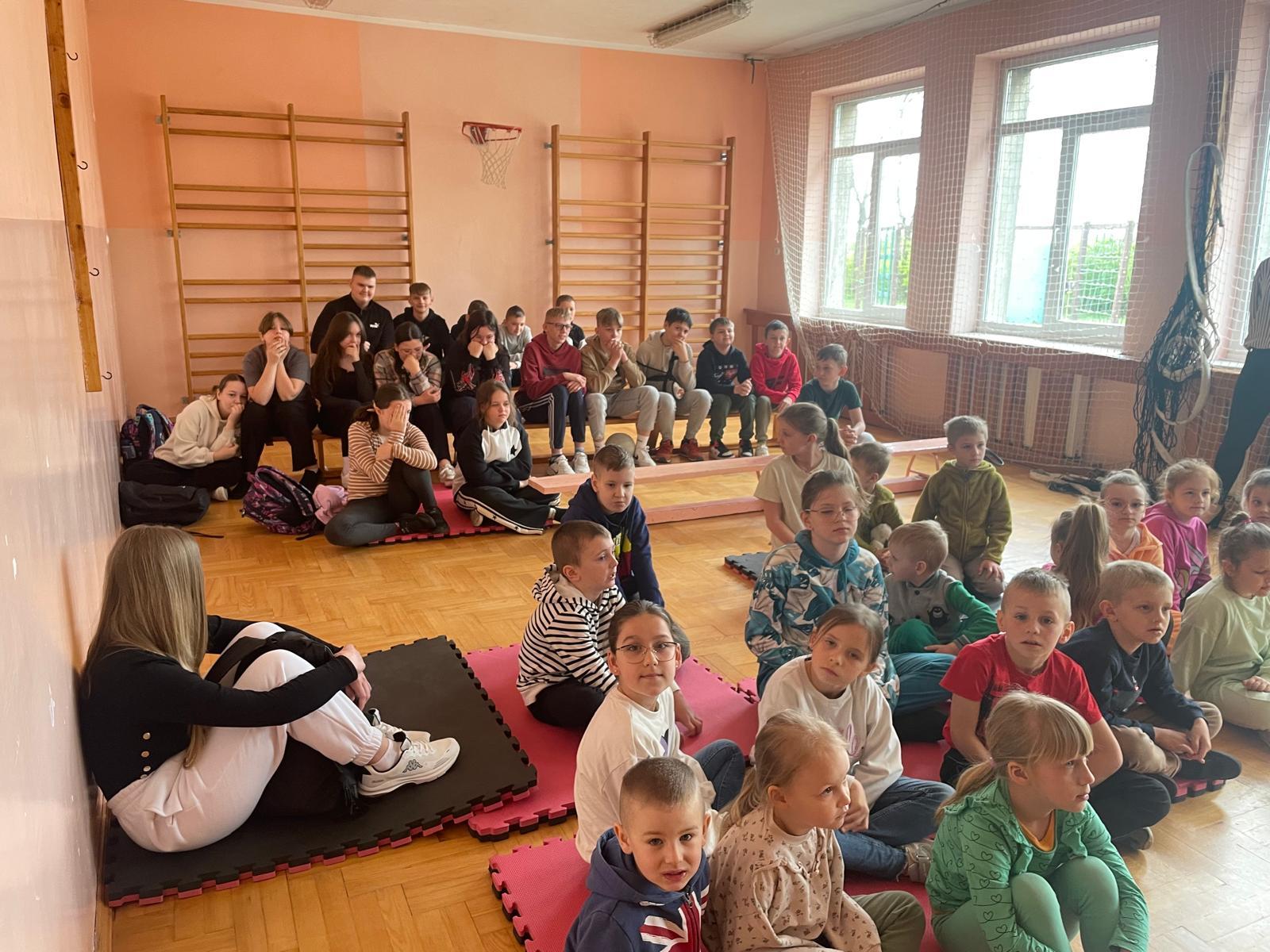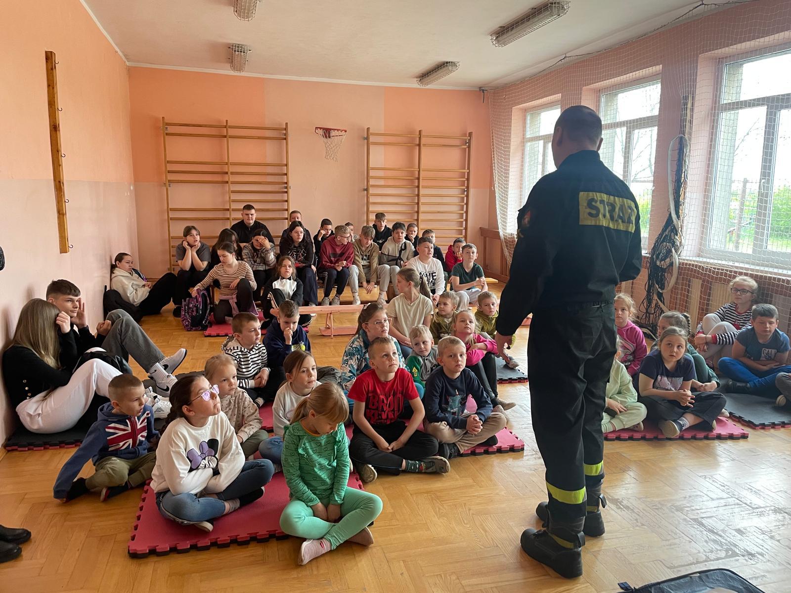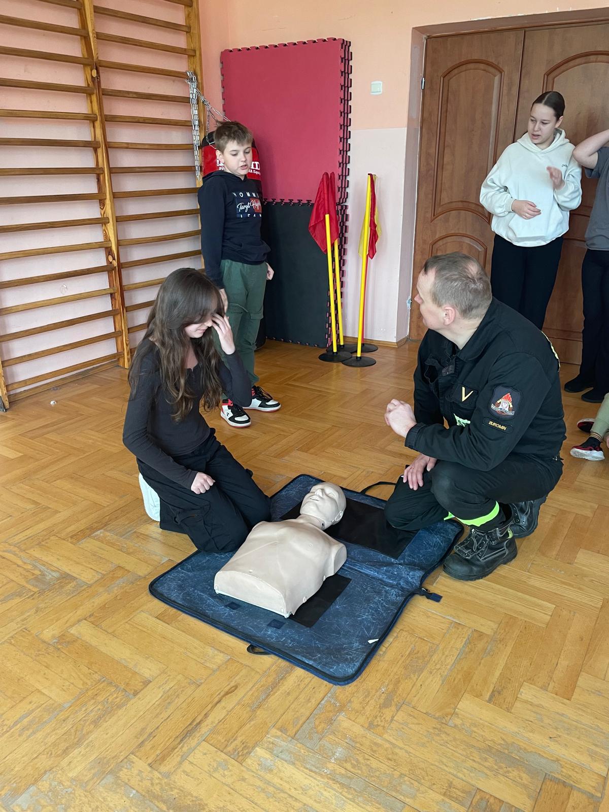 Strażacy zaprezentowali dzieciom z klas 1-8 podstawowe zasady udzielania kwalifikowanej pierwszej pomocy przy zdarzeniach, wymagających podjęcia jak najszybciej działań z zakresu pierwszej pomocy. Funkcjonariusze Państwowej Straży Pożarnej, szczegółowo zaprezentowali dzieciom jak ocenić stan osoby poszkodowanej i jeżeli zajdzie potrzeba prowadzić resuscytację krążeniowo-oddechową, przedstawili prawidłowe ułożenie osoby nieprzytomnej z zachowanym własnym oddechem w pozycji bezpiecznej oraz szereg innych zagadnień dotyczących pierwszej pomocy, których znajomość może uratować życie bądź zdrowie. Osoby chętne miały również okazję samodzielnie spróbować udzielania pierwszej pomocy z wykorzystaniem fantoma.