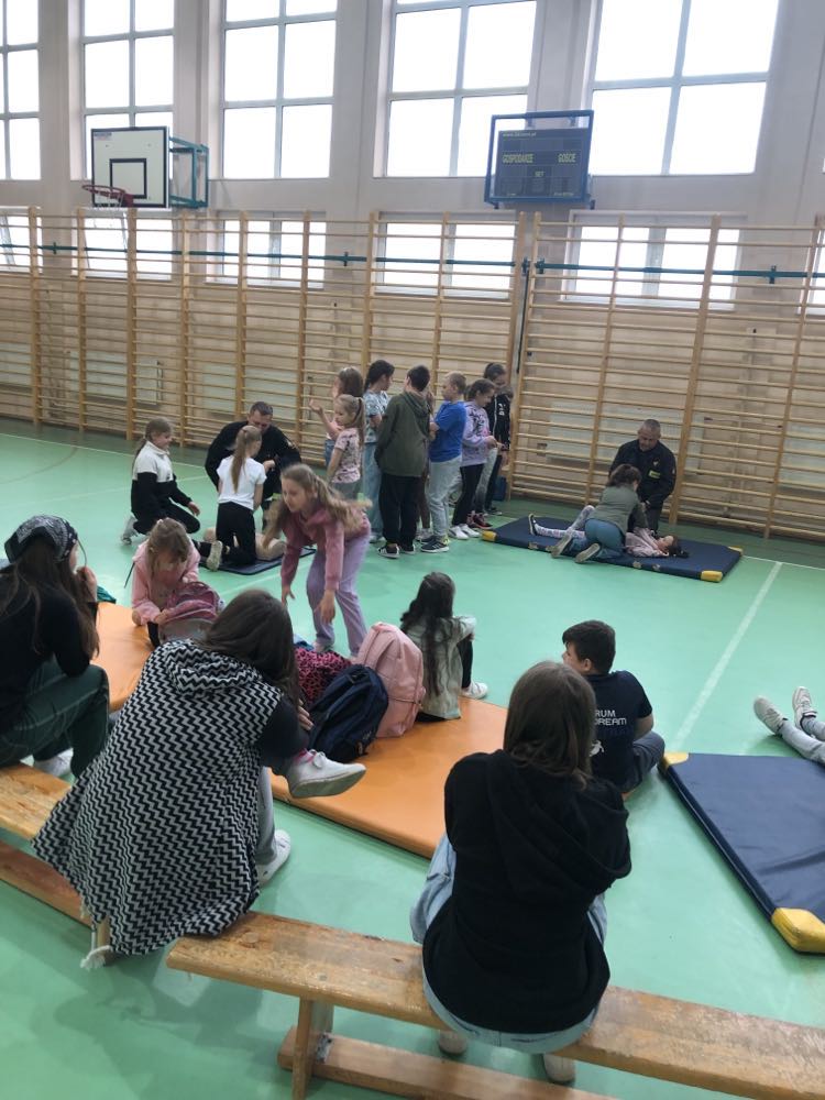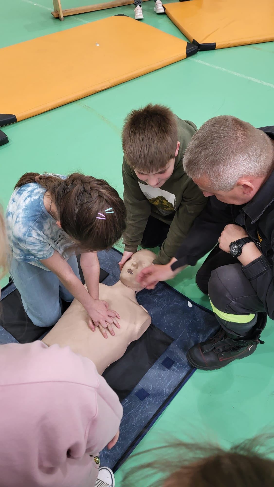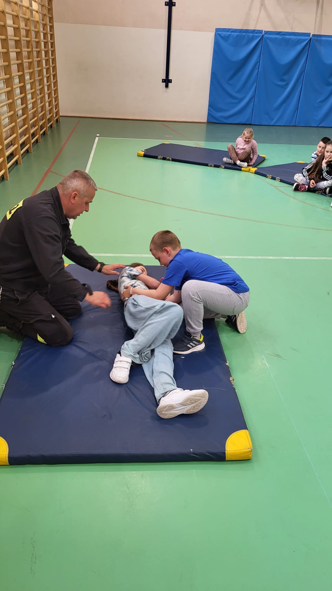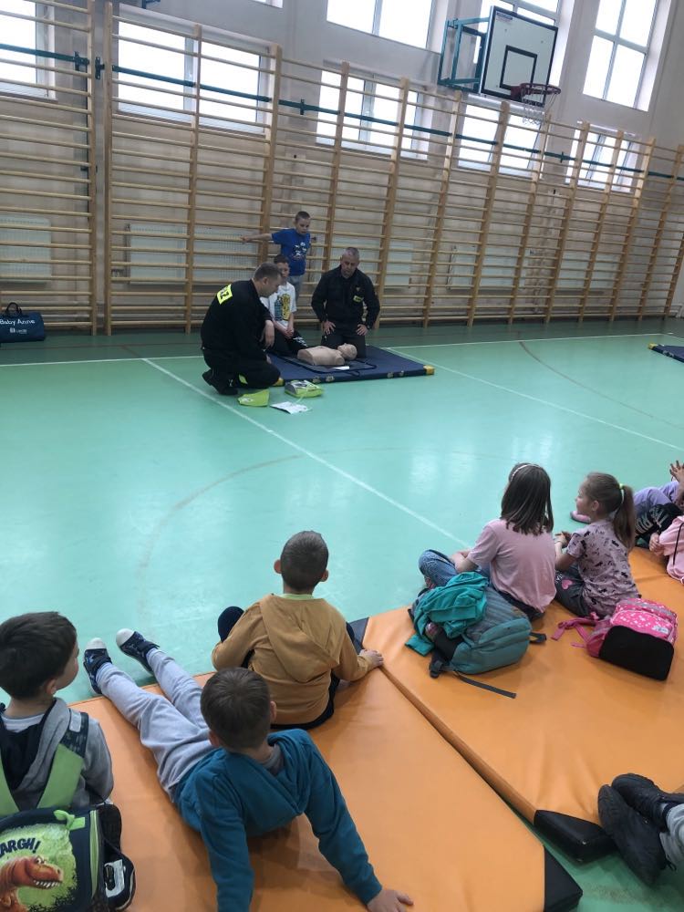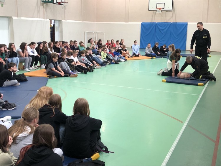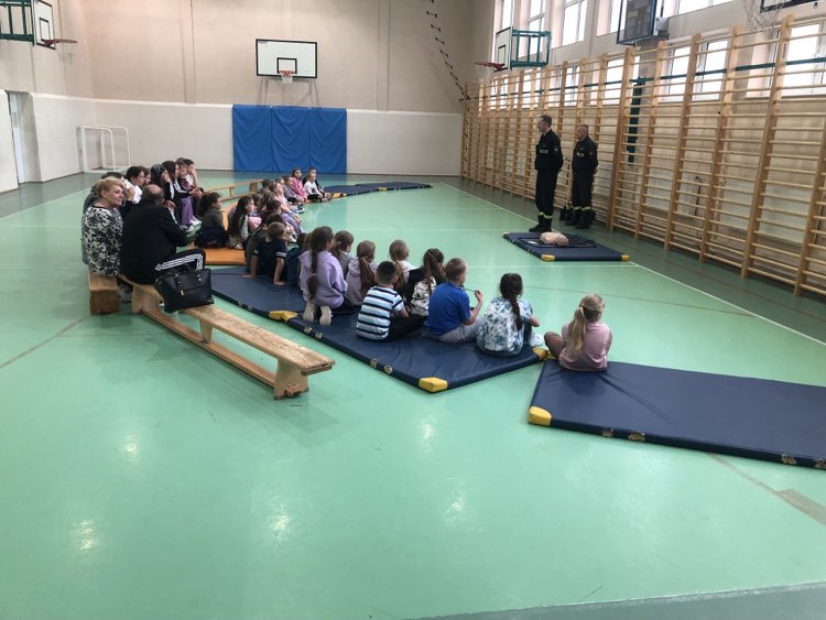 Strażacy zaprezentowali dzieciom z klas 1-8 podstawowe zasad udzielania kwalifikowanej pierwszej pomocy przy zdarzeniach, wymagających podjęcia jak najszybciej działań z zakresu pierwszej pomocy, ratujących niejednokrotnie zdrowie i życie. Funkcjonariusze Państwowej Straży Pożarnej, szczegółowo zaprezentowali dzieciom jak ocenić stan osoby poszkodowanej i jeżeli zajdzie potrzeba prowadzić resuscytację krążeniowo-oddechową, przedstawili prawidłowe ułożenie osoby nieprzytomnej z zachowanym własnym oddechem w pozycji bezpiecznej oraz szereg innych zagadnień dotyczących pierwszej pomocy, których znajomość może uratować życie bądź zdrowie. Osoby chętne miały również okazję samodzielnie spróbować udzielania pierwszej pomocy z wykorzystaniem fantoma. W dalszej części spotkania, w związku ze zbliżającym się czasem odpoczynku na łonie natury, w tym nad wodą, odbyła się pogadanka na temat bezpiecznego wypoczynku nad wodą oraz bezpiecznych zachowań w lesie.