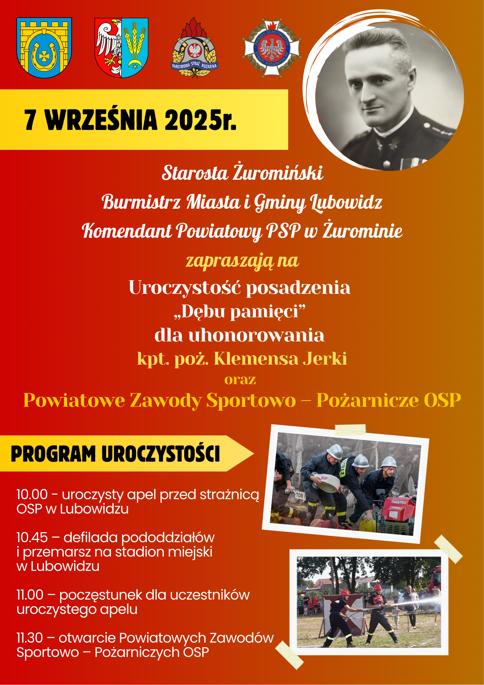 Starosta Żuromiński Pan Jerzy Rzymowski, Komendant Powiatowy PSP w Żurominie st. bryg. Zbigniew Kąpiński oraz Burmistrz Miasta i Gminy Lubowidz Pan Jarosław Czapliński mają zaszczyt zaprosić wszystkich zainteresowanych na uroczystość posadzenia „Dębu pamięci” dla uhonorowania kpt. poż. Klemensa Jerki, który urodził się i wychował na obecnych ziemiach powiatu żuromińskiego.