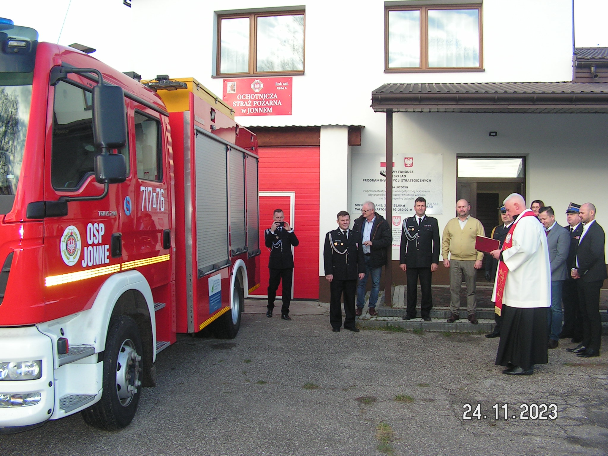 W dniu 24 listopada 2023 roku w strażnicy Ochotniczej Straży Pożarnej w Jonnem odbyła się uroczystość przekazania średniego samochodu ratowniczo – gaśniczego GBA 2,5/16 na podwoziu MAN TGM 15.290 z napędem 4x2.