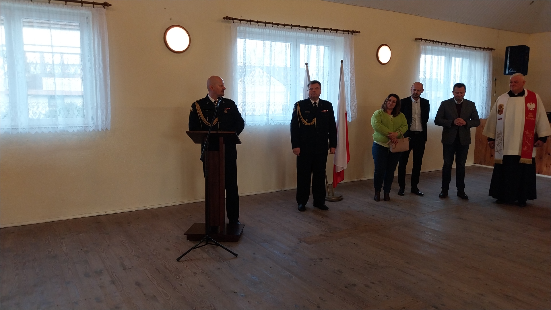 Uroczystość rozpoczęła się złożeniem meldunku Zastępy Mazowieckiego Komendanta Wojewódzkiego Państwowej Straży Pożarnej st. bryg. Tomaszowi Cybul. Po odegraniu hymnu, zaproszonych gości przywitał Wójt Gminy Lutocin Pan Jacek Kołodziejski.