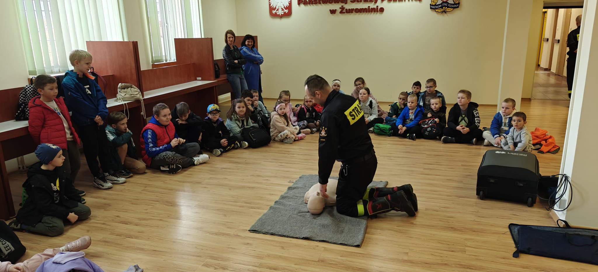 16 kwietnia 2025 roku na prośbę dyrekcji szkoły, odbyło się spotkanie strażaków Jednostki Ratowniczo - Gaśniczej w Żurominie z uczniami szkoły. Dzieci zwiedziły m.in. Stanowisko Kierowania Komendanta Powiatowego, gdzie dyżurny omówił zasady zachowania się podczas pożaru oraz sposoby zgłaszania zdarzeń na numery alarmowe służb ratunkowych. Korzystając z okazji zaprezentowano dzieciom zasady udzielania pierwszej pomocy, a następnie osoby chętne miały okazję spróbować swoich sił w prowadzeniu resuscytacji na przygotowanym fantomie. Następnie funkcjonariusze przeprowadzili dla dzieci pokaz sprzętu ratowniczo – gaśniczego znajdującego się na wyposażeniu pojazdów pożarniczych i opowiedzieli o pracy strażaka. Spotkania z dziećmi i ich wychowawcami są świetną okazją dla Państwowej Straży Pożarnej do promowania i uczenia Naszych młodych mieszkańców bezpiecznych zachowań oraz utrwalania w ich świadomości zagrożeń jakie czyhają w życiu codziennym.
