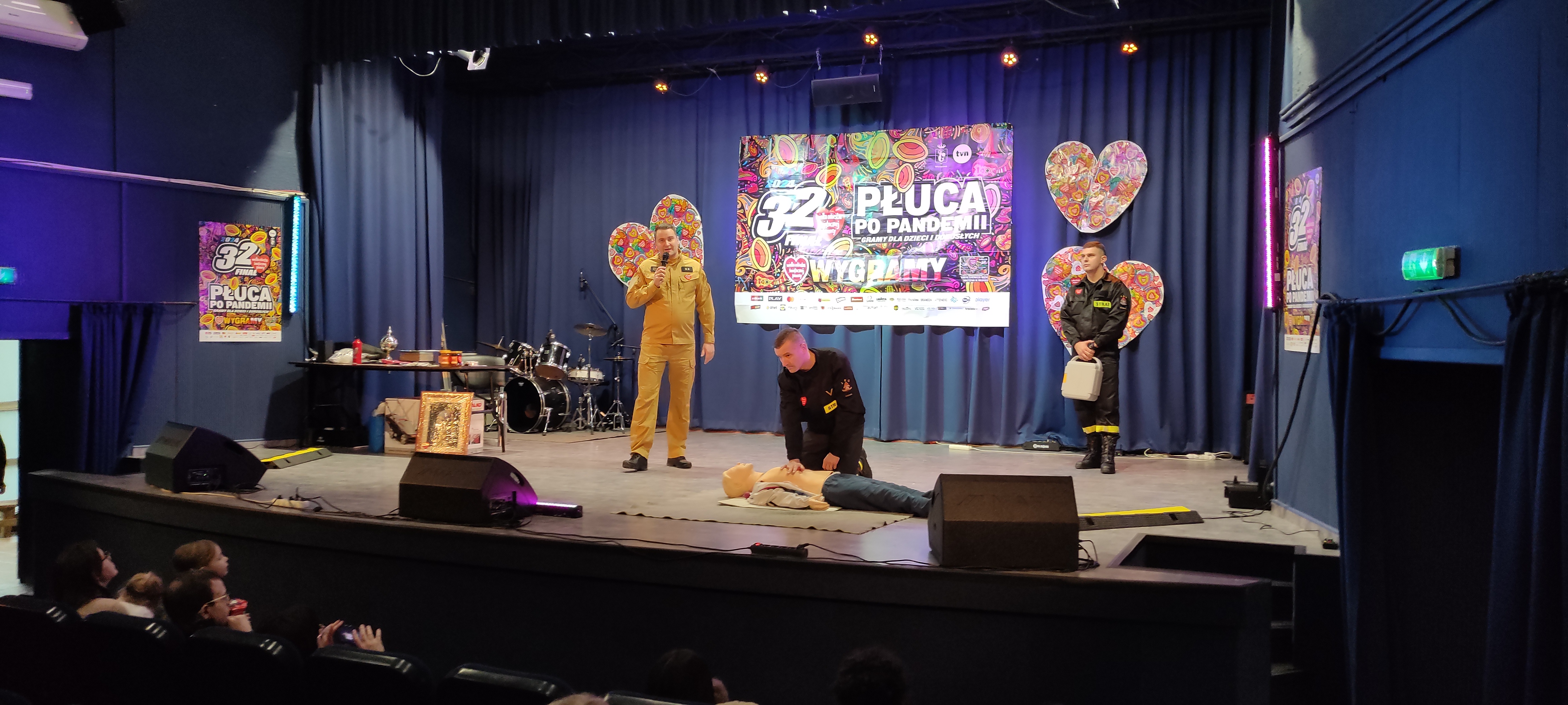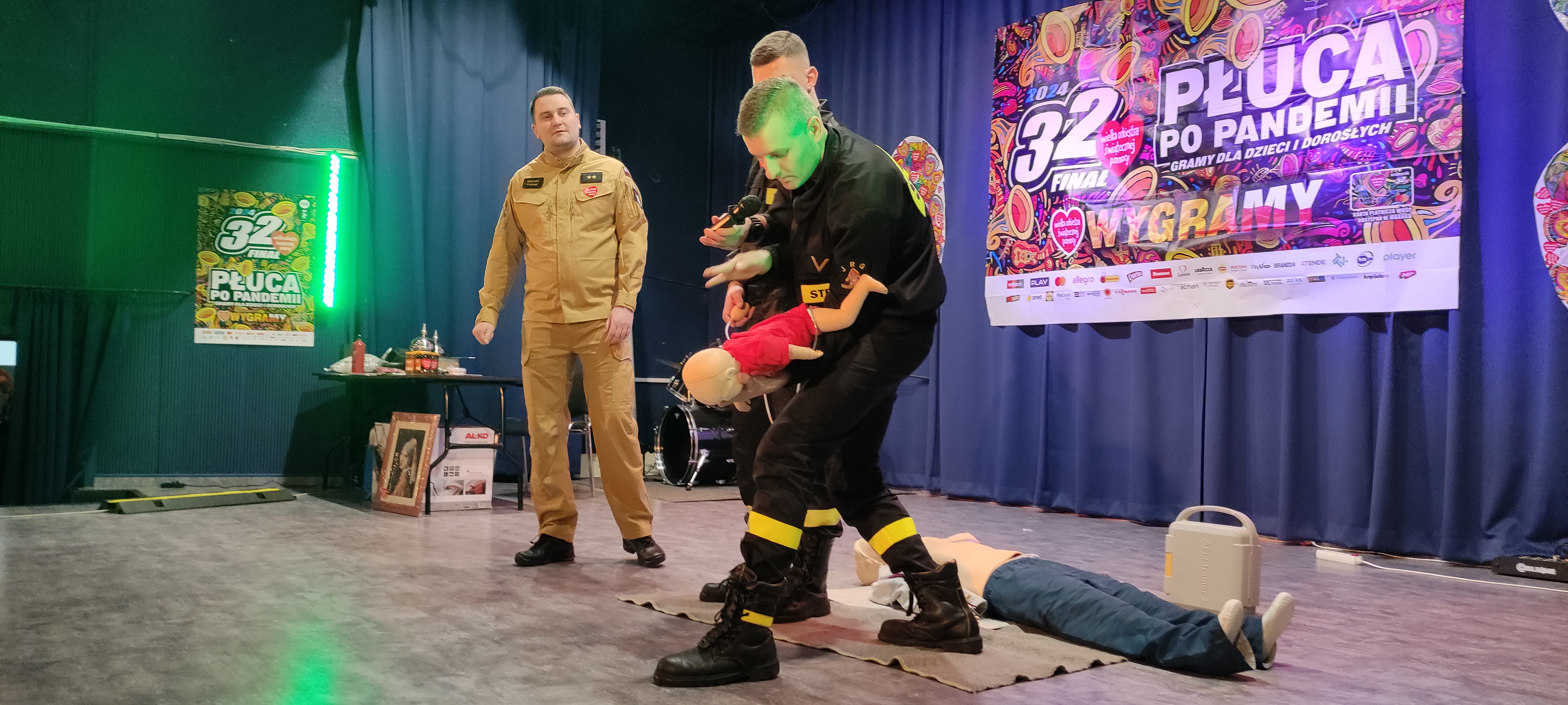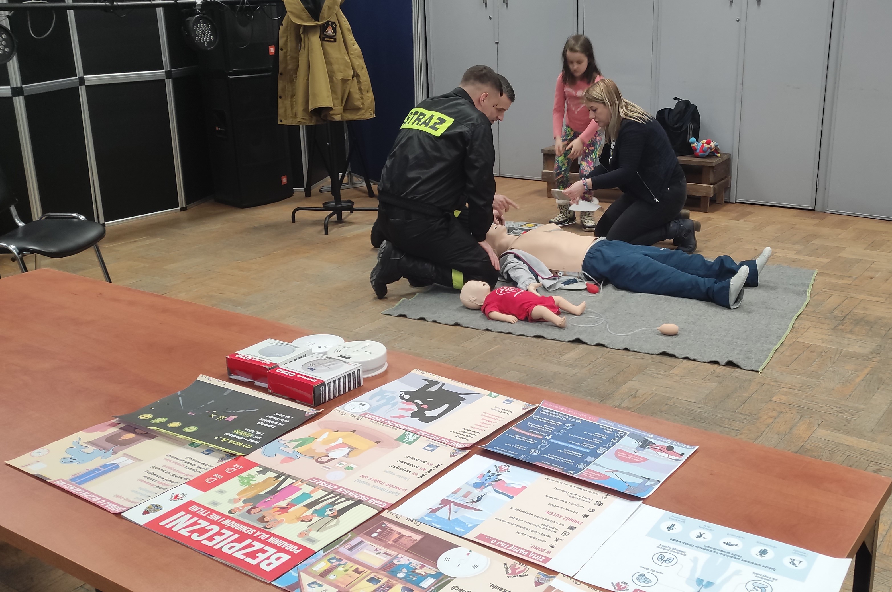 Promując bezpieczeństwo i udzielanie pierwszej pomocy, strażacy zaprezentowali na scenie podstawowe zasady udzielania pierwszej pomocy, w tym prowadzenie resuscytacji krążeniowo – oddechowej u dorosłych, dzieci i niemowląt wykorzystując do tego niedawno zakupione fantomy, a także postępowanie przy zadławieniach. Funkcjonariusze KP PSP Żuromin omówili również zasady udzielania pierwszej pomocy przy użyciu automatycznego defibrylatora (AED), urządzenia te w ostatnim czasie zostały zamontowane na kilku obiektach na terenie miasta Żuromin, a omówienie zasad działania tego urządzenia miało na celu uświadomienie mieszkańców jak dużą zaletą jest stosowanie AED przy zatrzymaniu krążenia. Po prelekcji na scenie była możliwość spróbowania sił pod okiem strażaków.