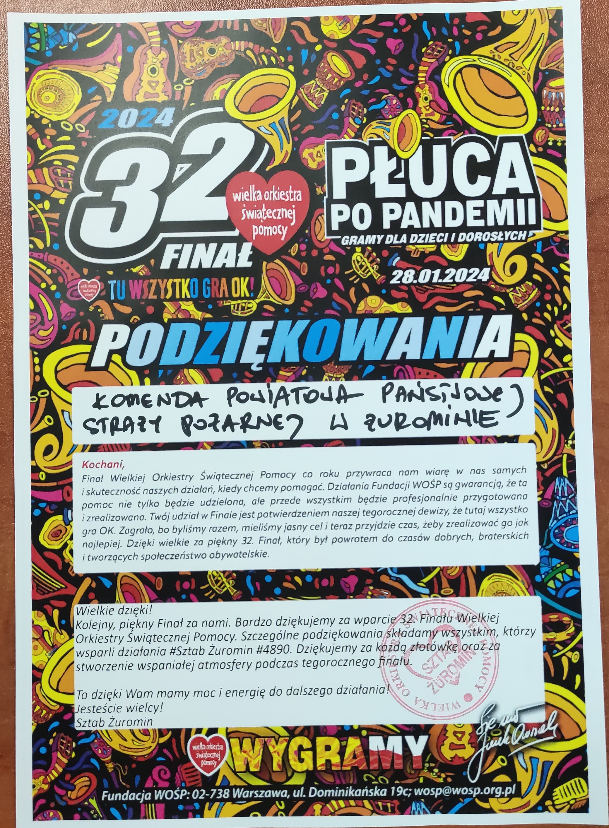 28 stycznia 2024 roku w całej Polsce, tak i w Żuromińskim Centrum Kultury odbył się 32 Finał Wielkiej Orkiestry Świątecznej Pomocy. W finale WOŚP udział wzięli funkcjonariusze żuromińskiej komendy oraz druhowie OSP Sarnowo.