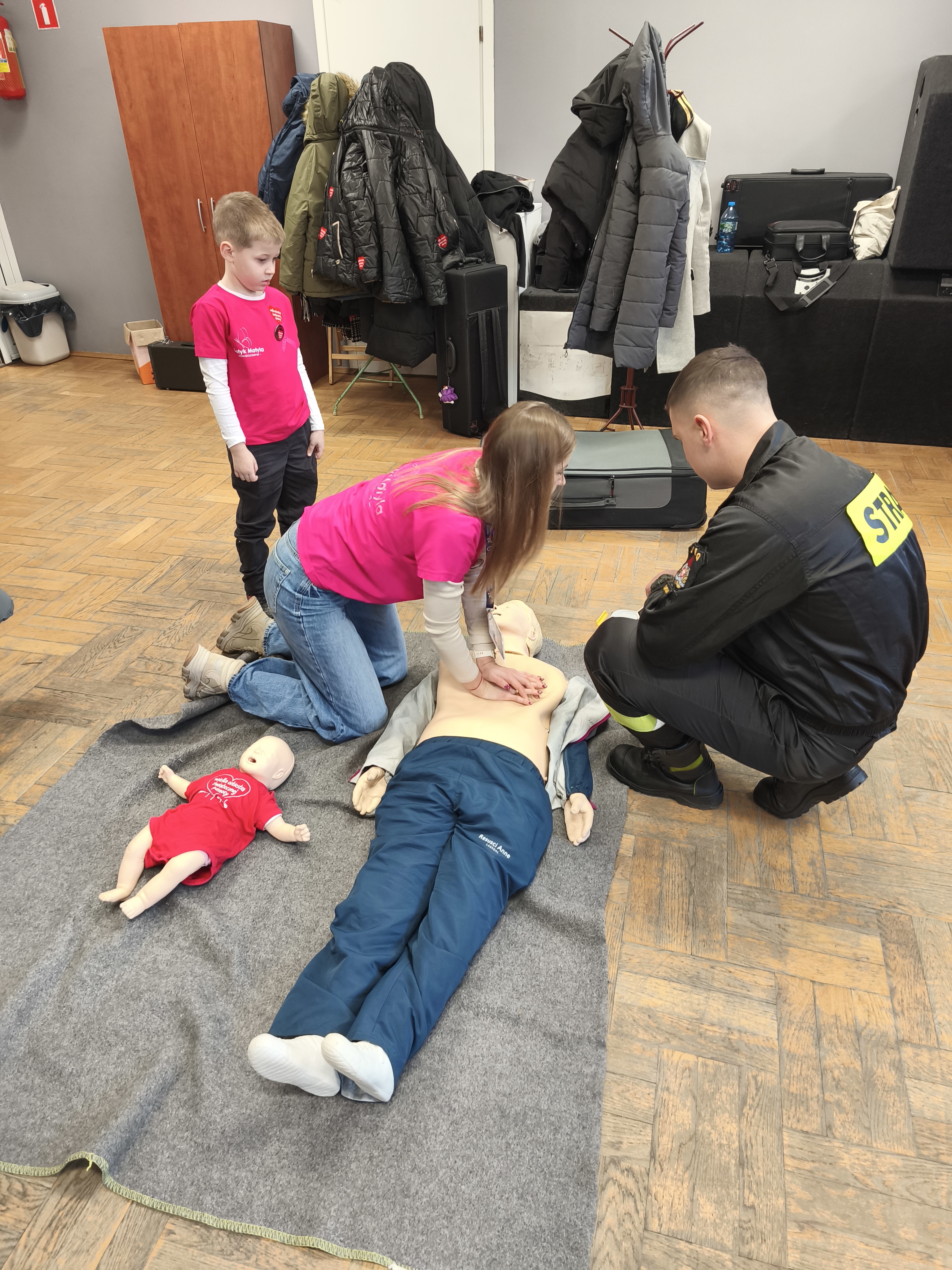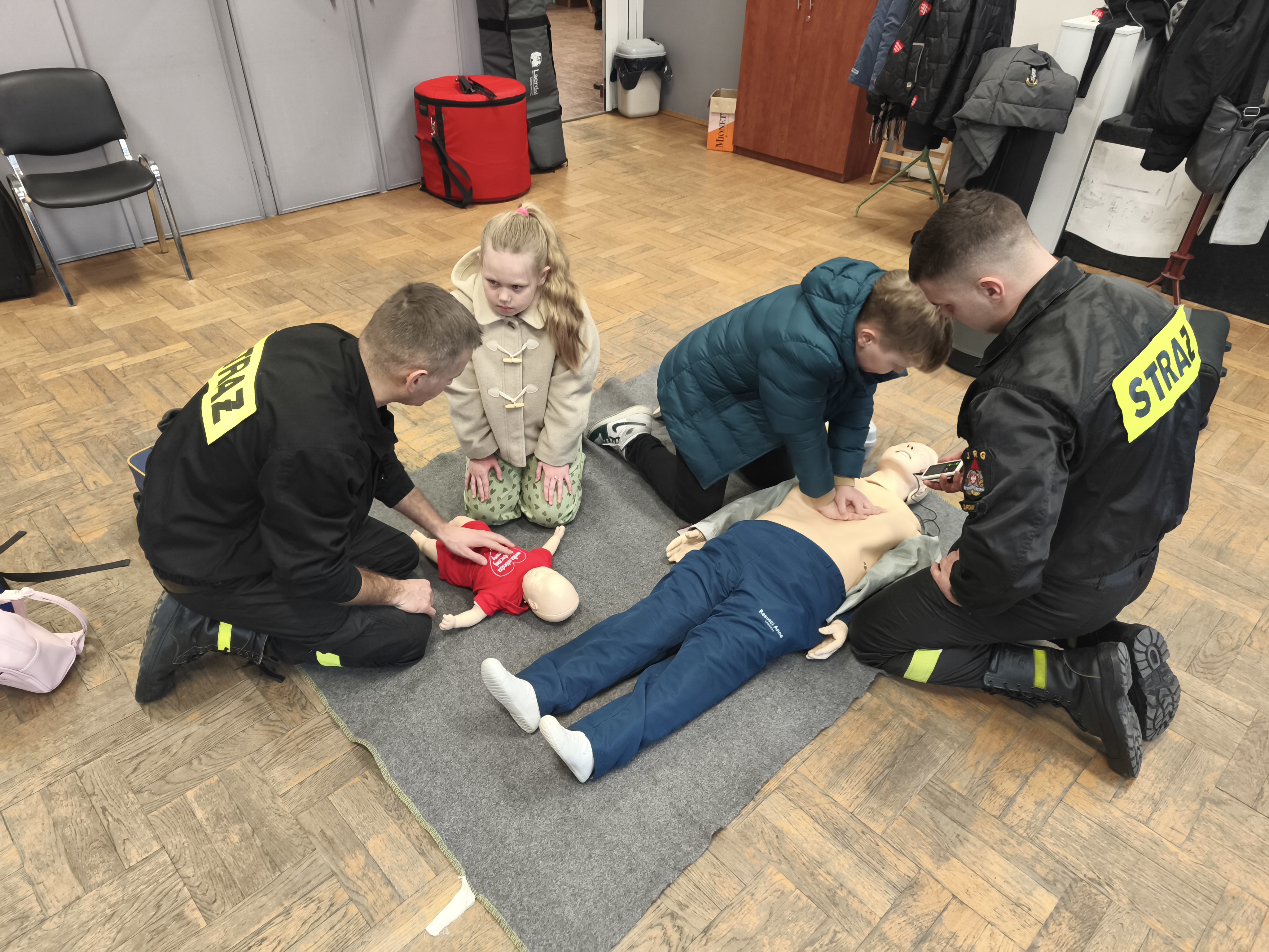 Promując bezpieczeństwo i udzielanie pierwszej pomocy, strażacy prezentowali podstawowe zasady udzielania pierwszej pomocy, w tym prowadzenie resuscytacji krążeniowo – oddechowej u dorosłych, dzieci i niemowląt wykorzystując do tego posiadane fantomy. Omówiono zasady udzielania pierwszej pomocy przy użyciu automatycznego defibrylatora (AED), ponieważ urządzenia tego typu w ostatnim czasie zostały zamontowane na kilkunastu obiektach na terenie powiatu, a omówienie zasad działania AED miało na celu uświadomienie mieszkańców jak dużą zaletą jest stosowanie tego urządzenia u osób z zatrzymanym krążeniem. Z pomocą ulotek informacyjnych promowano zasadność i możliwe miejsca instalowania w budynkach mieszkalnych czujek dymu i czadu.